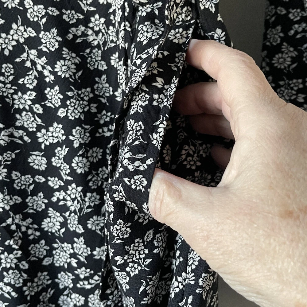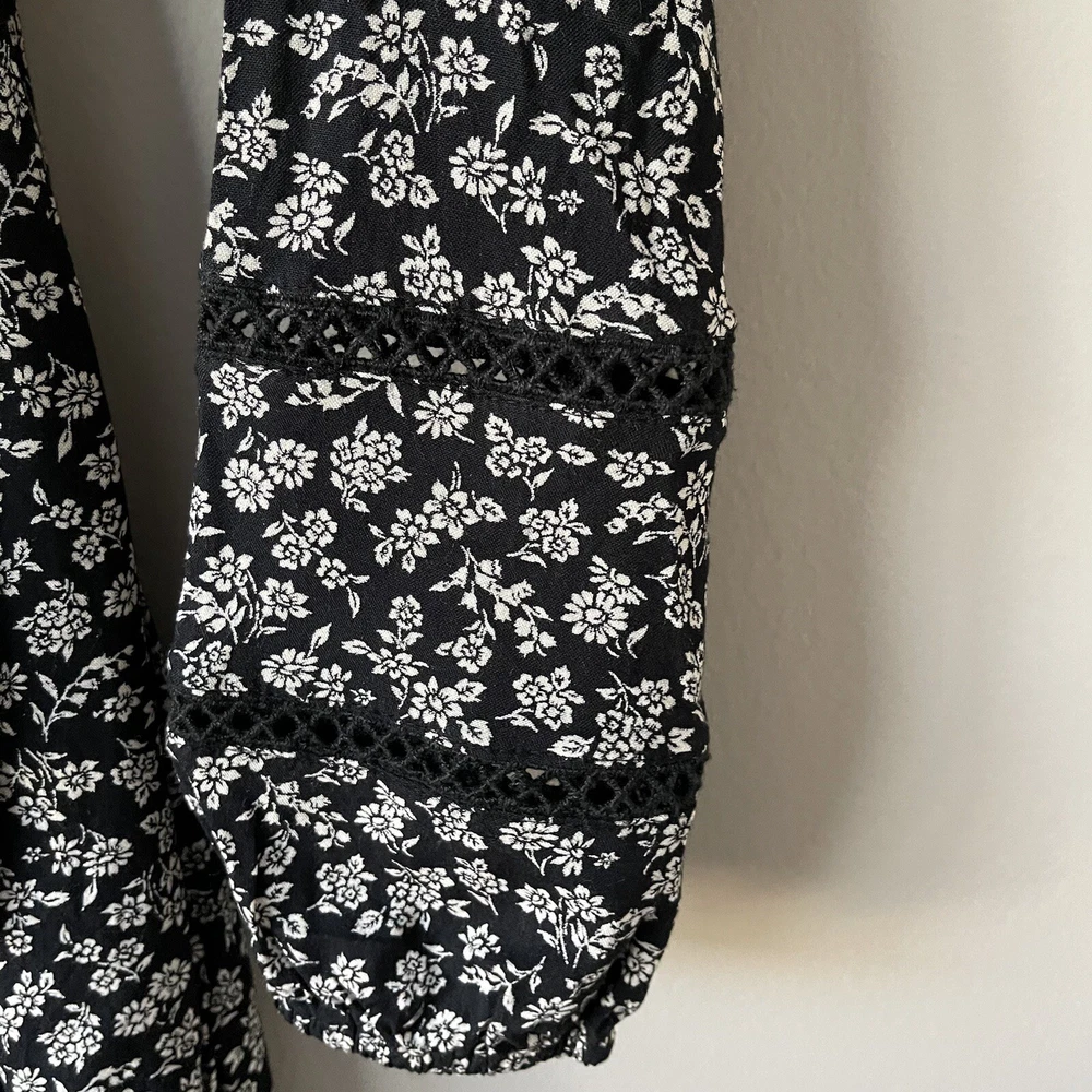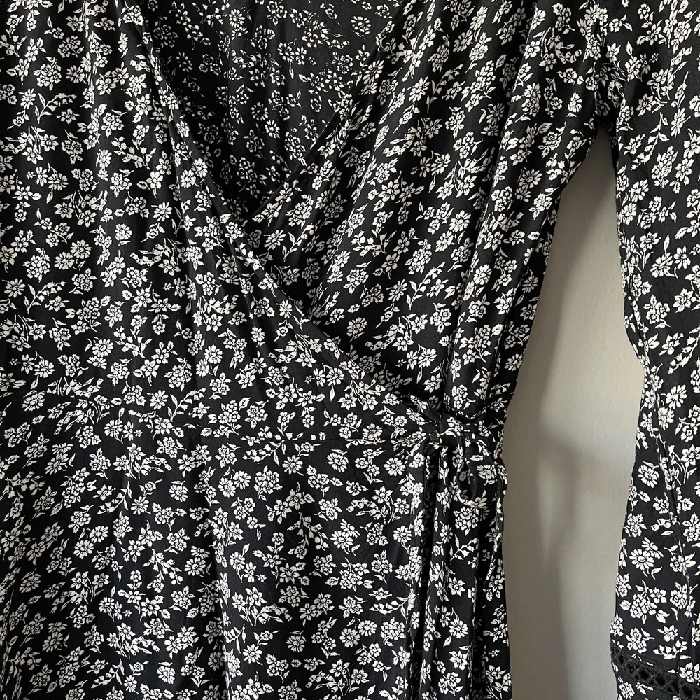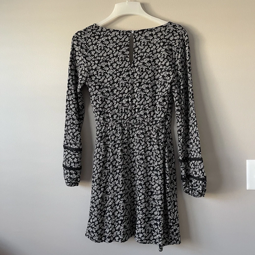 An adorable Hollister Black and White Floral Print Long Sleeve Wrap Dress Size Medium Very Good Condition Side Zip Crochet trim on sleeves Keyhole opening at center back We ship within 3 days, usually sooner. Items are stored in a smoke-free, pet-free home. If you have questions, feel free to contact us through Ebay. Thank you for shopping with us! Have a great day!! Measurements: 18" - Underarm to underarm 32" Back from neck to bottom of hem 19" Sleeve from arm pit to bottom of sleeve hem