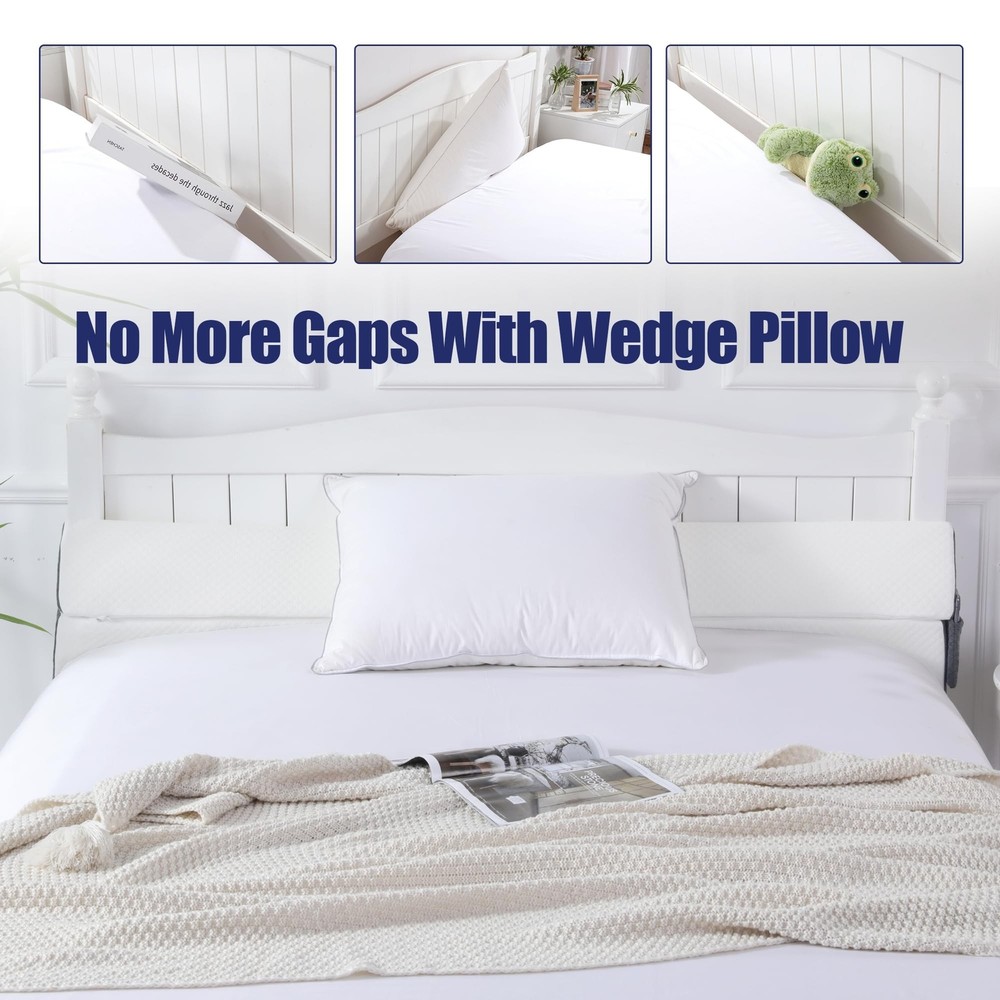 HOMBYS Pillow Wedge for Headboard Gap,Mattress Wedge Gap Filler Full Size,Bed Crack Pillow,Foam Bed Gap Filler,Multifuctional Headboard Space Filler with Side Pocket,Fill The Gap (0-7") Product Details Size: Full(54x6.3x6 in) Color: White & Grey Brand: HOMBYS MPN: PJCFTCW UPC: Does not apply EAN: Does not apply Brand: HOMBYS Special Feature: Foldable Color: White & Grey Size: Full(54x6.3x6 in) Fill Material: Memory Foam Brand: HOMBYS Special Feature: Foldable Color: White & Grey Size: Full(54x6.3x6 in) Fill Material: Memory Foam Shape: Rectangular, Wedge Age Range (Description): Adult Recommended Uses For Product: Sleeping Use for: Whole Body Material: Foam, Memory Foam Item Firmness Description: Soft Product Care Instructions: Machine Wash Number of Pieces: 1 Pattern: Solid Material Feature: Breathable Fabric Type: 100% Polyester Model Name: Wedge Pillow Headboard for Bed Gap Manufacturer: HOMBYS Product Dimensions: 54"L x 6.3"W Unit Count: 1.0 Count Item Weight: 2.89 pounds Country of Origin: China Item model number: PJCFTCW Date First Available: March 21, 2024 Close 0- 7 inch gap:Our engineers optimized and upgraded the gap filler to a folding type according to our customers' needs, making it suitable for most beds. Roommate's Bed Gap Pillow is perfect for your headboard and mattress, preventing objects from slipping off the bed and reducing noise. When the Mattress Wedge Gap Filler becomes rectangular, it fills gaps from 0 to 7 inches wide. No more bending over to look under the bed for fallen objects! PERFECT BED PILLOW COMPANIONS - Uniquely designed mattress gap filler is adjustable for freestyle gap filling, and the triangles on the wedge pillow can be flipped into a rectangular pillow. Cover the space between the bed and the wall or add a cover to fit exactly what you expect. HIGH DENSITY PREMIUM FOAM The HOMBYS Wedge Pillow Plug is made of 25d high density memory foam, which provides superior durability and support without collapsing. As a result, our bed wedge pillow plugs are sturdy enough to block seams and prevent the pillow from slipping. Even after prolonged use, the wedge sleep pillow will not lose its shape or support due to compression. Removable Cover- The headboard pillow is made of skin-friendly and breathable fabric, odorless, soft and silky. Zipper design allows you to remove the pillowcase for replacement and cleaning. Machine washable, no pilling for long time use. Fully Unfolded in 48 Hours - Compressed for optimal transportation. The headboard pillow will keep its shape for a long time without deforming. Meanwhile, it is soft enough to be used as a cozy headboard cushion on your bed.