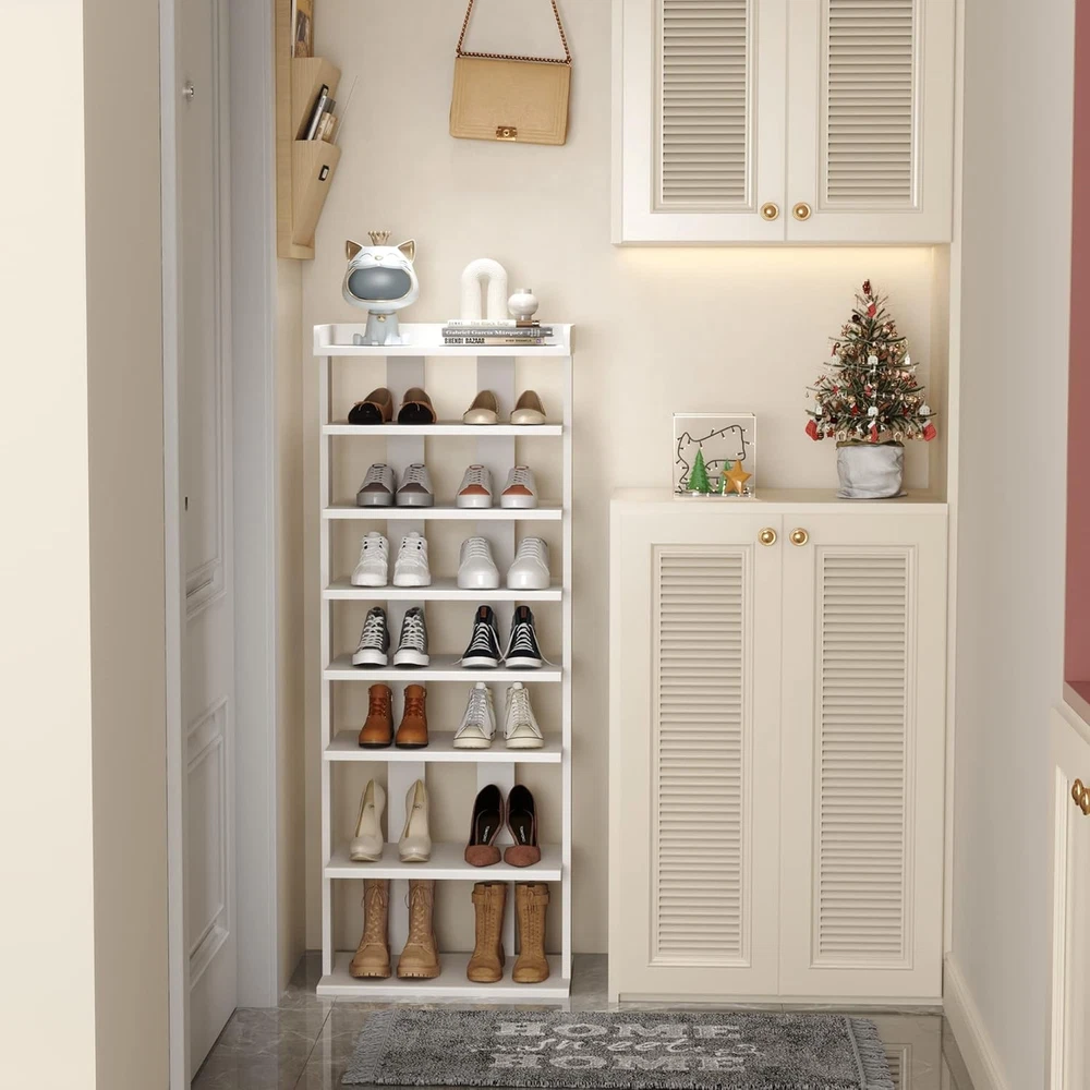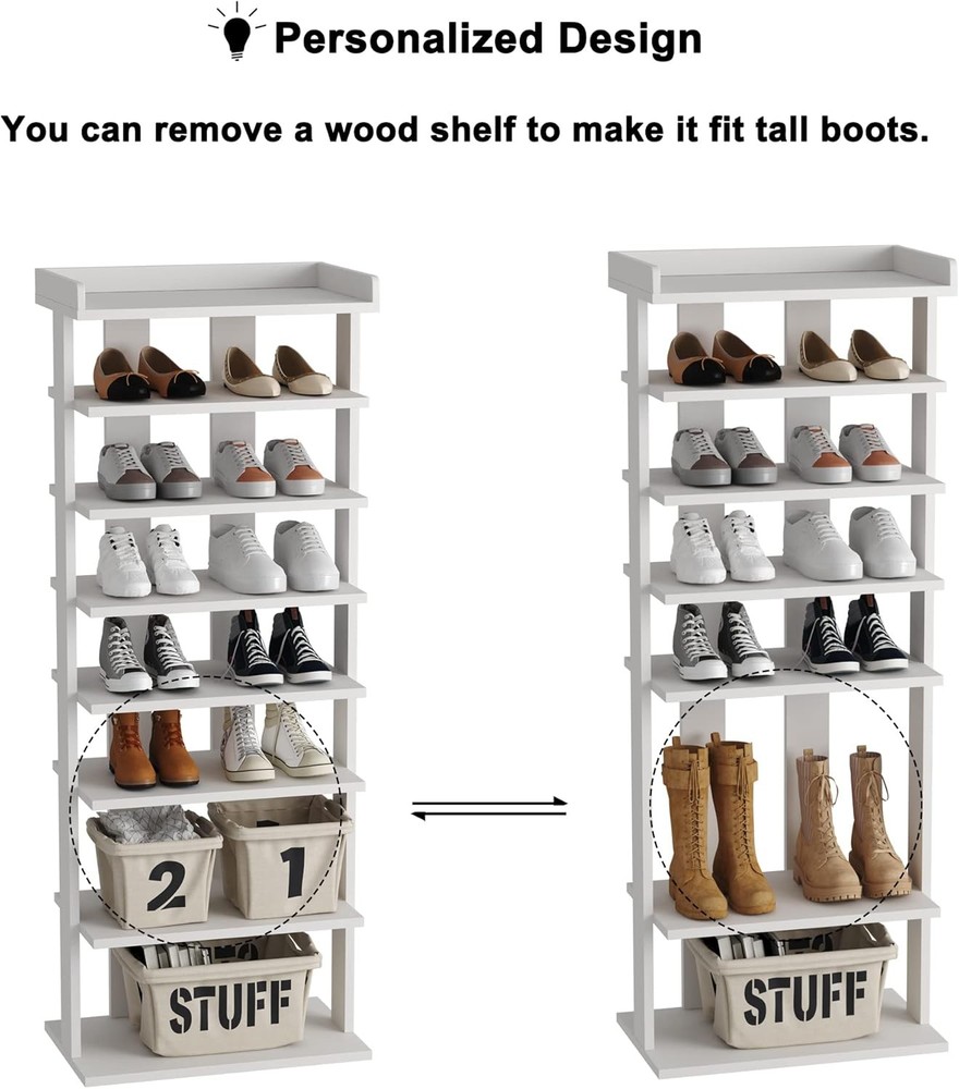 HOMEFORT 7-Tier Wood Shoe Rack, Double 11"Dx18"Wx45.1"H, White Product Details Room Type: Entryway,Living Room,Bedroom,Closet Number of Shelves: 7 Special Feature: Space Saving Product Dimensions: 11.02"D x 18"W x 45.07"H Style: Modern Age Range (Description): All Finish Type: Wood Brand: HOMEFORT Product Care Instructions: Wipe with Dry Cloth Size: 11"Dx18"Wx45.1"H Weight Limit: 11 Pounds Assembly Required: Yes Recommended Uses For Product: Shoe Number of Items: 1 Manufacturer: HOMEFORT Included Components: Assembly Hardware Item Weight: 19.8 Pounds Furniture Finish: White Installation Type: Freestanding Min. Required Door Width: 45.07 Inches Weight capacity: Maximum weight: 11 Pounds Back Style: Backless Specific Uses For Product: Shoes Unit Count: 1.0 Count Shelf Thickness: 12 Millimeters Item Weight: 19.8 pounds Item model number: PG-01SR571A-2WPN03 MaterialMounting Type: Engineered WoodFloor Mount Shelf TypeShape: Tiered ShelfRectangular Maximize the Vertical Storage Space for Small Corners: The dimension of 18" W x 11.02" D x45.07" H makes it a perfect size for a tiny front door, walk-in closet, and entryway. You can also omit shelves to fit specific shoes and boots according to your demand. 7 Open Shelves to Organize and De-clutter: Double rows of seven open shelves provide ample storage space for shoes in an organized way to make shoes clear at a glance. It fits most shoes and is easy to clean, such as boots, high heels, and sneakers. Sturdy and Compact Shoe Organizer: Made of wood, this shoe tower is durable and sturdier for long-term use. Unlike the rigid metal shoe racks, this one is specially designed with a look of wood accent to be stylish and natural enough to suit any home decoration. Tall Shoe Shelf with Different Height: Designed with different heights of shelves, the bottom two layers are 7.48" high, perfect for high heels. The top 5 shelves are 4.72" tall, making it suitable for flat shoes, slippers, sneakers, etc. Item Weight:19.8lbs. Easy and Quick to Assemble: With clearly labeled assembly parts and well-illustrated instructions, this wooden 7-tier shoe rack is quick to assemble.