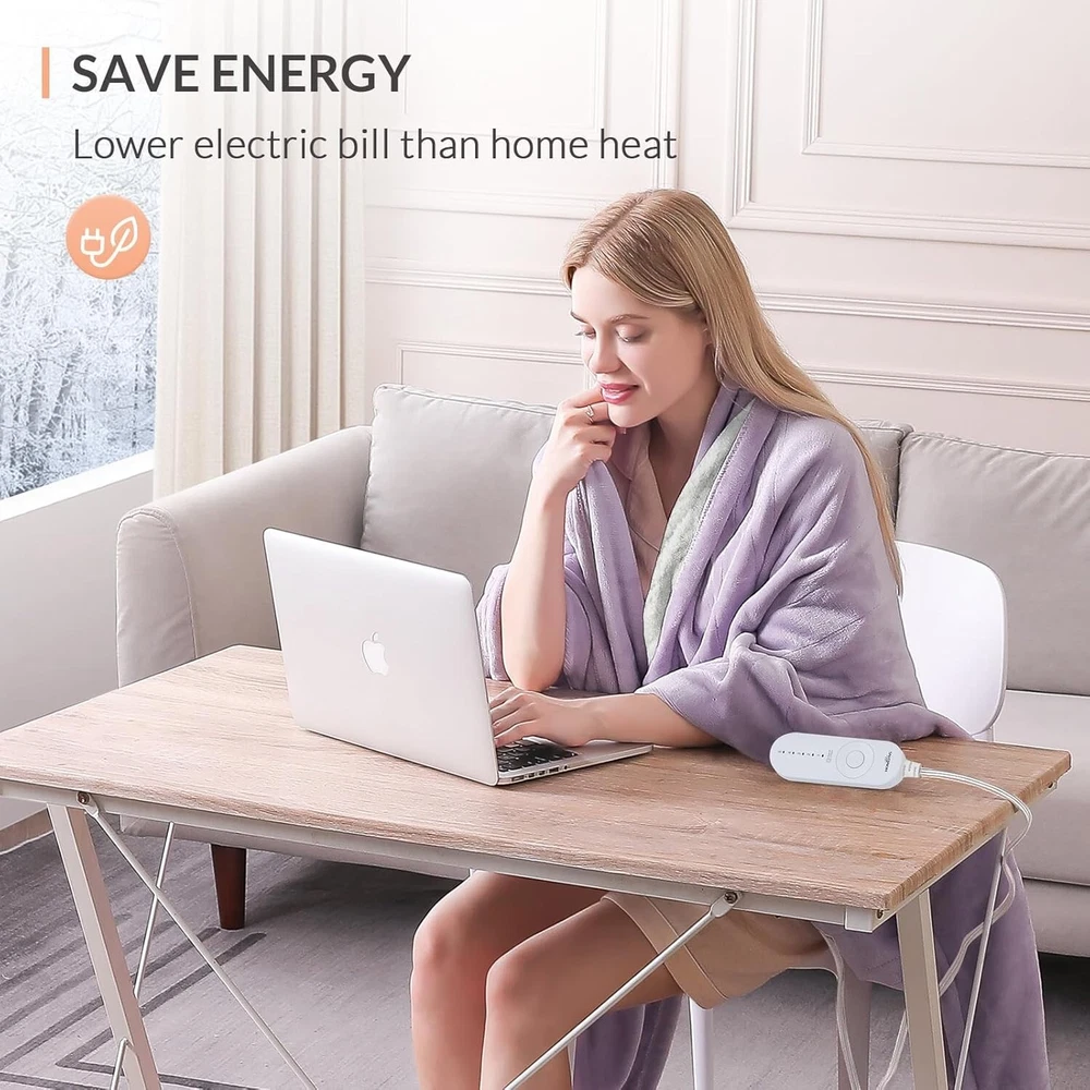About this item Flannel and Sherpa Easy to Control : Customize your warmth with 5 heat settings from 86℉ to 115℉ for a peaceful night's sleep. Safe : Equipped with Japanese-imported heating wires and ETL certification, it features a 3-hour auto shut-off function to prevent overheating. Therapeutic Heat Relief : Crafted from premium flannel and Sherpa, it offers softness and warmth, enhancing circulation and soothing muscles. Versatile : With an 8.5ft cord, enjoy flexibility on the couch, in bed, or at the office. Energy Efficient : This eco-friendly blanket provides warmth comparable to space heaters with minimal energy use, making it cost-effective and cozy.