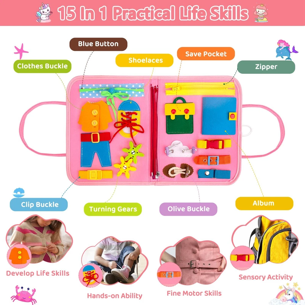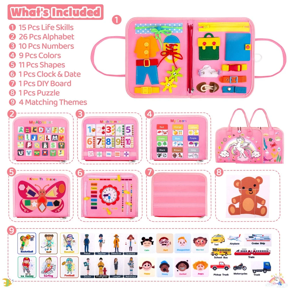 HONGDDY Busy Board Montessori Toys for Toddler, Sensory Board Toy for Learning Fine Motor Skills Quiet Book Travel Toys Educational Plane Travel Activity for Girls & Boys Gifts 【Montessori Toys for Toddlers】- Approved Montessori method, HONGDDY busy board is designed to occupy and entertain your children. A superb toy for your toddler to explore by themselves! It is one of the most perfect Montessori toys for toddlers! 【35 in 1 Sensory Board】- The sensory board offers 35 elements (shoe laces, gears, clock, zippers, buckles, buttons, snap pocket, insert, etc.) with a set of letters from A to Z, shape and 1-10 number, clock dates, colors, shapes, jigsaw puzzle DIY board. The Sensory Board can simulate essential real-life scenes and help your kids to develop basic skills. 【Preschool Learning Toys】- Montessori board for toddlers can improve fine motor skills, strengthen hand-eye coordination, and develop creative and critical thinking through play. It is an ideal bag for learning colors, shapes and numbers. In addition, the montessori toy can also enhance children's dignity and confidence by solving problems while playing. 【Lightweight and Portable】- Hongddy sensory board is made from non-toxic soft fabrics and felts. The busy educational board measures 14 × 11 inch and weights 10.6 oz. Thanks to its light and compact design, it is very easy to carry and use the Montessori toys in the car or on the plane for children. This Montessori board is a great choice for travel toy and toddler activities. 【Gift for Kids】- This activity board contains many patterns that girls like, including different shapes of unicorns. Exquisite pattern and excellent workmanship make it a perfect gift for Birthday, party and Christmas! This All-IN-ONE HONGDDY Busy Board Toy includes 35 engaging activities for your child’s development! Items includs Buckles, belts, and straps Pulley System Shoelace Clock Gears Set Of shapes, ABC's, and 123's Toy Pieces And Much More! Benefits of the HONGDDY Busy Board: Fine-tuning sensory/motor skills Developing hand-eye coordination Ideal for travel Keep your child focused, entertained, and challenged Fun parent-child interaction activity! Shipping We offer FREE shipping on all orders! We use a selection of shipping services such as UPS, FedEx, USPS etc. We only ship to the lower 48 states, no APO/FPO addresses or PO Boxes allowed. Local pickups and combined shipping options are not provided at this time. Return You can return a product for up to 30 days from the date you purchased it. Any product you return must be in the same condition you received it and in the original packaging. Please keep the receipt. Payment We accept payment by any of the following methods: PayPal Please pay as soon as possible after winning an auction, as that will allow us to post your item to you sooner! Feedback Customer satisfaction is very important to us. If you have any problem with your order, please contact us and we will do our best to make you satisfied. Contact Us If you have any queries, please contact us via ebay. We usually respond within 24 hours on weekdays. Please visit our eBay store to check out other items for sale! Thank you for shopping at our store.