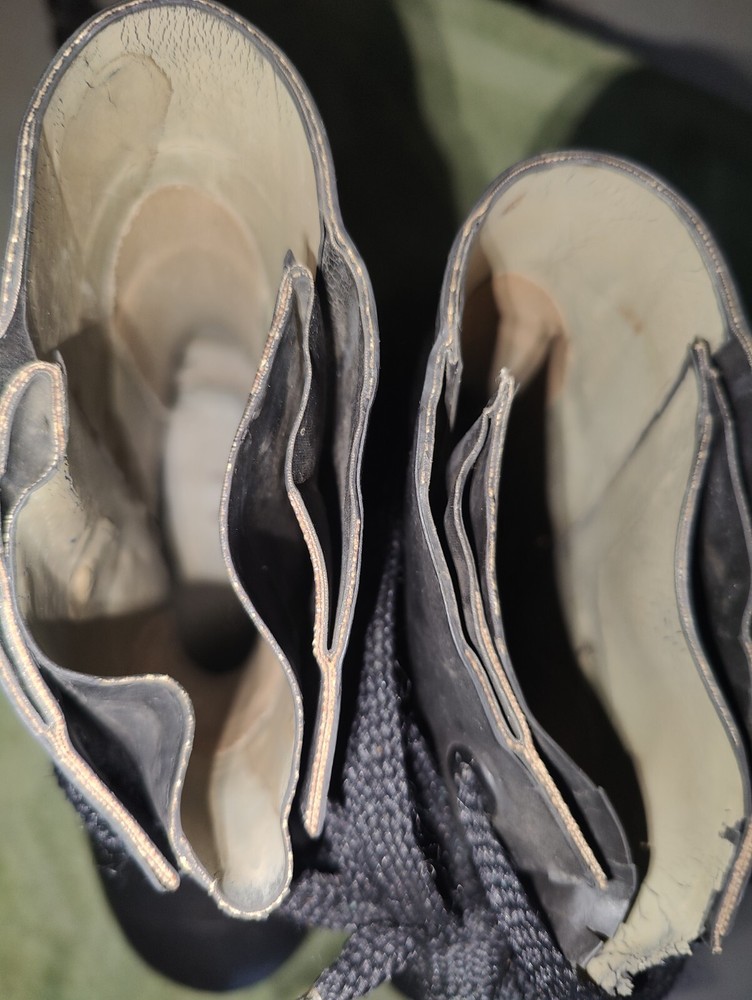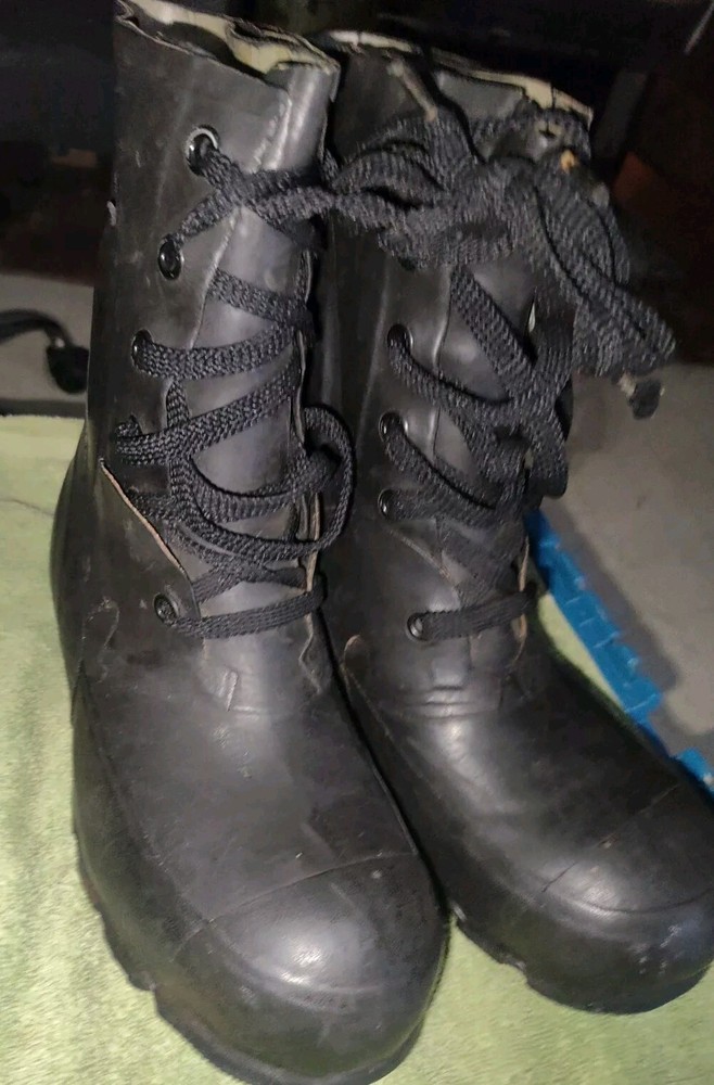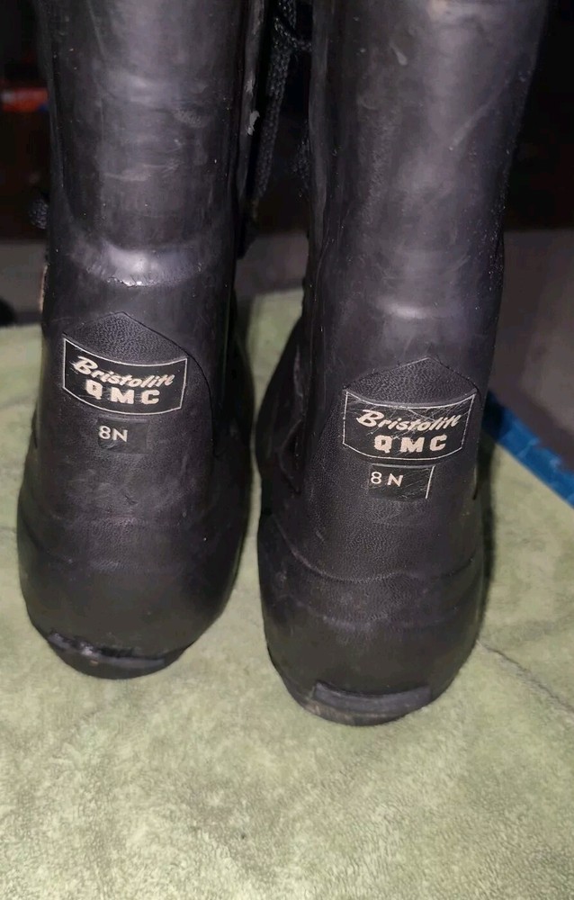Black Hood QMC Boots in men's size 8N feature a round toe and are designed for extreme Arctic cold weather. These vintage Mickey Mouse boots have a rubber outsole and upper material, ideal for winter season wear. The military-style boots are branded by Hood QMC and offer a unique and practical option for harsh weather conditions.