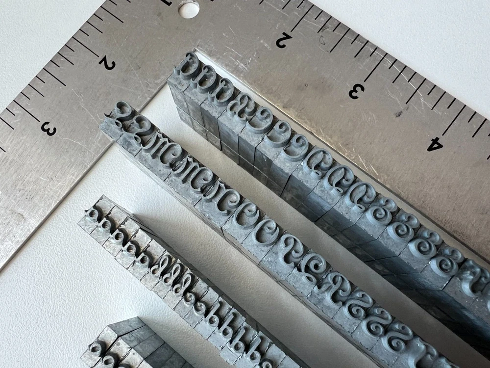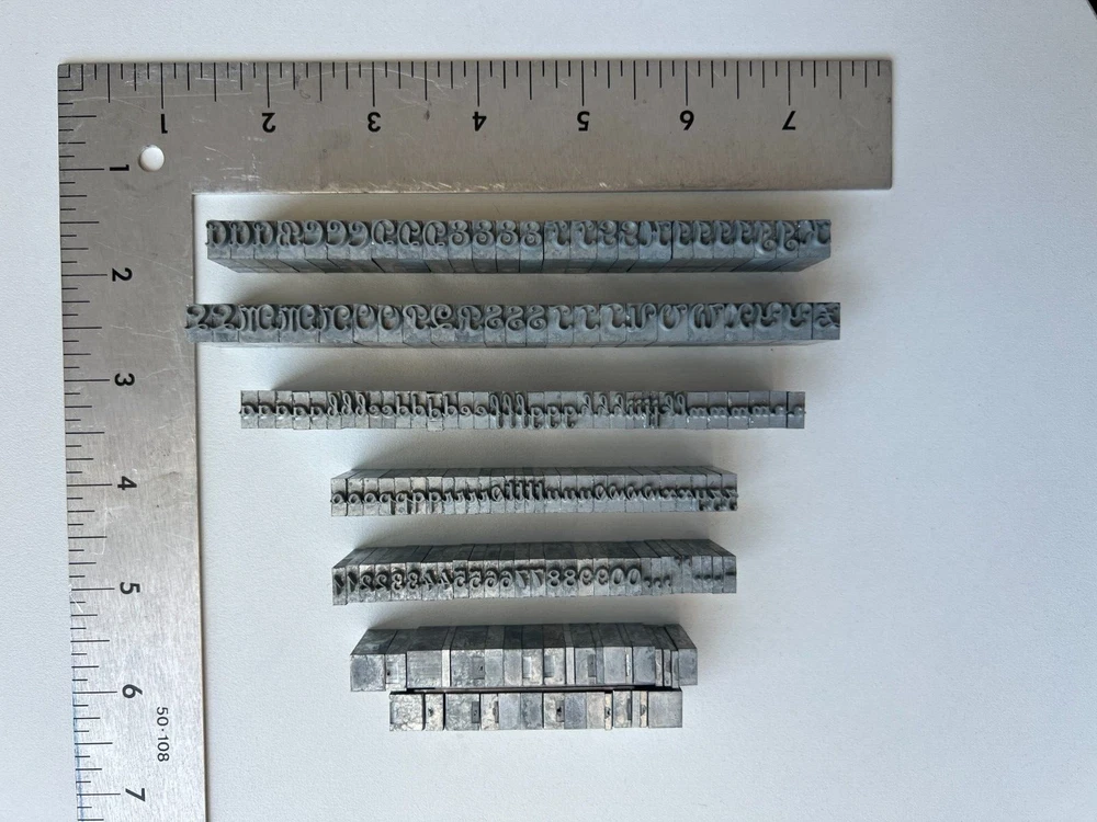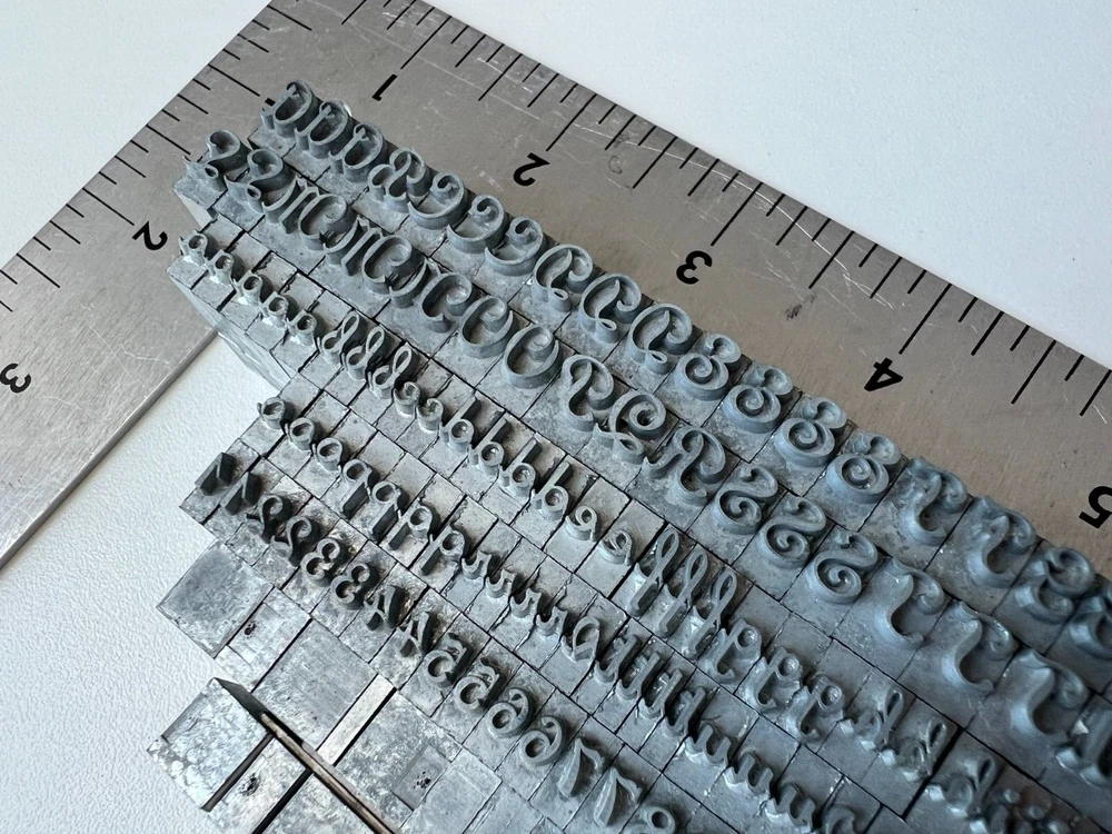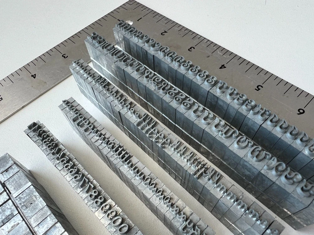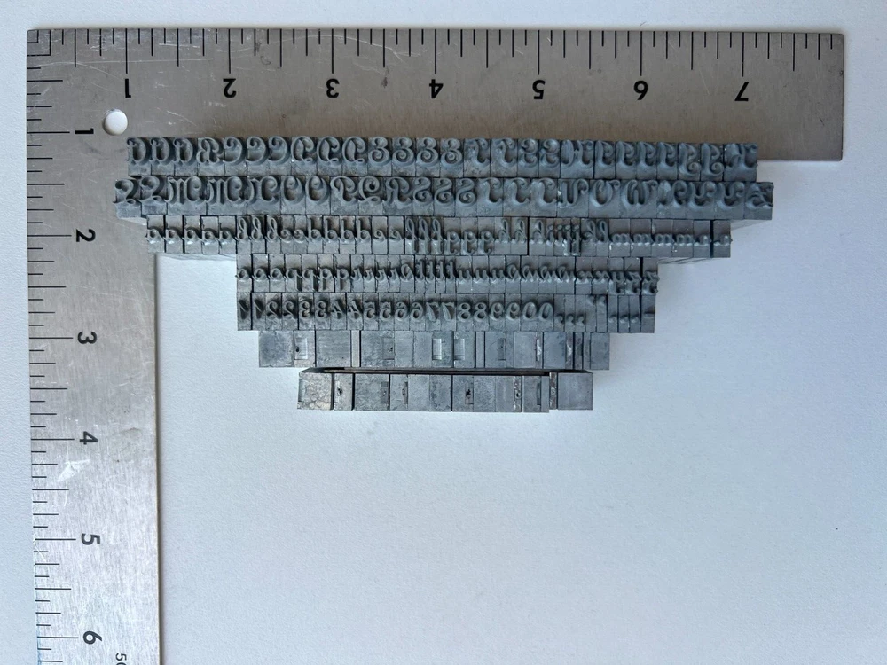 Perfect for bookmaker, letterpress, leather stamping, monogramming, etc. Includes (as shown in photos): Upper Case Lower Case Numbers Punctuation Please see photos for complete condition. Some letters may have oxidation or discoloring. Possibly missing a lowercase 's'. The 'v' character has passed as an 's' in use.
