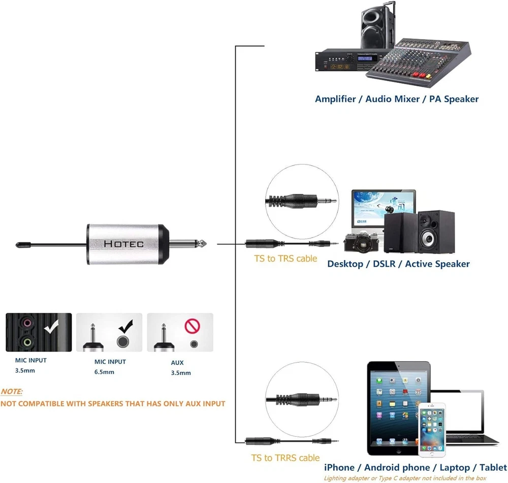 HOTEC Wireless Microphone, Metal Dual UHF Dynamic Handheld Microphone System for Karaoke, Singing, Speech (H-U26) FULL COMPATIBILITY: Connect the receiver to the 1/4” mic input of your sound device for voice amplifying. If your sound system is 3.5mm mic input, use the enclosed 3.5mm to 6.35mm adapter. Volume will be adjusted from the audio device end. SUPPORT RECORDING ON SMARTPHONES: This wireless microphone system comes with a 3.5mm adapter and the headphone splitter, you can connect this system with your iPhone or Android smartphones, tablet, laptops for recording on Facebook or Youtube. STAGE SOUND QUALITY: High quality sound transmission, clear voice and without feedback, free from distortion. This handheld wireless microphone is designed for vocal use in live performance, sound reinforcement, and studio recording. EASY SET UP: Plug and play. Battery-powered microphones (by 2 x AA battery) and wireless mini receiver (by rechargeable lithium battery) offers great freedom of movement on stage or in the room. You can have several sets working together. MULTI-USE APPLICATIONS: Perfect choice for karaoke party, DJ, wedding host, church, business meetings, classroom activities, outdoor or onstage performances or recording using iPhone/Android smartphones, tablets, laptops from Facebook, Youtube.