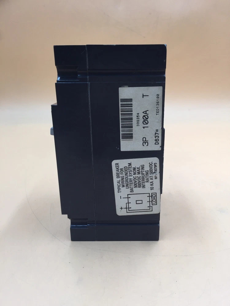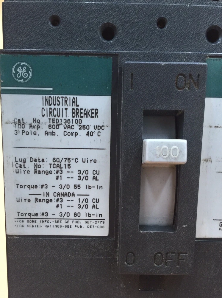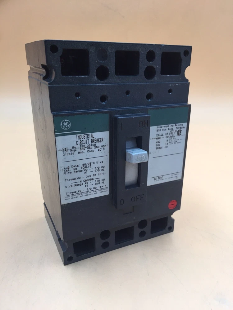 TED136100 General Electric (G.E.), E150 Line, type TED, 3P, 3PH, 100A, 600V, 18kA@480V, complete with load side lug terminals, standard interrupting capacity, 40°C, Bolt-On, Thermal Magnetic, molded case circuit breakers. REFURBISHED. 1 YEAR REPAIR WARRANTY, SHIPS WITH UPS OR FEDEX, PICK-UP AVAILABLE. WILL SHIP INTERNATIONAL, CUSTUMER PAY SHIPPING. ---CONTACT SELLER--- WE CAN DROP SHIP BLIND. QTY 1 PER BID.