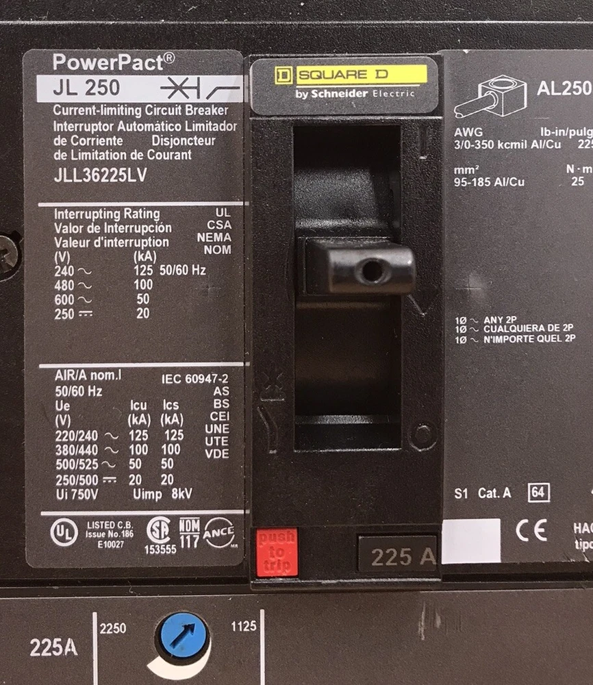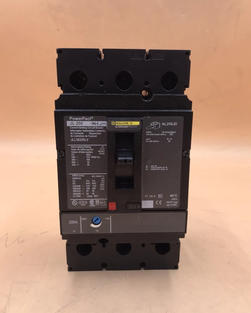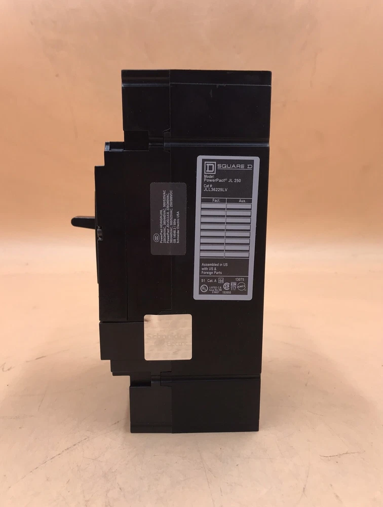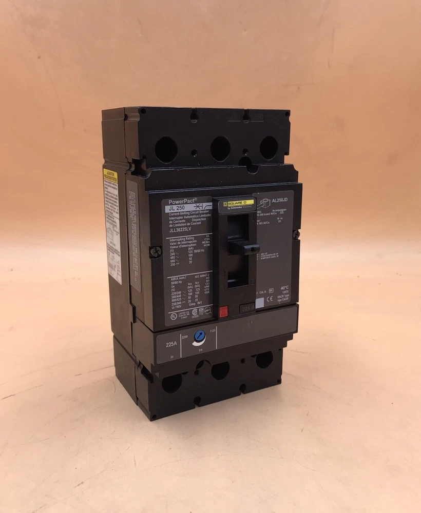 JLL36225LV Circuit breaker, PowerPacT J, 225A, 3 pole, 600VAC, 50kA, lugs, thermal magnetic, 80%, control wire OFF end. REFURBISHED. 1 YEAR REPAIR WARRANTY, SHIPS WITH UPS OR FEDEX, PICK-UP AVAILABLE. WILL SHIP INTERNATIONAL, CUSTUMER PAY SHIPPING. ---CONTACT SELLER--- WE CAN DROP SHIP BLIND. QTY 1 PER BID.