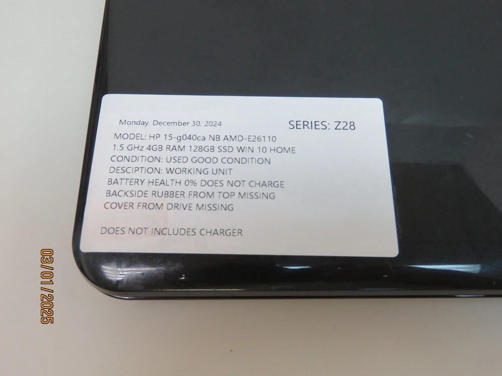 HP 15-g040ca NB 15.6" AMD-E26110 1.5 GHz 4GB RAM 128GB SSD WIN 10 HOME [Z28] Functional Condition: Tested and Functional With Issue. ISSUE: Defective Battery. Only Works When Plugged In. Does Not Include Charger. Missing Covers On Back Case. Missing Drive & Cover. Cosmetic Condition: This is a Used Item and Normal Wear (Scuffs & Scratches) is Expected. Items included in this listing: Controllers Grips Box Items NOT included in this listing: N/A Thank you for Shopping with Us! ENJOY Free Shipping in USA & Low Cost Shipping to CANADA! Terms of Sale NOTE: Our Listings only include items as pictured - Please do not assume any item is included if its not pictured. We will try our best to picture all items included in this listing as well as its cosmetic condition. We Guarantee & Stand Behind our product and commitment to provide you with o nly Original, Branded, OEM & Genuine Products Shipping A complete and correct shipping address is essential. We cannot guarantee the shipping address can be changed after checkout. Sales Tax will be charged to all Canadian & USA Buyers. Combined shipping is not guaranteed. We are unable to change any content of your order based on the eBay checkout note or PayPal message. Customers with shipping addresses outside of the U.S.A and Canada are responsible for all duties and import taxes. Please contact your customs for information Bidding All items are accurately described and pictured. Please ensure you are consciously bidding on the items as described. Payment Payments are expected at the time of purchase or in case of Auctions, at the end of auctions. Payments are managed via eBay Managed Payments Contact Us Your positive feedbacks are extremely valuable to us. If you have any concerns about your order, please contact us through eBay message to resolve any issues before leaving a negative feedback or opening a dispute. We will reply within 24 Hours Return Policy All items are in used condition unless specified.
