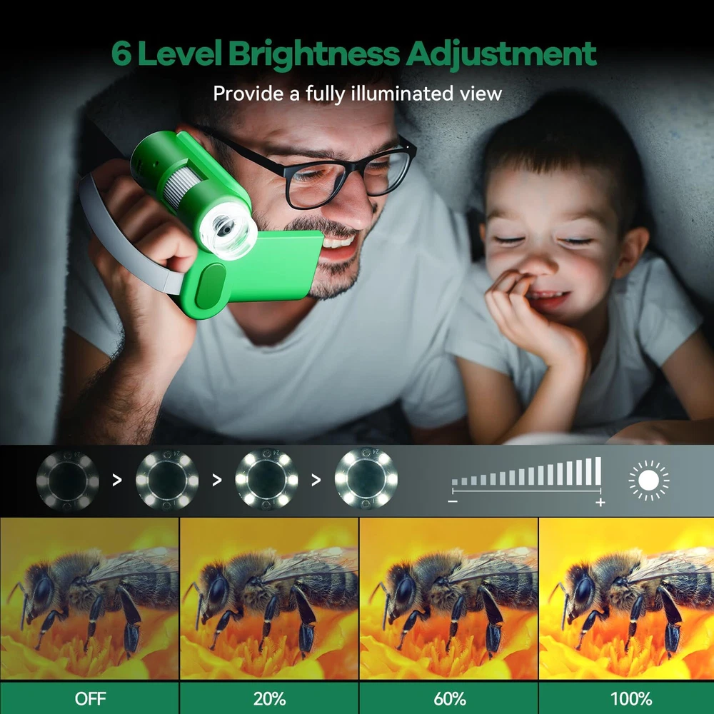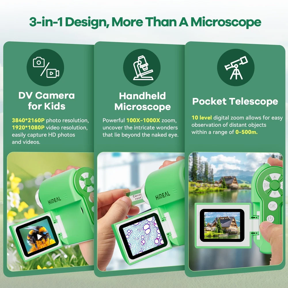 3-in-1 Kids Microscope: HP20 functions as a DV camera, handheld microscope, and pocket telescope - perfect for young explorers. Capture photos & videos, explore the microscopic world, or observe distant landscapes. Compact, easy to use, and educational, this 3-in-1 microscope makes science exciting for kids Built-in Microphone: This microscope for kids not only magnifies tiny wonders but also records audio, making it ideal for capturing videos with synchronized sound. Narrate discoveries in real-time, enhancing educational exploration with interactive visual and auditory experiences Impressive 100X-1000X Magnification: This miniscope for kids lets young scientists explore tiny living things and intricate leaf structures in stunning detail. With a wide magnification range, it fosters curiosity and a love for discovery through flexible scientific investigations Explore with Color: HP20 mini microscope features five colorful filters - green, blue, orange, purple, and gray. Kids can switch filters to highlight details and structures, making their scientific exploration more engaging and educational Versatile Exploration for Kids: Ideal for home, outdoors, and school! This handheld microscope lets young scientists explore plants, tiny living things, slides, and more, sparking curiosity and discovery everywhere. It makes science fun and accessible, whether at home, in nature, or at school Connect to PC for Real-Time Larger View: Young scientists can connect the pocket microscope to a computer for live, enlarged images. This feature enhances their exploration by showing detailed views on a bigger screen, making science more engaging and interactive Full Lighted View: The mini scope for kids has 6 LED lights with 6 adjustable brightness levels, providing bright views in any environment. Whether observing at home, school, or outdoors, it can provide clear and detailed views. Making scientific discovery engaging and accessible Portable & Rechargeable: Compact and easy to carry, this handheld microscope is perfect for on-the-go exploration. Rechargeable with a 3-hour battery life, it's ideal for backyard, classroom, or field trip adventures, letting kids discover science anytime, anywhere Store Every Fascinating Discovery: With a 32GB SD card included, this mini microscope provides ample space to capture and store photos and videos of scientific explorations. Preserve every detail of nature's wonders and tiny discoveries for future study and enjoyment Easy and Fun: This miniscope is user-friendly and engaging, letting kids easily explore the microscopic world. From observing tiny living things to capturing images, it makes learning exciting and sparks curiosity, turning science into an adventure