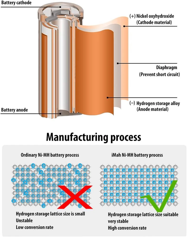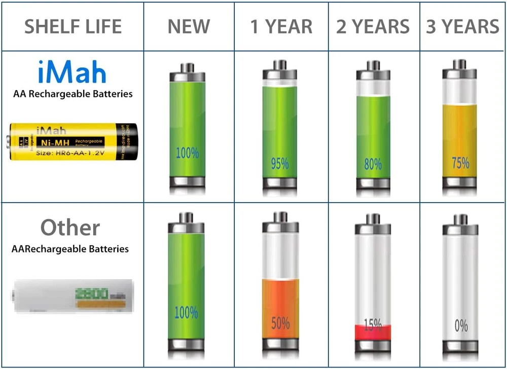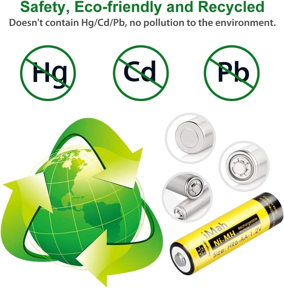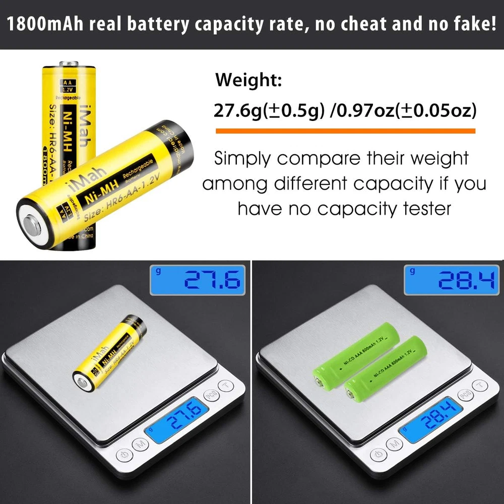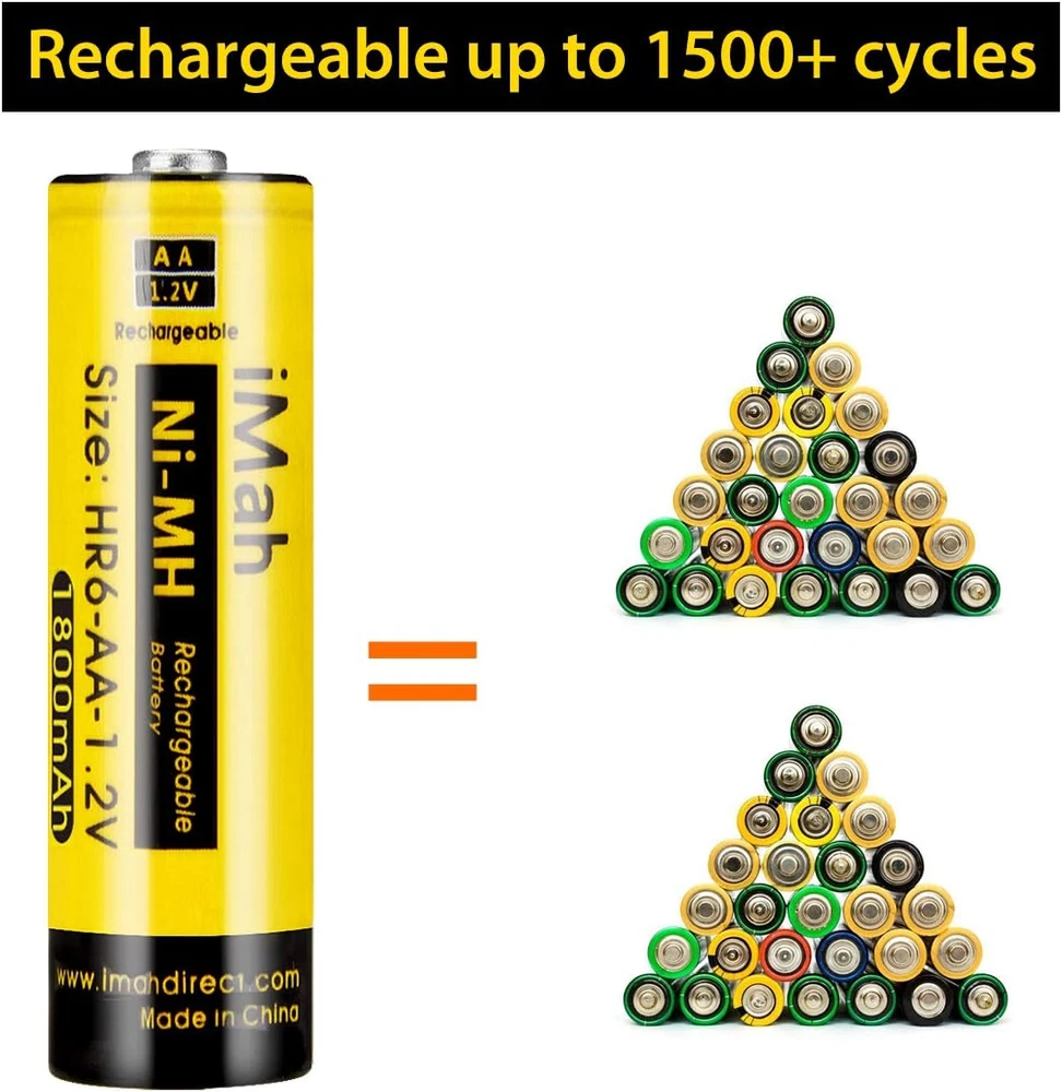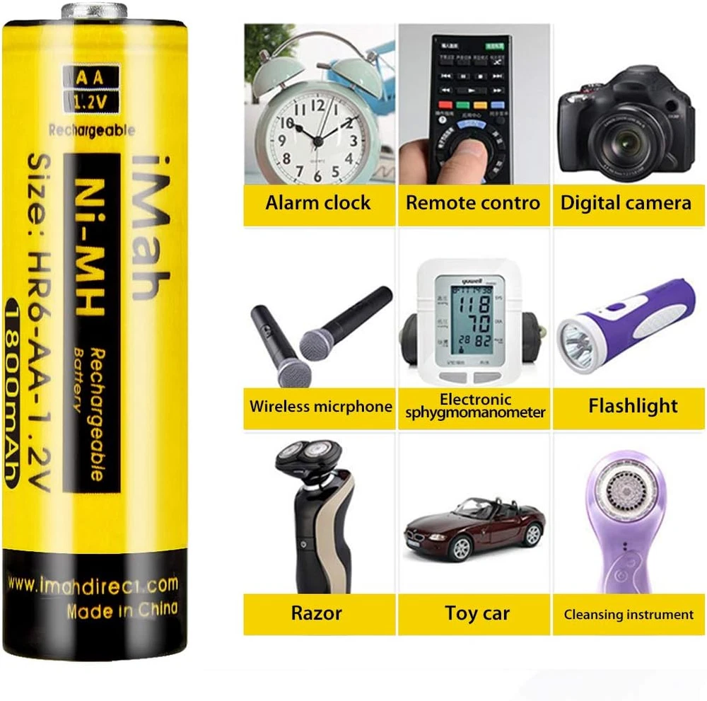 Store New Arrivals Add to Favorite View Feedback Contact HR6 AA Rechargeable Batteries Ni-Mh 1.2V 1800Mah for Solar Light, Remote Control Car, Clock, Flashlight, Toys, Pack of 4 Description Item model number AA-HR6-1800mAh_P4 Battery Cell Composition NiMH Product Dimensions 0.55 x 0.55 x 1.97 inches Item Weight 3.52 ounces Batteries 4 AA batteries required. (included) Recommended Uses For Product function(f) {var _np=(window.P._namespace("DetailPageProductOverviewTemplatesJava"));if(_np.guardFatal){_np.guardFatal(f)(_np);}else{f(_np);}}(function(P) { P.when('A').execute(function(A){ A.on('a:truncate:po-attribute-truncate-4:updated', function(data) { var isTruncated = !data.truncateInstance.getIfTextFits(); var seeMoreElement = document.getElementById('po-attribute-see-more-id-4'); if(seeMoreElement) { seeMoreElement.style.display = isTruncated ? '' : 'none'; } }) }); })); Solar Light, Remote Control car, Clock, Flashlight, Other Household Devices That Use AA Batteries, 1800mAh 1.2volt AA Ni-MH Rechargeable Batteries for Solar Lights See more Number of Batteries 4 AA batteries required. (included) Manufacturer Direct Compatible Phone Models function(f) {var _np=(window.P._namespace("DetailPageProductOverviewTemplatesJava"));if(_np.guardFatal){_np.guardFatal(f)(_np);}else{f(_np);}}(function(P) { P.when('A').execute(function(A){ A.on('a:truncate:po-attribute-truncate-3:updated', function(data) { var isTruncated = !data.truncateInstance.getIfTextFits(); var seeMoreElement = document.getElementById('po-attribute-see-more-id-3'); if(seeMoreElement) { seeMoreElement.style.display = isTruncated ? '' : 'none'; } }) }); })); AA 1.2V 1800mAh Ni-MH Rechargeable Batteries, Solar Lights, Remote Control Car, Clock, Flashlight, Toys and other Household devices, 1800mAh 1.2volt AA Ni-MH Rechargeable Batteries for Solar Lights See more iMah HR6 AA Rechargeable Batteries, Nickel Metal Hydride, 1.2V DC; 1800mAh 1800mAh real capacity, NEVER CHEAT!!! Weights 0.97oz/27.6g per battery. You can compare weight from others. Reusable, Cost-effective, Low self-discharge and No memory effect Compatible with most Ni-MH Battery charger and solar chargers. Retains up to 75% of charge after 1 year in storage Come with 4 iMah HR6 1.2V 1800mAh Ni-MH AA Rechargeable Batteries, 50-80% Pre-charge for safety-store Buy with confidence. Batteries are printed with manufacturing date (not expiration date), For 24-month after the date of purchase, we iMahDirect take care of all quality-related issues Product Description iMah HR6 1800mAh 1.2V Ni-MH AA Rechargeable Batteries, Pack of 4 High Capacity: 1800mAh (milliamp-hour) real rechargeable capacity. Weights 27.6g/0.97 per aa battery. Reusable, cost-effective, Low self-discharge and No memory effect: With a low self-discharge technology, your batteries can sit for years and still be ready when you need power. For the best performance, store fully charged batteries at about 68°F/20°C. Maintain 75% charge for up to one year and 50% of original charge after being stored for 3 years. Recharge up to 500 times. Built For The Cold: When you need batteries that perform well even in cold temperatures, these batteries maintain high power in low temps. Compatible with household devices: Don't be limited by batteries. iMah Batteries work well with a variety of electronics, including high-power devices such as digital cameras, electric toothbrushes, and flashlights. Come with: 4 iMah HR6 1.2V 1800mAh Ni-MH AA Rechargeable Batteries, 50-80% Pre-charge for safety-store iMah 1800mAh AA Rechargeable Batteries iMah HR6 AA Rechargeable Batteries, Nickel Metal Hydride, 1.2V DC; 1800mAh Reusable, Cost-effective, Low self-discharge and No memory effect Compatible with most Ni-MH Battery charger and solar chargers. Retains up to 75% of charge after 1 year in storage Compatible with household devices: These iMah HR6 1800mAh AA Rechargeable Batteries will work on household devices such as digital cameras, remote controls, wireless mouse, hand held games, 2-way radios, PDAs, LED flashlights, alarm-clocks, LCD-TVs, Toothbrushes, Shavers, portable audio players, solar charger, solar lights, toys and other devices that use aa batteries. Specification: Size: AA Rechargeable: Yes Voltage: 1.2V Capacity: 1800mAh Type: Ni-MH Weight: 27.6g/0.97oz per aa battery Dimension: 49x14x14mm / 1.93x0.55x0.55inch Compatible with household devices: iMah HR6 1800mAh AA Rechargeable Batteries will work on household devices such as digital cameras, remote controls, wireless mouse, hand held games, 2-way radios, PDAs, LED flashlights, alarm-clocks, LCD-TVs, Toothbrushes, Shavers, portable audio players, solar charger, solar lights, toys and other devices that use aa batteries. Issues when used on small outdoor solar light: Unlike other 600mAh/1000mAh lower capacity Ni-cd battery, these are 1800mAh higher capacity Ni-MH battery, if used on solar light, even through bright sun all day, but the solar charge current is very low, maybe the output current of the solar panel is only 30mA Max . So, these higher capacity 1800mAh never be full charged for one sunshine day. (but your 600mah could!) Here is the simple calculation: 1800mAh / 30mA = 60h Because of solar panel is too small to full charge this battery. So the standby time is not normal and that leads these higher capacity batteries die quickly! Except the solar panel is big enough, the output current will be larger. That will full charge a higher capacity rechargeable battery. ABOUT US We offer the best prices around on high quality products. Our E-store includes media such as books, movies, music and games while offering electronics, toys, sporting apparel, clothing, tools, general home, garden items and more. SHIPPING We are always working hard to ensure your package arrives as soon as possible. Please understand that some factors like weather, high postal traffic, and the performance of shipping companies are outside of our control. We offer free shipping to the lower 48 sta