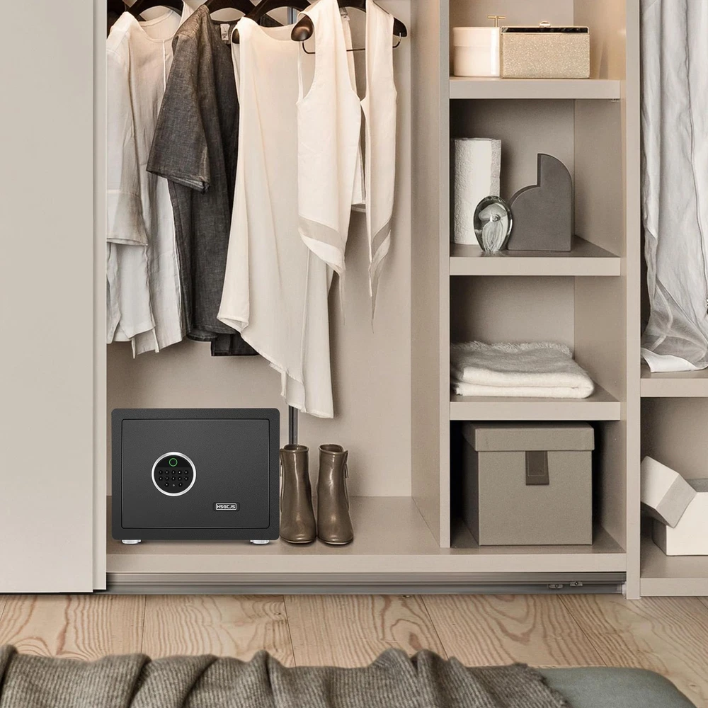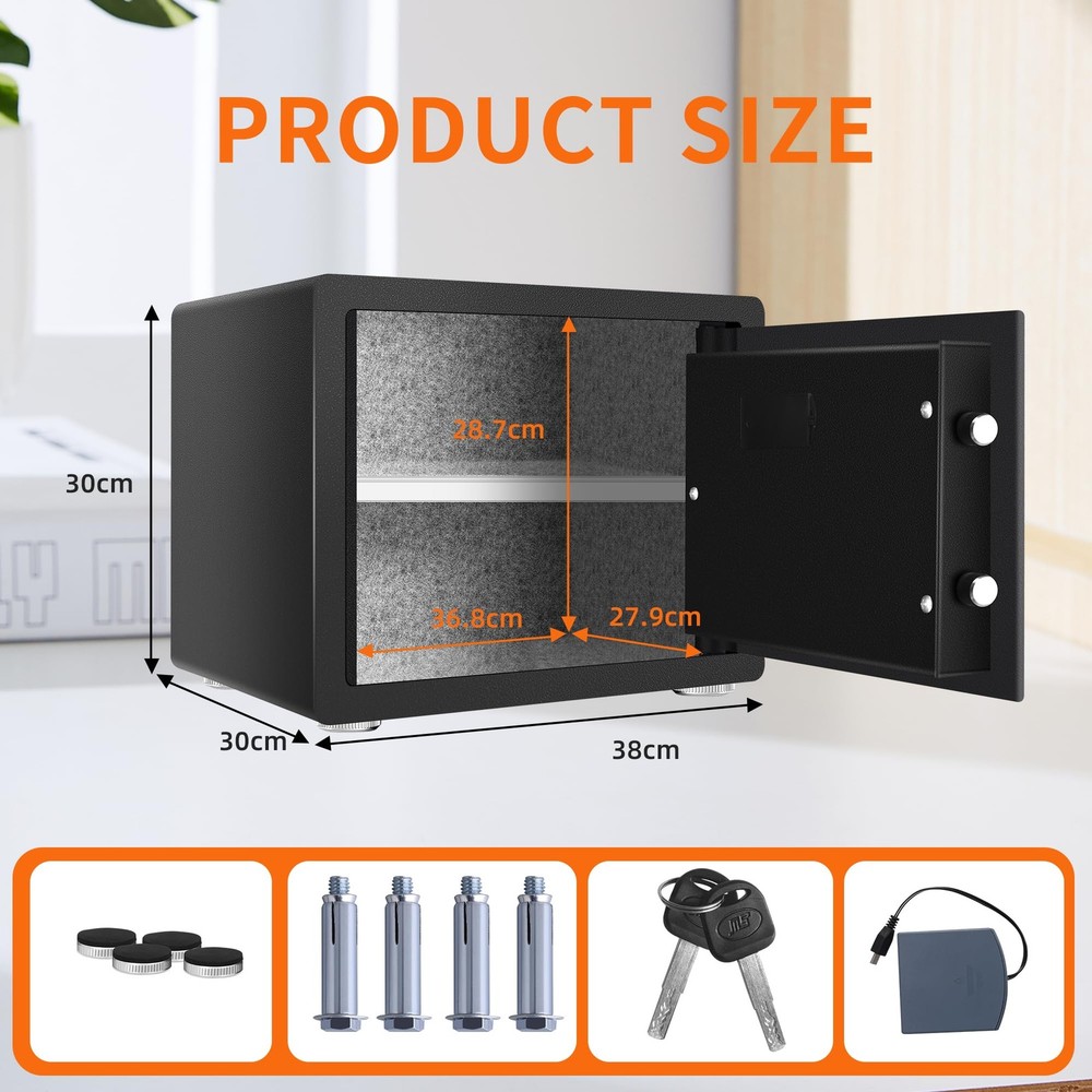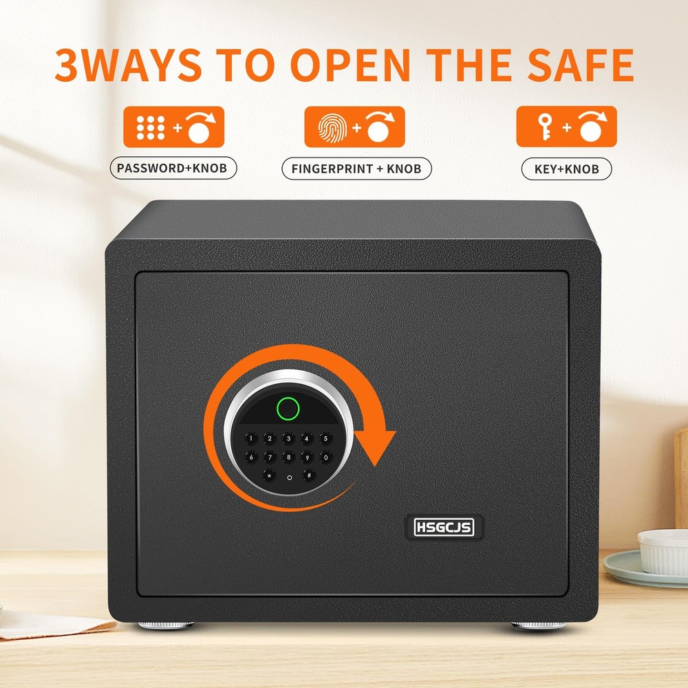 HSGCJS Biometric Fingerprint Safe, Home Safe Box with full Digital Keypad,Security Safe For Home,Office and Hotel-1.2 Cubic Feet [NEW SAFE EXPERIENCE] HSGCJS biometric fingerprint safe has a storage space of 1.2 cubic feet and an adjustable shelf to provide you with more flexible storage space. The home safe is equipped with LED lights inside, allowing you to quickly find what you need in the dark. In addition, the interior of the fingerprint safe is covered with velvet to prevent valuables from being scratched or damaged. 【STURDY STEEL STRUCTURE】The fingerprint safe adopts a micro-slit design with laser cutting precision without any deformation points, which enhances the anti-pry performance. The safe is made from high-quality solid alloy steel with excellent drill and high temperature resistance. The safe is equipped with 2 strong latches and a 3mm thick door panel to better protect our property and privacy. 【UPGRADED ALARM SYSTEM】As a multifunctional security safe for home, office and hotel use, we have been focusing on versatility and continuous new upgrades, so it is equipped with a dual alarm function for three consecutive wrong passwords or five wrong passwords. Fingerprints will trigger an alarm for 20 seconds. Press the * key to turn on the alarm function. Severe vibration will also trigger the alarm function. 【3 WAYS TO OPEN】HSGCJS security safe is equipped with an advanced one-touch biometric system that can store up to 28 fingerprints and unlock within 0.1 seconds, allowing you to open the safe quickly and accurately. You can also easily unlock your home safe using a numeric code. In case of emergency or if you forget the password, you can also use 2 emergency keys to open the safe. 【EASY INSTALLATION & CUSTOMER SERVICE】The home safe comes with pre-drilled holes for easy installation on the floor, shelf or wall. Prevents unauthorized movement and keeps your safe securely in place. If you have any questions or difficulties, please contact us and we will be happy to help you. We provide high standards of 24/7 customer service. Tips: Product Features 1.Heavy-duty and solid steel construction of safe ensures security 2. 3-8 digit code unlock function 3. Advanced fingerprint unlocking, up to28 fingerprints can be stored 4. Double alarm function. 3 times wrong password / 5 times wrong fingerprint input / violent vibration, will make the safe alarm for 20 seconds 5. The interior is wrapped with a soft lining that effectively prevents valuables from being scratched. 6.Shelf can be removed to enlarge inner storage space 7.Two emergency override keys also can be used to open the safe 8.Pre-drilled holes for mounting to the floor, shelf or wall to improve security Specification Color: Black Material: Steel Exterior Dimensions: 14.96x 11.8x 11.8 inch (L x D x H) Interior Dimensions: 14.56 x 11.42 x 11.42 inch (L x Dx H) Net Weight: 12KG/26.5 pounds Package Weight:13 kg/28.7pounds Package Includes: 1*Safe Box> 2*Keys> 4*Mounting Screws> 1*User Manual> 1*External Battery Compartment> 4*Foot Pats> DO NOT leave the key in the safe anytime! Shipping We offer FREE shipping on all orders! We ship within Three business days of payment, usually sooner. We use a selection of shipping services such as UPS, FedEx, USPS etc. We only ship to the lower 48 states, no APO/FPO addresses or PO Boxes allowed. Local pickups and combined shipping options are not provided at this time. Return You can return a product for up to 30 days from the date you purchased it. Any product you return must be in the same condition you received it and in the original packaging. Please keep the receipt. Payment We accept payment by any of the following methods: PayPal Please pay as soon as possible after winning an auction, as that will allow us to post your item to you sooner! Feedback Customer satisfaction is very important to us. If you have any problem with your order, please contact us and we will do our best to make you satisfied. Contact Us If you have any queries, please contact us via ebay. We usually respond within 24 hours on weekdays. Please visit our eBay store to check out other items for sale! Thank you for shopping at our store.