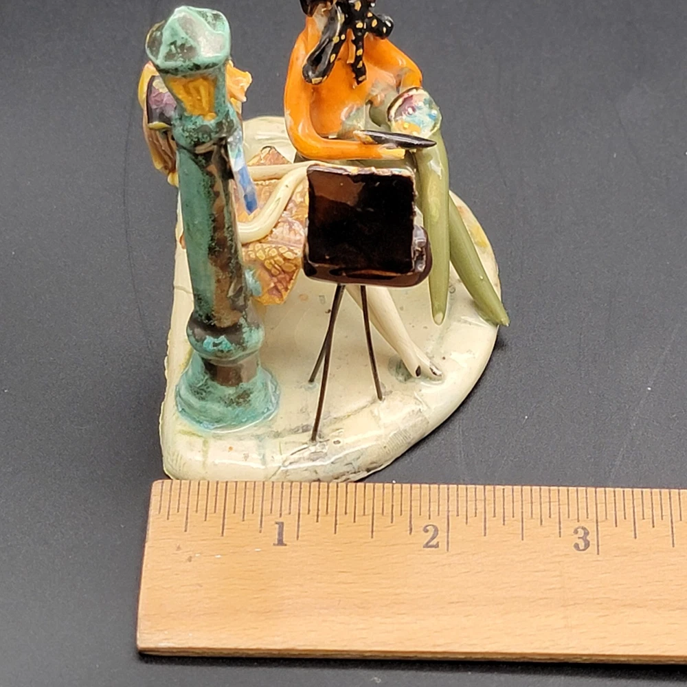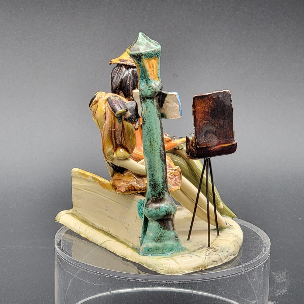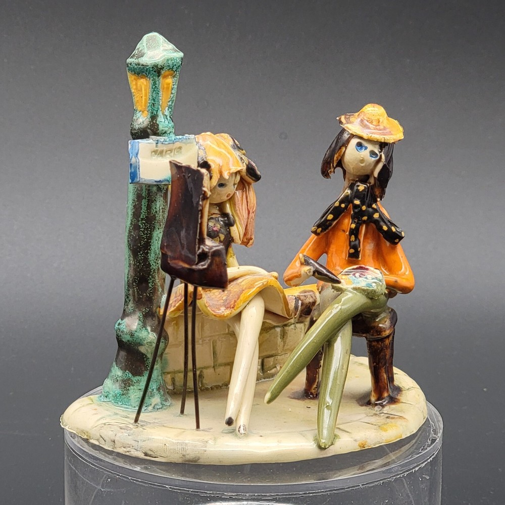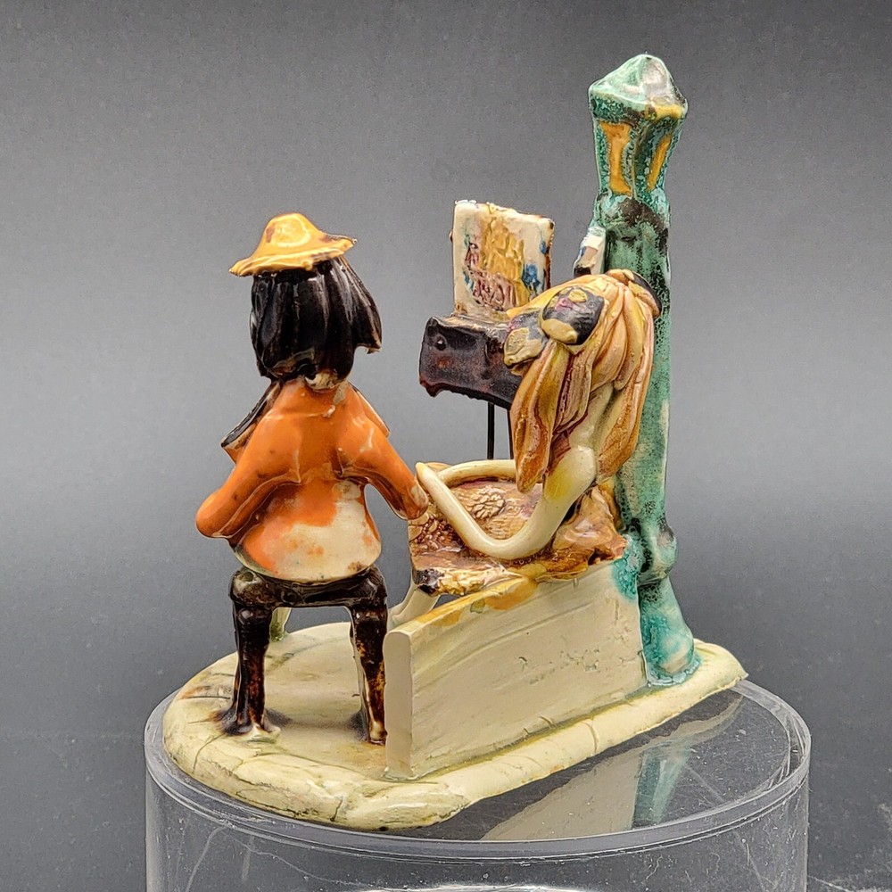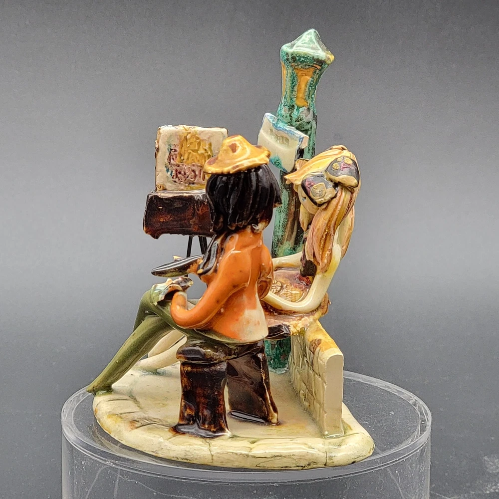 Bring a touch of Parisian whimsy into your home with this quirky, hard-to-find figurine. It's so charming, even the Eiffel Tower would tip its beret in admiration. • Art Deco style figurine • Ceramic material • Depicts painter and model • Measures 3.5 inches tall • Hand-painted details Some minor paint chipping on the figurine's edges. Base diameter = 3.5 inches, Height = 3.5 inches.