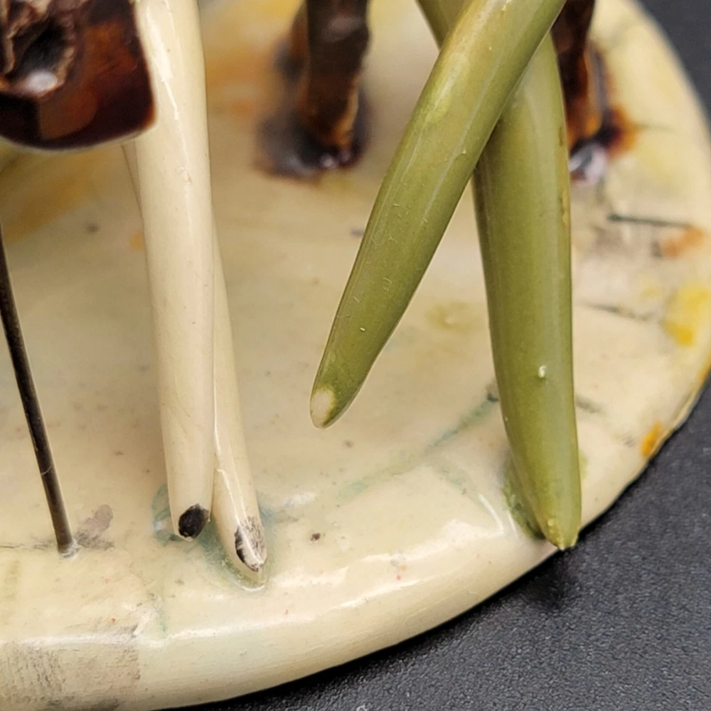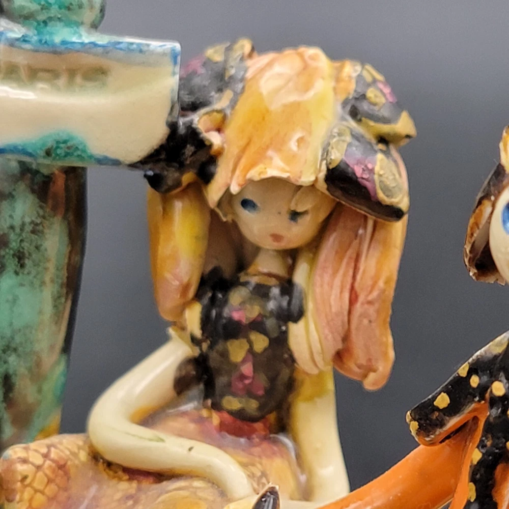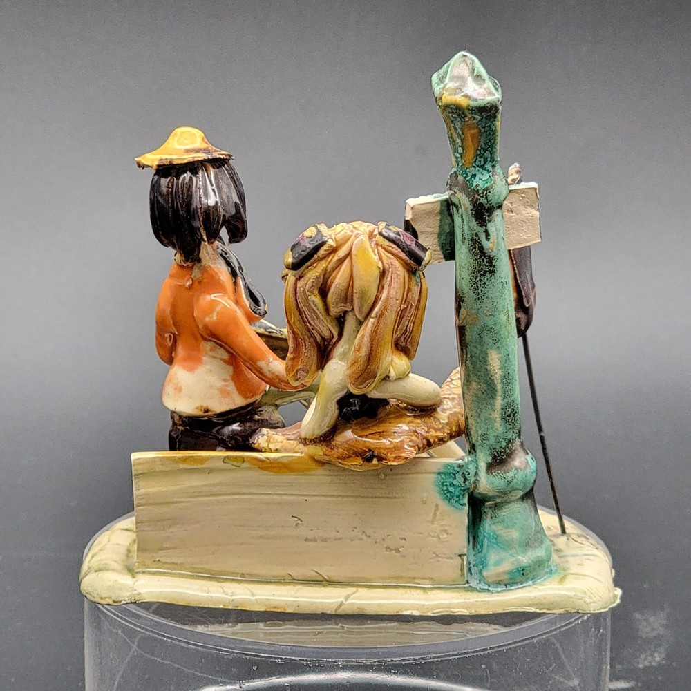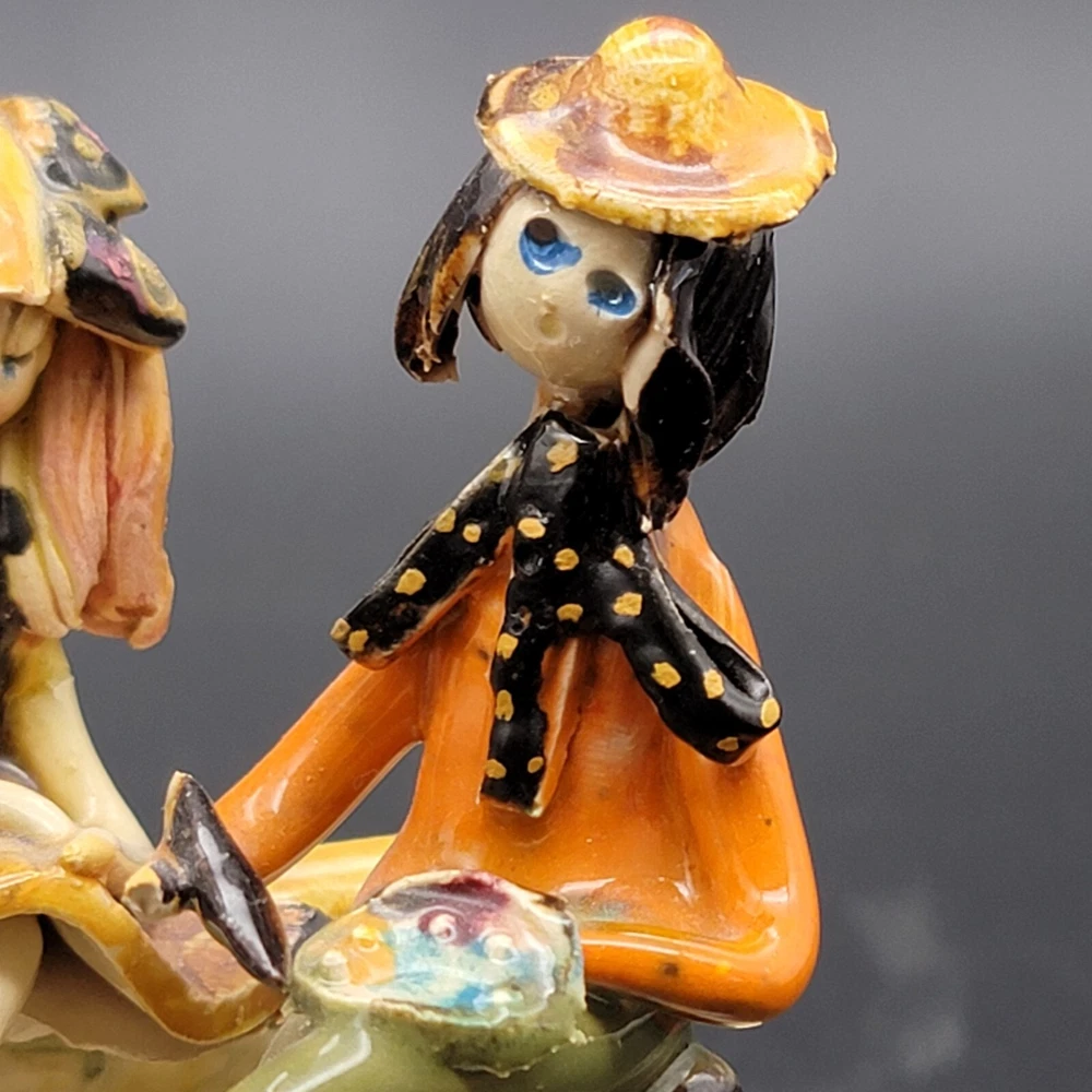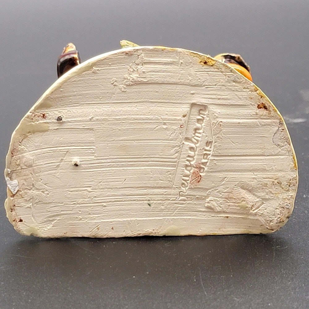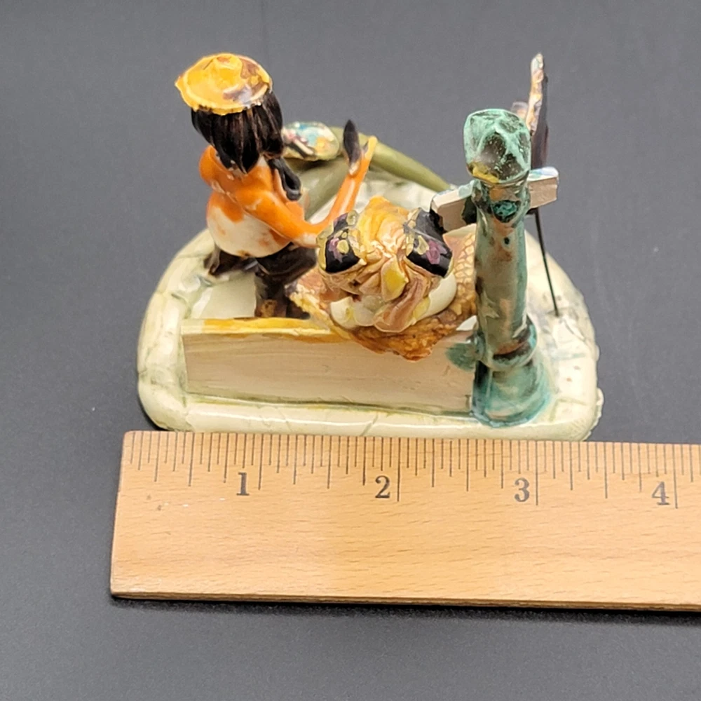 Bring a touch of Parisian whimsy into your home with this quirky, hard-to-find figurine. It's so charming, even the Eiffel Tower would tip its beret in admiration. • Art Deco style figurine • Ceramic material • Depicts painter and model • Measures 3.5 inches tall • Hand-painted details Some minor paint chipping on the figurine's edges. Base diameter = 3.5 inches, Height = 3.5 inches.