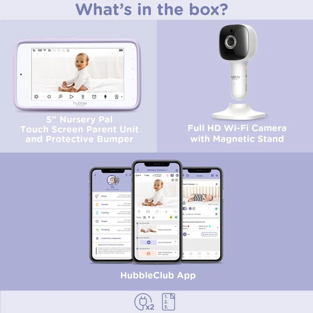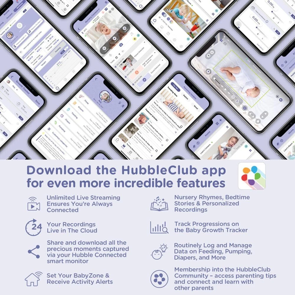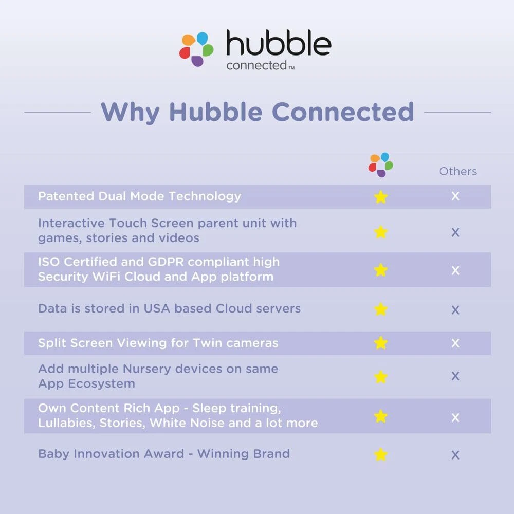 The Nursery Pal Cloud Touch smart baby monitor with patented Dual Mode technology lets parents operate the system in Wi-Fi and non-Wi-Fi mode. In Wi-Fi mode, you can monitor via your smart device on the HubbleClub app and the large 5-inch HD touchscreen viewing unit simultaneously. In non-Wi-Fi mode, the baby camera seamlessly functions as a traditional video monitor through a local connection, ensuring your baby's safety and privacy. The innovative touchscreen viewing unit also doubles as an interactive console with educational games, videos, and content for toddlers. Maintain optimal view with the digital pan, tilt, zoom feature, and magnetic mount. Keep your baby safe and comfortable with features such as an integrated room temperature monitor, infrared night vision, and two-way talk. The baby monitor comes preloaded with nature sounds, lullabies, and bedtime stories. When used with the 7-color night light and Sleep Trainer feature, Cloud Touch can also instill healthy sleep habits. Crystal Clear HD Quality with Next Level Connectivity and Convenience: The Nursery Pal Cloud Touch smart baby monitor offers a cutting edge touch screen parent unit, providing seamless connectivity and unmatched convenience for parents, with crystal-clear HD live feed Choose Your Connection: Hubble’s patented Dual Mode lets parents switch between non Wi Fi and Wi Fi viewing modes for secure and convenient monitoring of the HD camera live stream Double the Convenience: View your baby's live stream in the way that suits you best by using the 5 inch touchscreen parent unit or the HubbleClub app on your smart device Parents, Enjoy a Moment to Yourself: The innovative touch screen parent unit doubles as an interactive device, offering games, stories, and videos that grow with your child Optimal Comfort and Soothing Features: Assure your baby is comfortable with the integrated room temperature monitor, while the preloaded nature sounds, lullabies, and bedtime stories help lull your baby to sleep