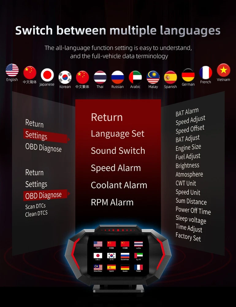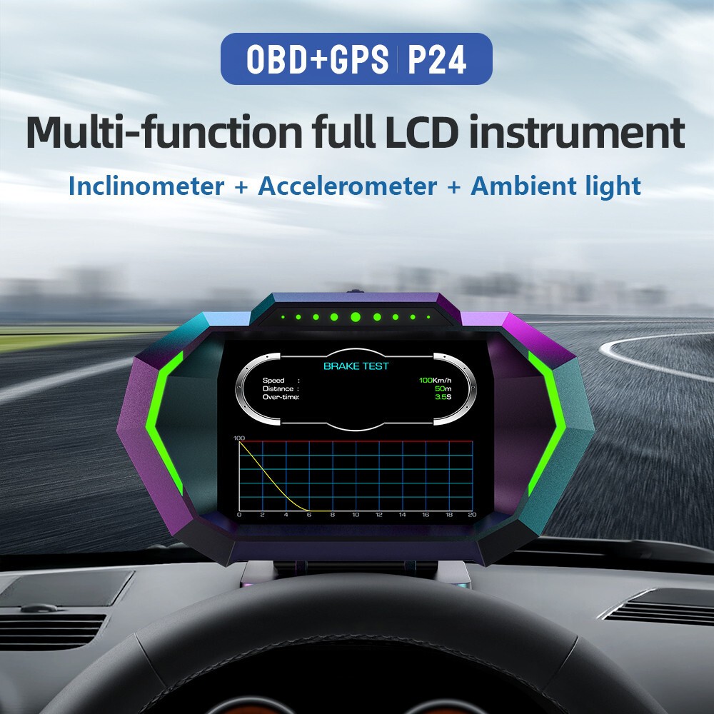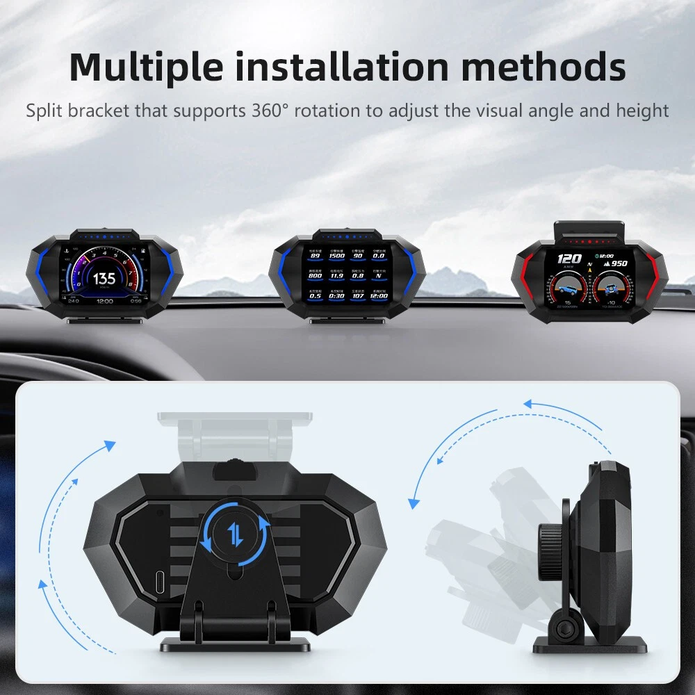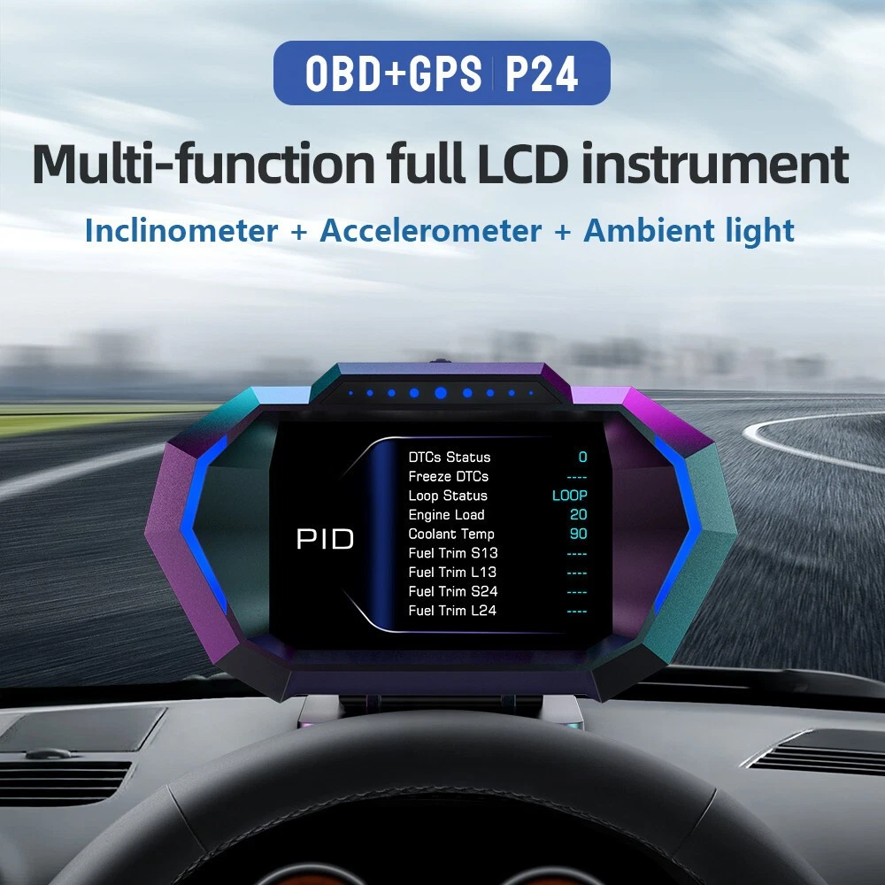 Details Head Up Display Dual System Digtial Water Oil Temp Turbo Press lnclinometer HUD OBD2 Car Accessory On-board Computer Add our listing to Watchlist Or Add to Cart , you will get more discount Functions: vehicle speed, voltage, water temperature, oil temperature, transmission oil temperature, turbo pressure, instantaneous fuel consumption, average fuel consumption, exhaust temperature, fuel quantity, driving distance, travel time, altitude, number of satellites, rotational speed, GPS vehicle speed, intake air temperature, Oil pressure, fuel pressure, GPS accuracy, date, day of the week, time, accelerometer, latitude, barometric pressure, longitude, driving direction, engine load, outside temperature, power battery level, left and right inclination, front and rear pitch Feature: 1.OBD2+GPS+Incline meter, universal cars 2. With 12 interfaces + 10 alarm functions 3. Automatic photosensitive + automatic switching of ambient light 4. The response is smooth Package includes: 1 X HUD 1 X Mount 1 X OBD Cable 1 X Anti Slip Mat 1 X Manual