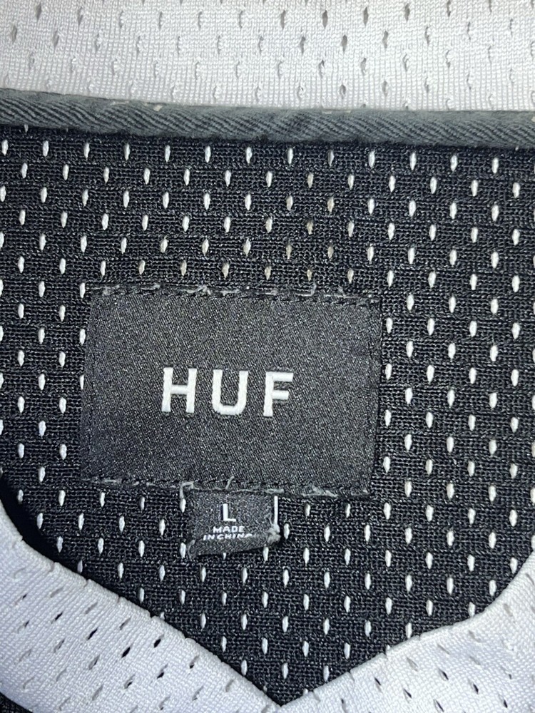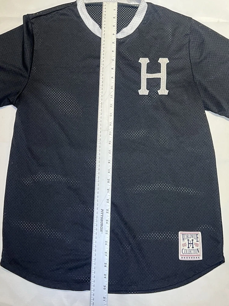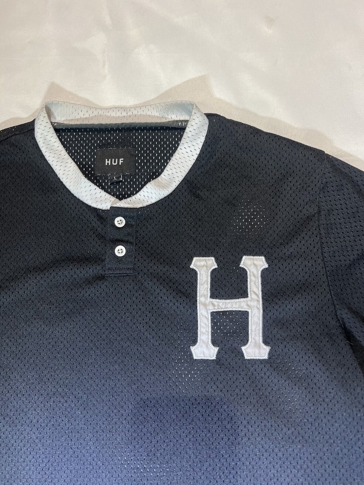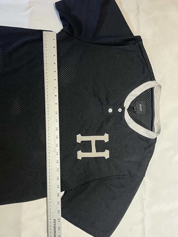 HUF Chavez Transparent Baseball Jersey Shirt Black Size Large Jersey is in excellent condition No rips or tears in fabric Men’s size large -please refer to measurements and compare to good fitting garment at home.