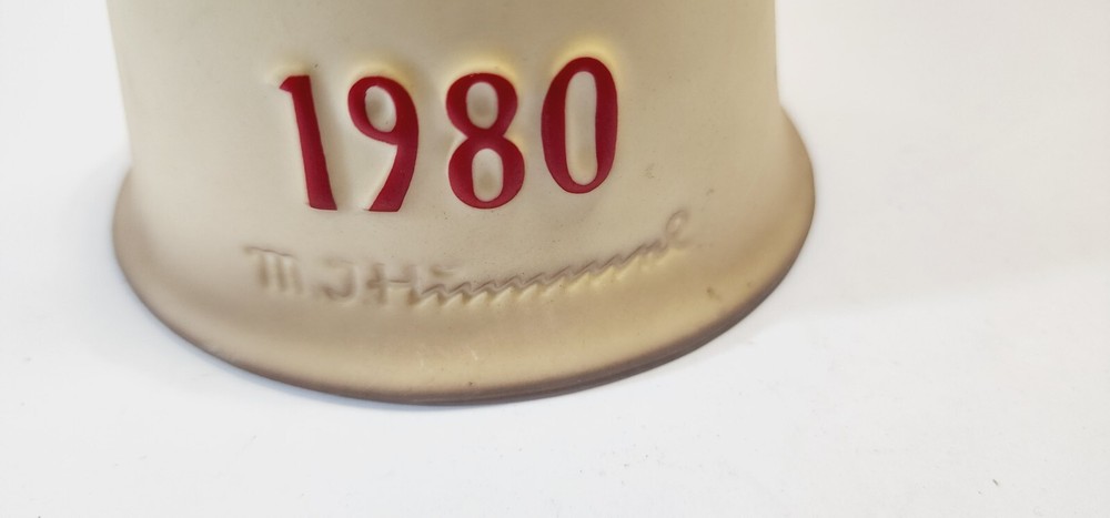 This Hummel Goebel annual bell in the "Thoughtful" design from 1980 is a beautiful addition to any collection. The multicolor porcelain bell stands 6 inches tall and features an oval shape with relief detailing. The item length is 4 inches, width is 3-3/8 inches, and it weighs 6.1 oz. This item is unboxed and does not come with the original box. The bell is retired and is a late 20th century (1970-1999) era piece. It is perfect for any room and occasion, and care instructions include cleaning with a damp cloth. The Hummel Annual Bell is a true work of art and a valuable addition to any collection.