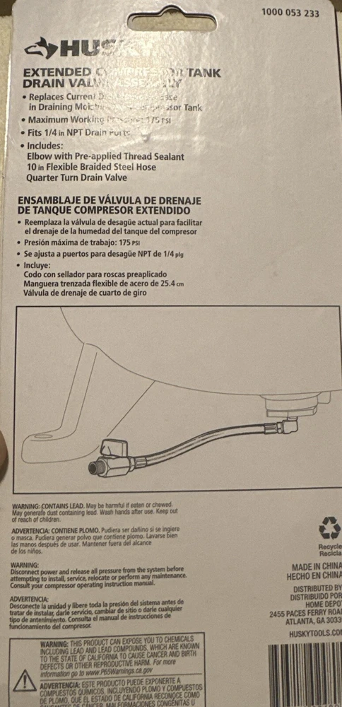 This is a HUSKY 1000 053 233 1/4" Extended Compressor Tank Drain Valve Assembly. It is a high-quality and durable tool designed for easy and efficient draining of compressor tanks. The brand of this tool is HUSKY TOOLS, and it is a perfect addition to any toolbox. The type of this tool is a DRAIN VALVE ASSEMBLY, and it is a must-have for any mechanic or DIY enthusiast. The model of this tool is 1000 053 233, and it is designed for long-lasting use. At Manasota Liquidation, we prioritize your satisfaction and peace of mind with a 30-day return policy. We take great care in packaging your products, utilizing bubble wrap to ensure they arrive in perfect condition, just as shown in the pictures. To further enhance your shopping experience, we provide $100 insurance on any damage that may occur during shipping. In the unlikely event that your order is damaged, please contact our customer service team, and we will assist you in resolving the issue. Please note that a restocking fee of 20% will be applied to all eligible returns. This fee will be deducted from the refund amount issued to the customer. Shop with confidence knowing that we prioritize the safe delivery of your order and offer insurance coverage for your protection.