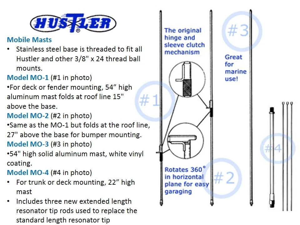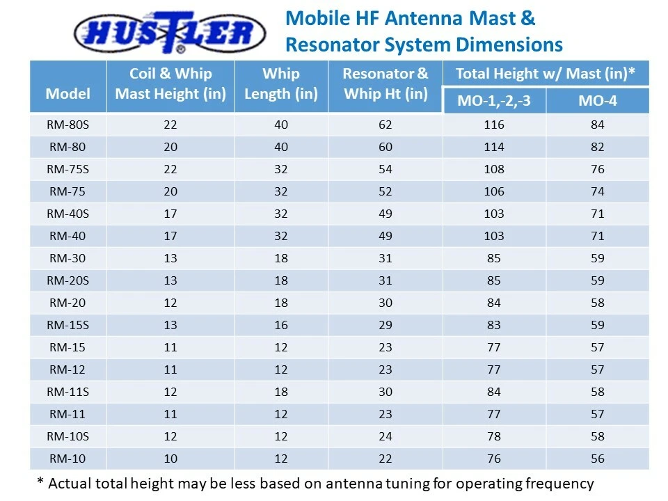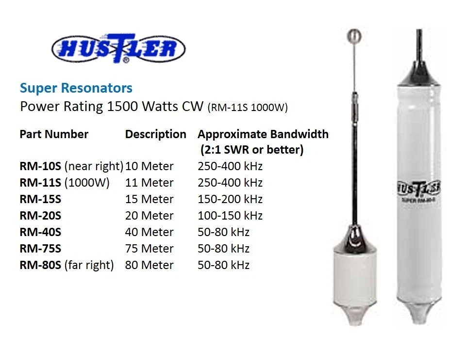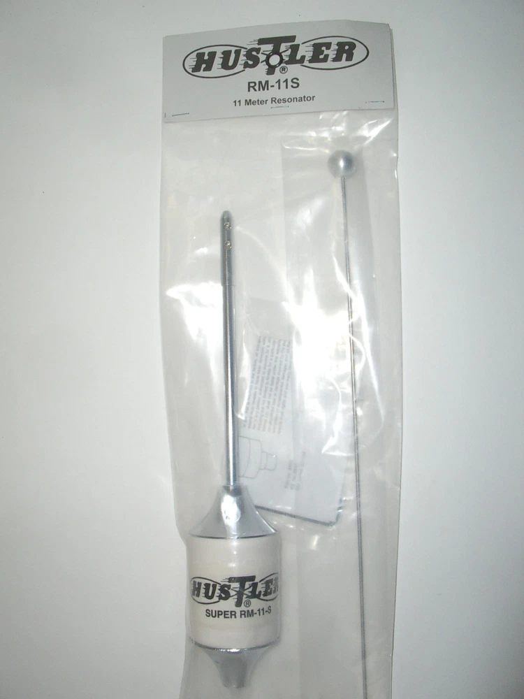 New Hustler RM-11S 11m super mobile antenna resonator. Fits as top resonator on the Hustler masts (MO-1/2/3/4; sold separately) to create a mobile HF antenna. Rated at 1000W SSB. This listing is for the antenna RESONATOR and is not a complete antenna system . It is intended for use with the Hustler masts (sold separately ) to make a complete antenna system. Please contact use with any questions. SPECIFICATIO NS: • Bandwidth 250-400KHz within 11m citizen band • Power: 1000W SSB • Stainless Steel whip and base fitting with 3/8" X 24 threading • mil-spec WHITE p olyolefin sheath • Height (see table) • Requires HF mast MO-1/2/3/4 (sold separately). This item ships UPS Ground, FedEx Home or USPS mail within the Continental US depending on location at our discretion. This item is not available for shipment outside the Continental US or to a PO Box. Visit our eBay store for other radio accessories.