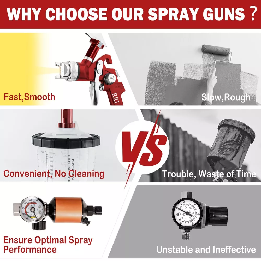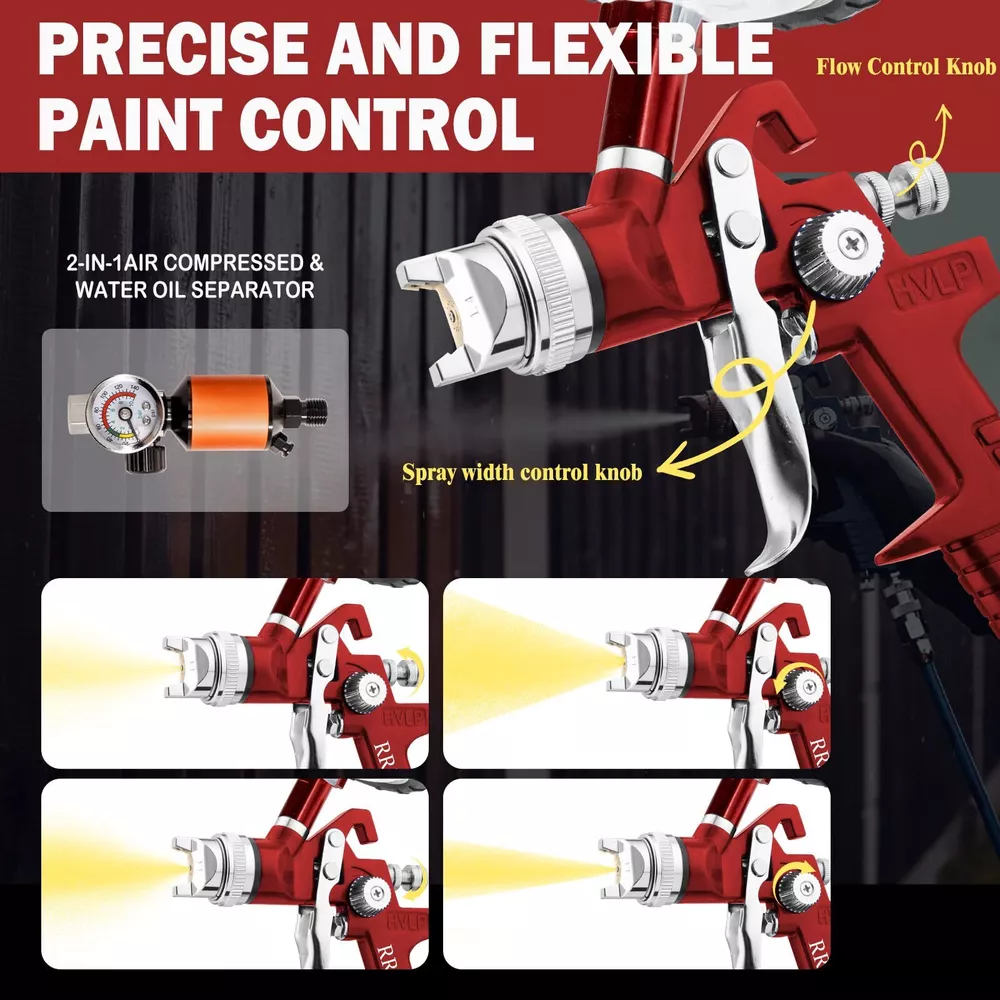 Why Choose Air Spray ? pneumatic spray is chosen for its efficiency and versatility in applying coatings such as paint, varnish, or primer to surfaces. It utilizes compressed air to atomize and propel the material, ensuring a smooth and even finish on various substrates. Specifications Air Pressure Requirement: Typically operates at 30-50 PSI (pounds per square inch), ensuring optimal atomization without overspray. Material Compatibility: Spray paint suitable for water-based and oil-based paints, enamels, lacquers, and primers. Nozzle Size Options: Available in various nozzle sizes (1.3/1.7/2.0) to accommodate different viscosity and application requirements. Called: automotive paint sprayer, spray for painting, hvlp paint sprayer, pistola para pintar carros,auto paint ,car paint ,air paint sprayer Considerations Air Compressor Requirements: Ensure the air compressor the 's air consumption rate to maintain consistent performance. Cleaning and Maintenance: Regularly clean the after each use to prevent clogging and ensure longevity. Use appropriate cleaning solvents recommended by the manufacturer. Safety Precautions: Wear appropriate personal protective equipment (PPE), including goggles, gloves, and a respirator, especially when working with solvent-based coatings. air paint sprayer combines reliability, efficiency, and ease of use, making it an ideal choice for professionals and DIY enthusiasts alike. Its ability to deliver a flawless finish on diverse surfaces makes it indispensable in automotive refinishing, furniture restoration, and various industrial applications. PROFESSIONAL SPRAY : The working pressure is 2.5-3.5 bar, spraying distance is 160-240mm, and air consumption is 240-280L/min. The HVLP structure ensures smooth spray control, delivering uniform atomization and particle effects for coating various surfaces. By owning this spray paint , you can save on pricey labor costs! ADJUSTABLE CONTROLS: The HVLP spray has a higher paint transfer rate, reducing overspray and ensuring even coatings and fine atomization. You can adjust the flow control knob to control paint output, accommodating a range of projects. Attaching the air spray kit's 2-in-1 air regulator to captures water vapor and oil particles, providing precise air control of the paint sprayer and improving spray quality. EASY TO USE AND CLEAN: The air paint sprayer is easy to assemble. Even if you are a beginner, you can get started quickly after reading the manual. You need to disassemble the paint spray for cleaning after use. The kit comes with cleaning kits, which can help you effectively clean the hardened paint left on the nozzle part, so you can enjoy a more efficient cleaning experience! BUILT TOUGH: This car spray paint is built to last, with a solid aluminum body, stainless steel nozzle, and brass air cap, all resisting paint corrosion. The precision-machined 15-hole cover ensures that paint is mistin' right. Additionally, the ergonomic handle design provides a comfortable grip, reducing fatigue during extended use. HVLP AIR SPRAY : The paint set includes three nozzle sizes (1.4/1.7/2.0mm) suitable for a wide range of painting projects, such as automotive spraying, priming, craft spraying, toy painting, art murals, and anti-rust protection. Paint automotive are suitable for different types of paints, including water-based and oil-based. Please filter and dilute the paint before use to avoid clogging. YOUR GEAR: 1 HVLP paint , 3 Nozzles Kit (1.4/1.7/ 2.0mm), 1 600ML Mixing Cup Set, 1 2-in-1 Air Regulator, 5 Paint Filters Papers, 1 Filters, 1 Wire Brush, 1 Cleaning Brush, 1 Set of Threaded Fittings, 1 Set of Connectors, 1 Tape, 1 Wrench, 1 Instruction Manual. Got questions about air paint sprayer? Reach out through your order, Our dedicated after-sales teams are standing by to assist you.