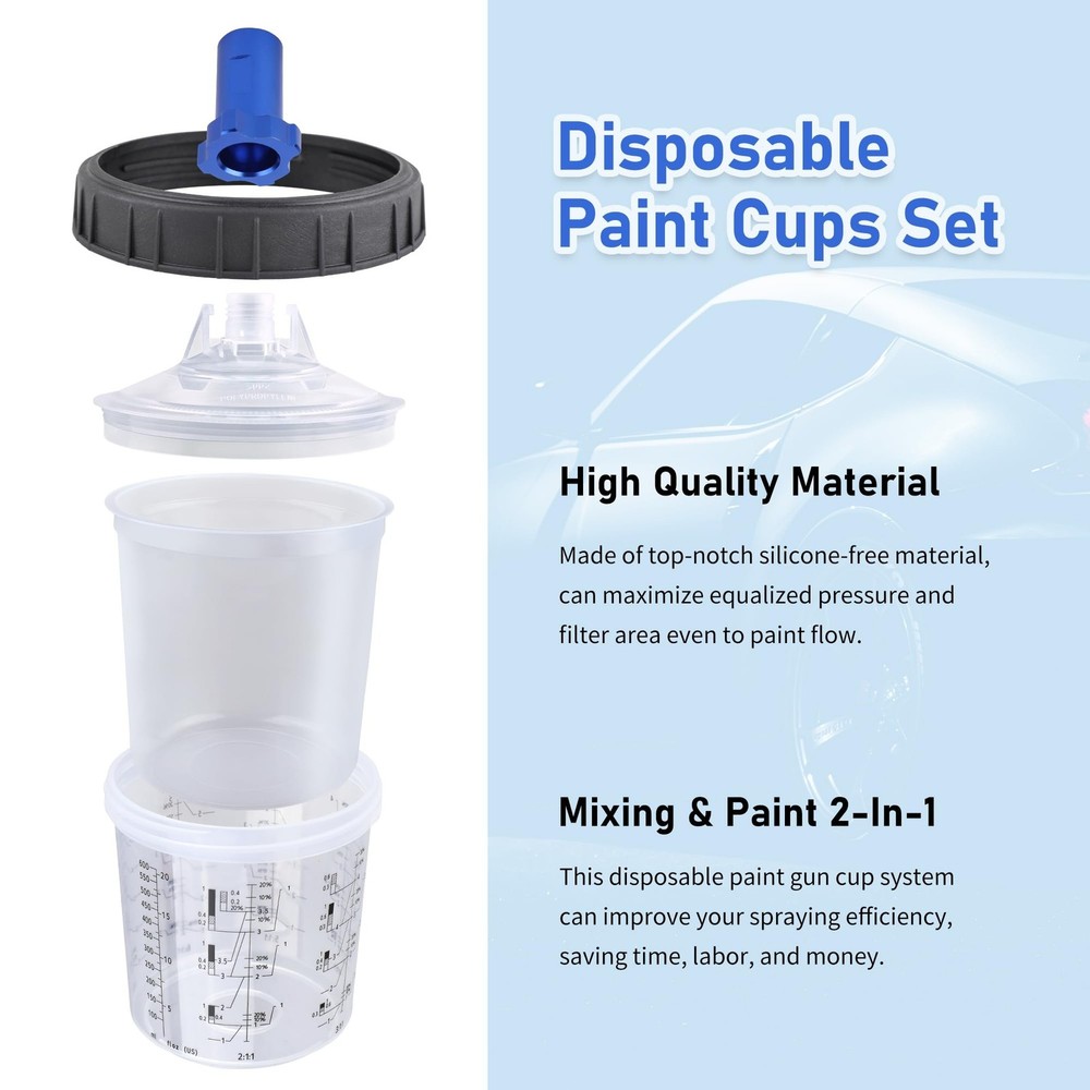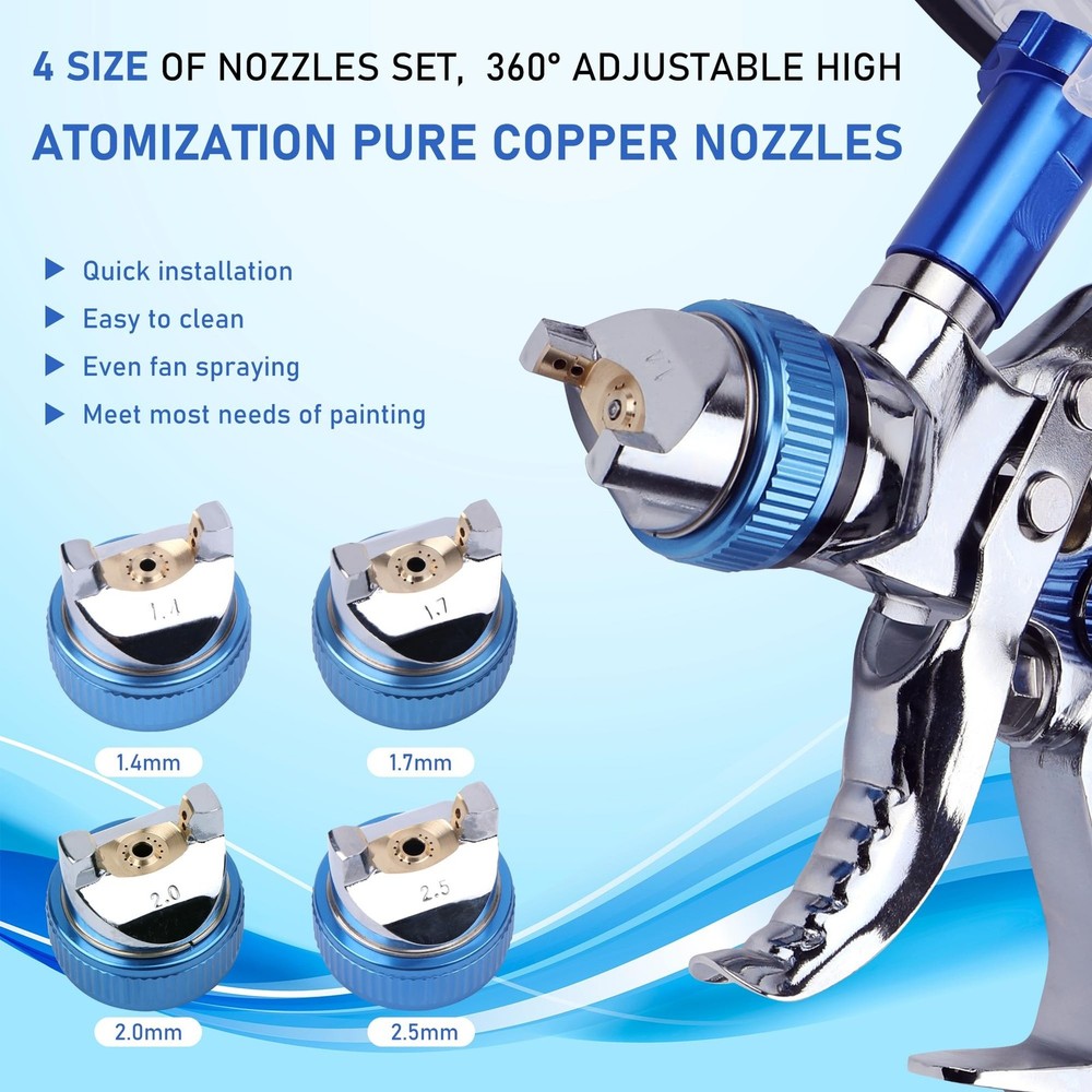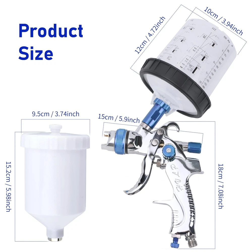 HVLP Spray Gun with 10Pcs 600ML Disposable Paint Cups, Automotive Gravity Feed Spray Gun Kit with 4 Nozzles,1.4/1.7/2.0/2.5mm, Sprayer Gun with Air Compressor Regulator for Auto Paint (Blue) Product Details Brand: Zeinlenx Tank Volume: 600 Cubic Centimeters Color: blue Recommended Uses For Product: Painting Material: Stainless Steel, Brass Brand: Zeinlenx Tank Volume: 600 Cubic Centimeters Color: blue Recommended Uses For Product: Painting Material: Stainless Steel, Brass Product Dimensions: 5.9"W x 7.4"H Power Source: air_powered Included Components: Instruction Guide, Gun Lubricant, Measuring Cap, Nozzle, Viscosity Cup, Nozzle Adapter, Shoulder Strap, Strainer, Replacement Seal, Cleaning Kit Model Name: 2008-4-blue Item Weight: 3.25 pounds Manufacturer: Zeinlenx Country of Origin: China Item model number: 2008-4-blue Our Advantages: This HVLP spray gun kit provides 4 nozzles of 1.4mm 1.7mm 2.0mm and 2.5mm, which can fully meet your various needs. Equipped with high-quality brass air cap, high-grade stainless steel needle, and nozzle, making the painting more smooth and even. Package includes 1600CC pp paint cup and also 1 quick paint mixing cup, more choices for you. 65% High Transfer Efficiency: This body repair paint spray gun features a 15 hole copper atomizer, can save 20% of paint, paint utilization rate up to 65% to reduce pollution. Working pressure 2.5-3.5bar; Air consumption 275L/min; Spraying width 240mm; Pattern range 170-240mm;1/4" NPT inlet and the same size quick adapter. High Quality Material Paint Gun: This car paint sprayer is designed with a one-piece aluminum alloy body, 4 sizes of stainless steel nozzles, and solid brass gun cap, which can withstand heavy use for a long time. Light weight, ergonomic design can reduces operating fatigue. Cost Saving & Package Include: Our automotive spray gun kit comes with 1 air car paint gun, 4 sizes nozzle set, 1 PP paint cup,1 hard cup with 1 retainer ring,10 disposable cups liners and 10 lids, 1 pressure gauge, 1 brush, 1 wrench and 1 sealing tape. Using the disposable cup system will reduce the waste of paint material also saved time for cleaning the cup. Wide Application: This auto paint spray gun is ideal for spraying, base coat, clear coat, and other coatings. Very suitable for primer, painting cars, furniture repair, industry, and other paint applications. Easy to use for beginners and professionals.