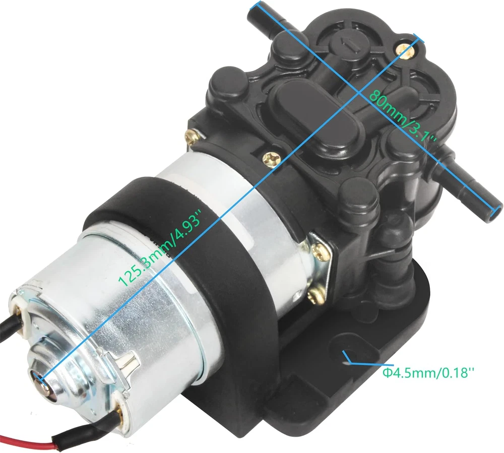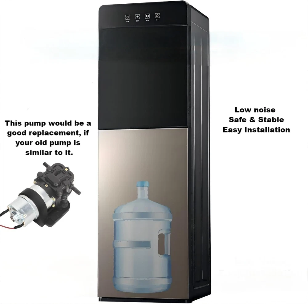 Rated Volt: DC 12V, Max flow rate: 1.6L Pressure: 35 psi. It doesn't mean 1.6L/min at 35PSI.Self priming function allows it to be mounted above water tank, Vertical Suction Lift: 3.3ft (1m). Amp Draw 0.35-0.5A Please do not use AC power source. This water dispenser pump come with pipe quick connect elbow, RO water tubing,heating shrink tube and screws. Full accessories make the installation easily.Inlet and Outlet: 1/4’’ . Size: 4.93’’x 3.1’’ x 2.38’’. Item weight: 500 grams Pump with self-priming function: Max. Vertical Suction Lift: 6.5ft(2m). Max. Flow: 1.6LPM, Head(High Lift):≥100ft (30m). Built-in pressure valve automatically shut-off when the pressure exceed. Bigger size mount support the whole pump body, more stable when install on water dispenser, reduce vibration and noise effectively. Please connect the water pump correctly. Red wire for positive pole and black wire for negative pole. Product Description DC 12V Water Dispenser Pump This water dispenser pump has self priming function, it is specially designed for bottom-loading Water Dispenser, Water Coolers, Water Purification , Hot & Cold Water Dispenser, Refrigerator, Ice Maker, Coffee Machine, Fish tank. Why do I choose it? Easy insatllation Stable performance Food Grade, Long life This water pump has built-in pressure valve automatically shut-off when the pressure exceed. Protect the pump and avoid damage to water dispenser. High-quality motor ensure durable and stable work. Low heat: The pump can work continuously for a long time and won't be hot. Safe Food Grade, Stable performance, Long life Rated Volts DC 12V Amp Draw 0.35-0.5AMP Max Flow rate 1.6 L/min Pressure 35PSI Vertical Suction 4.2ft (1.3m) Working Temperature Range 0~70°C /32~158°F Noise <35DB Inlet/Outlet 1/4" (6.5mm) Pressure Over-load Protection Built-in pressure valve automatically shut-off when the pressure exceed. Effectively protect the water dispenser and pump and avoid leakage caused by excessive pressure. Bigger Mount More Stable Lower Noise Bigger size mount support the whole pump body, more stable when install on water dispenser, reduce vibration and noise effectively. Full Range of Accessories Easy to Install The pump come with qucik connect elbow, silicone tube,screws and heat shrink tubing for your easy and quick installation on water dispenser. Package Includes: 1 x Water Dispenser Pump 2 × 1/4" Pipe Quick Connect Elbow 1 × 1/4"RO Water Tubing 1m 1 × Heat Shrink Tube 2 x screws 1x manual Easy Replacement for Your Drinking Water Equipment This pump will be a good replacement if your water dispenser's old pump is similar to it. It is quite and durable, give more smooth operation on your water dispenser. Warm Tips: Before make deicision, you may check the pump size , voltage, flow rate , loading current , suction lift and flow head. If they are simialar to your old pump. It should be a good replacement for your water dispenser. Please connect the pump correctly. Red wire for positive pole and black wire for negative pole. If the connector of leads is same, just plug in the connector of water dispenser. If not ,cut the power cord from old pump and connect it to the new one. It is better to leave the red wire and black wire about an inch from the new pump. Please try to keep the pump stable when install. Improper installation may generate vibration and noise during operation. The pump can not run continuously more than 6 hours.