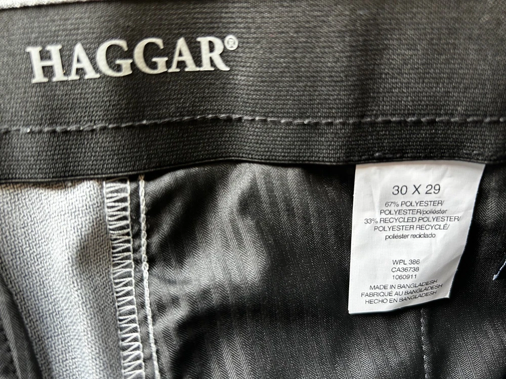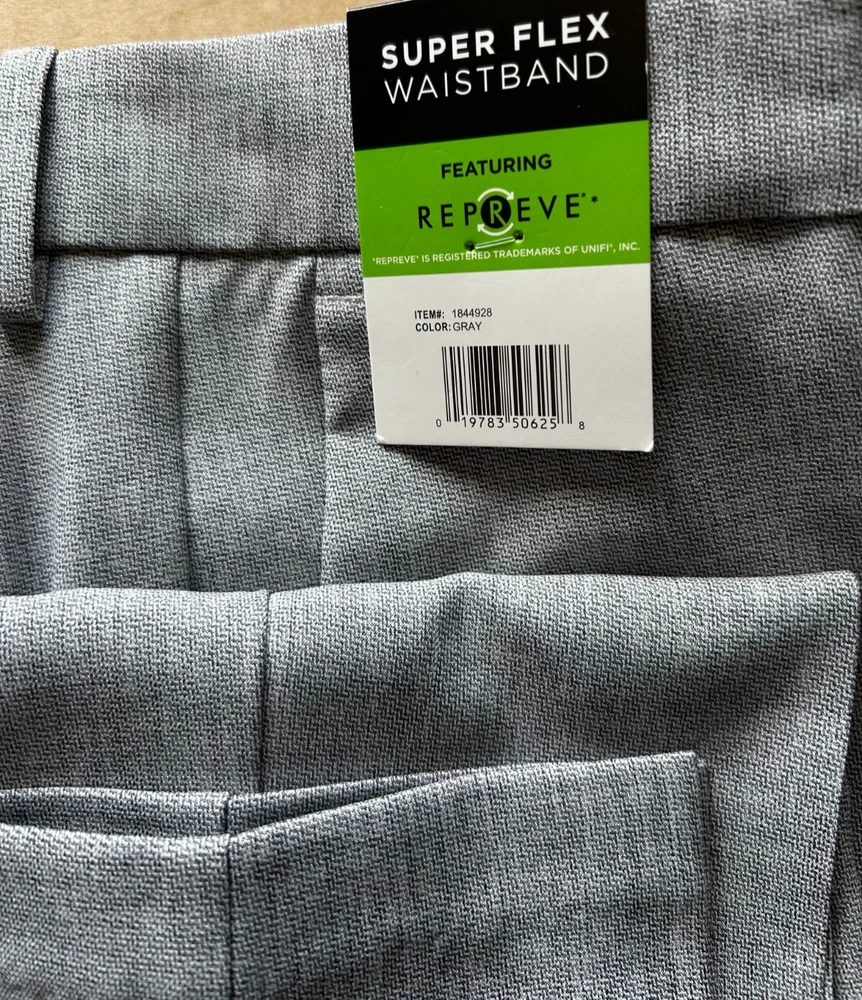 Features: Straight Fit 4-Way Stretch Fabric Haggar® Repreve recycled fibers Non iron Elastic waistband Button closure on back pockets Made in Bangladesh Content: 67% Polyester | 33% Recycled Polyester Approximate 166 GSM (4.9 oz.) fabric weight Lightweight