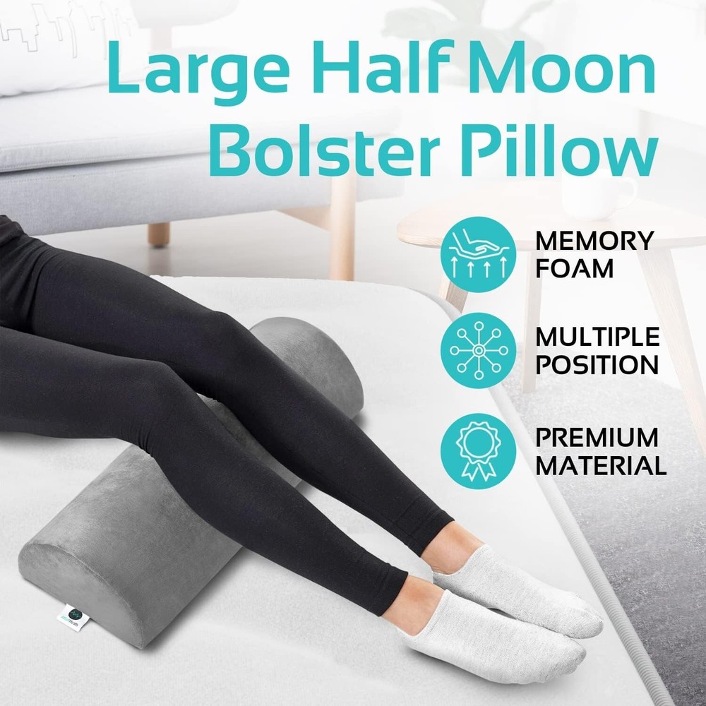 Large Half Moon Bolster Pillow For Legs, Knees, Lower Back And Sleeping On Back ULTIMATE BODY SUPPORT - Sleep through the night with the best support for your body, the half-moon bolster provides elevation for your head, feet, lower back, knees, hips, and legs, place the half-moon pillow where comfort is desired to help relieve pain. ORTHOPEDIC DESIGN- The comfortable half cylinder leg pillow supports knee, neck, back, leg, ankle, and hip joints to help proper spine and hip alignment, and to improve posture when lying down or sleeping. Please wait 12-24 hours for the pillow to fully expand and form. MULTI-POSITION SLEEPER BOLSTER - Help put sleepless nights behind you- Measuring 20.5" x 8" x 4.5" our moon pillow is created with a unique design to accommodate all sleepers, relieving pain for stomach, back, or side sleepers. knee pillow for back sleeper. MULTI-USE LEG PILLOW FOR LOWER BACK PAIN - Our knee pillows for sleeping can also be used as a comfortable lower back pillow for your bed or office chair to help provide lumbar back support, our bolster pillows can serve as the perfect armrest when lying or sitting on your couch. PREMIUM QUALITY BOLSTER AND COVER- Our half-moon memory foam leg bolster is made of extra firm, non-toxic memory foam that maintains its form. Included with the half-moon pillow is a stylish, grey cover which is removable and machine washable to provide hassle-free cleanup.