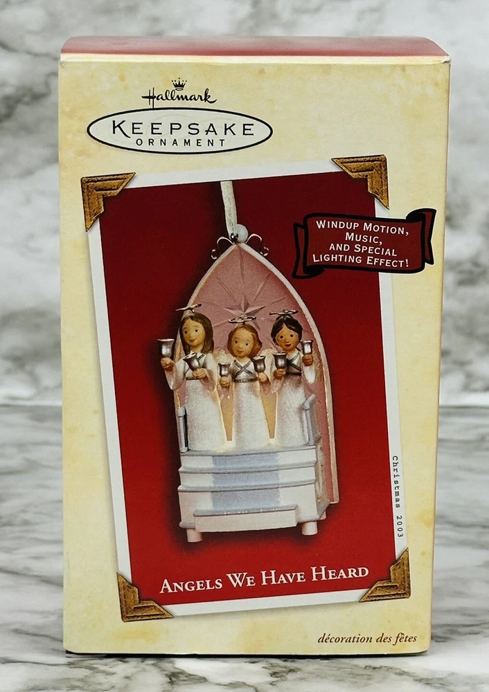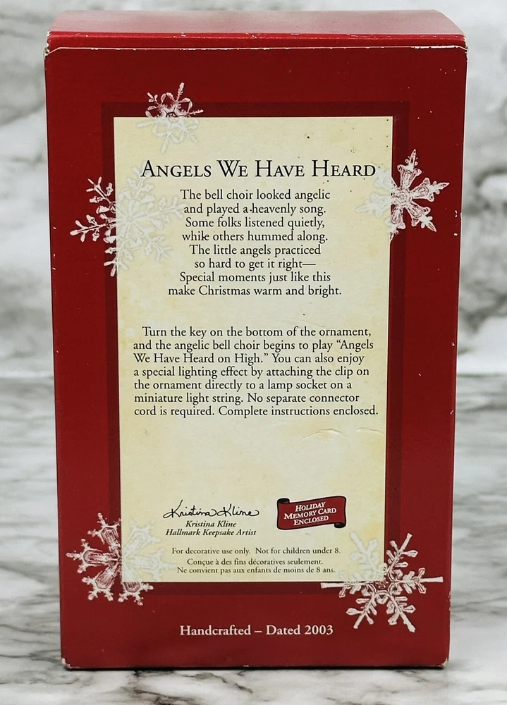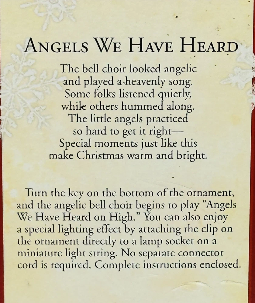 Hallmark 2003 Windup Angels We Have Heard Christmas Ornament Motion Music Boxed The music plays and the angels move their bells to the music. Missing the Holiday Memory Card and the instructions regarding the optional lighting effect. Good pre-owned condition. I ship next business day, but sometimes same business day and Saturday if order is paid for early enough. Please let me know if you have any questions. I am open to offers! Feel free to look at other items in my store. Thanks!