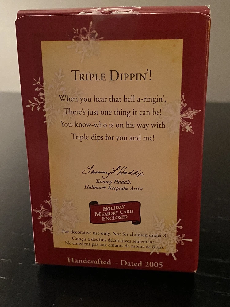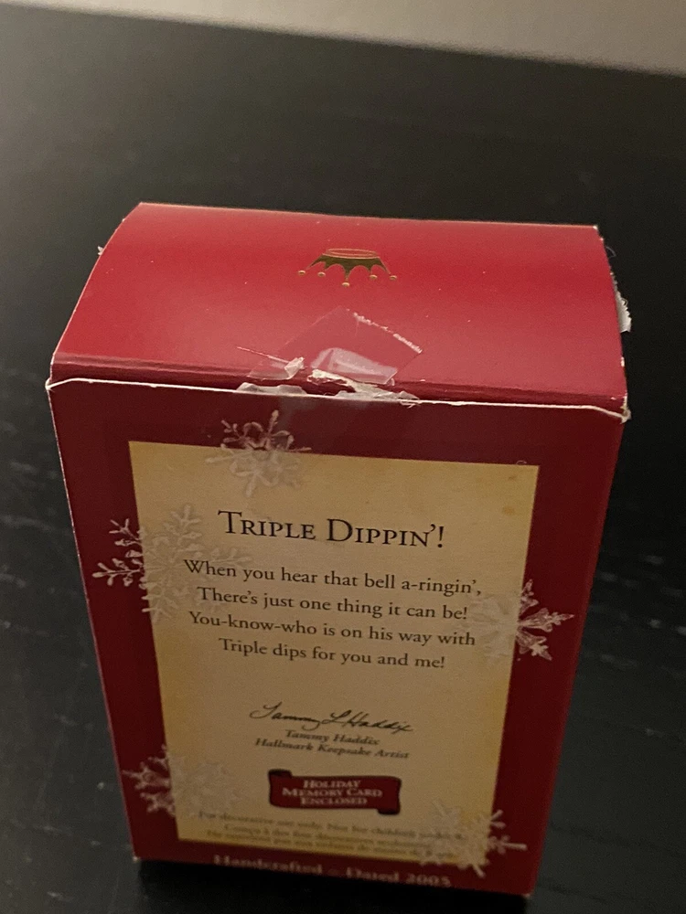 Hallmark 2005 Keepsake Ornament ~ TRIPLE DIPPIN'! Ornament is used, however, it is perfect condition. There is a Hallmark ornament hook taped to inside of box, box has previously been taped shut (see pictures). Nonsmoking household.