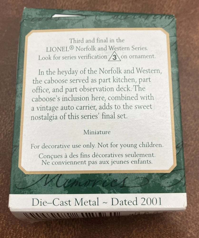 This Hallmark Keepsake miniature ornament set features a Lionel car carrier and caboose from the Norfolk Western collection. Made of diecast metal and measuring 3.25 inches in length. Box is in rough condition Please feel free to contact me with any questions you have