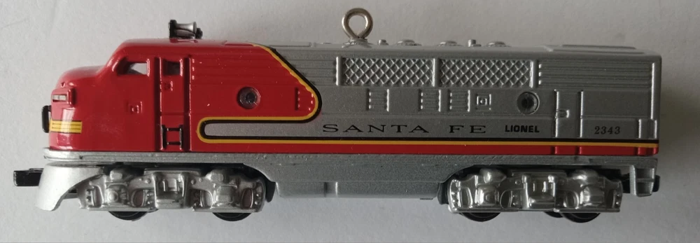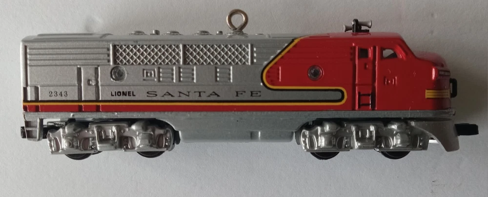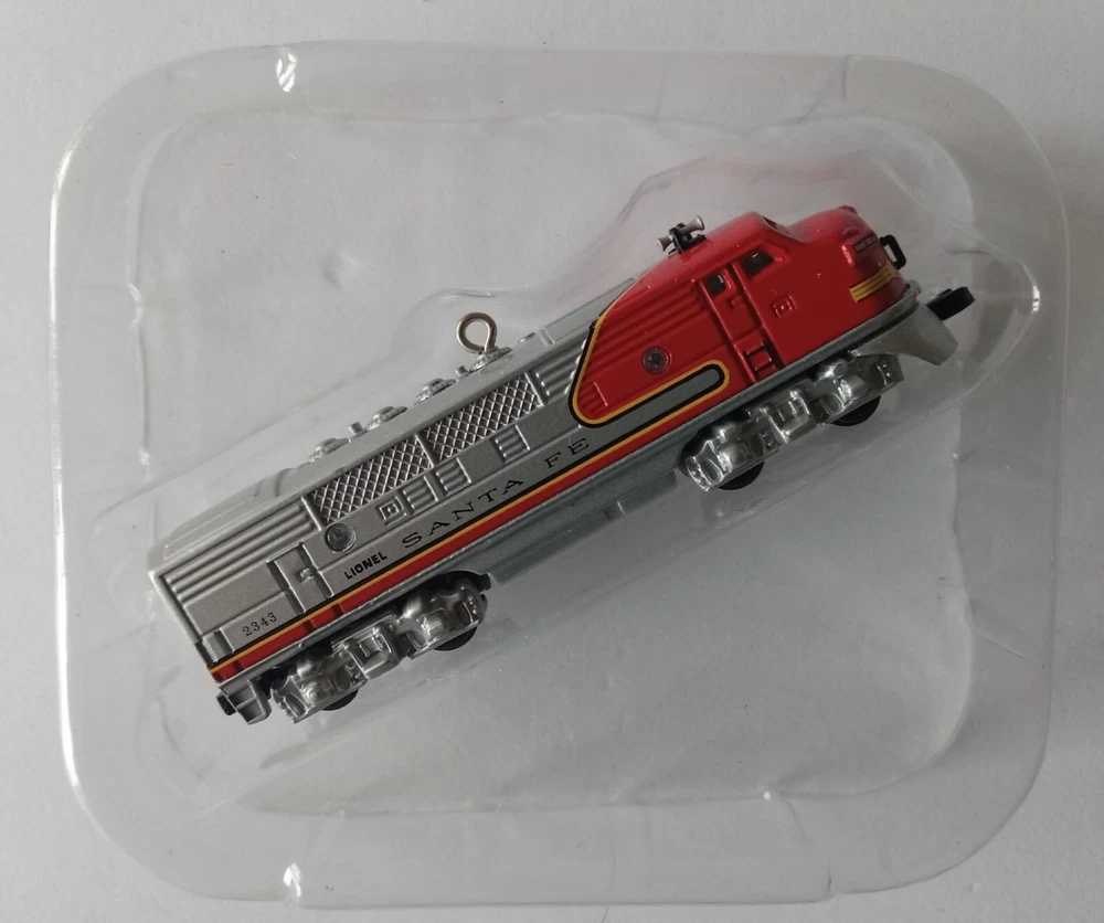 Hallmark Keepsake 1997 Santa Fe 1950 F3 Diesel Locomotive LIONEL Train Die-Cast Metal Christmas Ornament in Original Box with Original Packing Materials. The original box has a few VERY SLIGHT scuffs on some corners but other than that good condition. The train ornament in in perfect condition with no marks, stains, scratches, broken or missing parts. Additional photos upon request. Item will be shipped in safe and secure packaging. Remember, Electric Trains and Christmas just seem to go together.