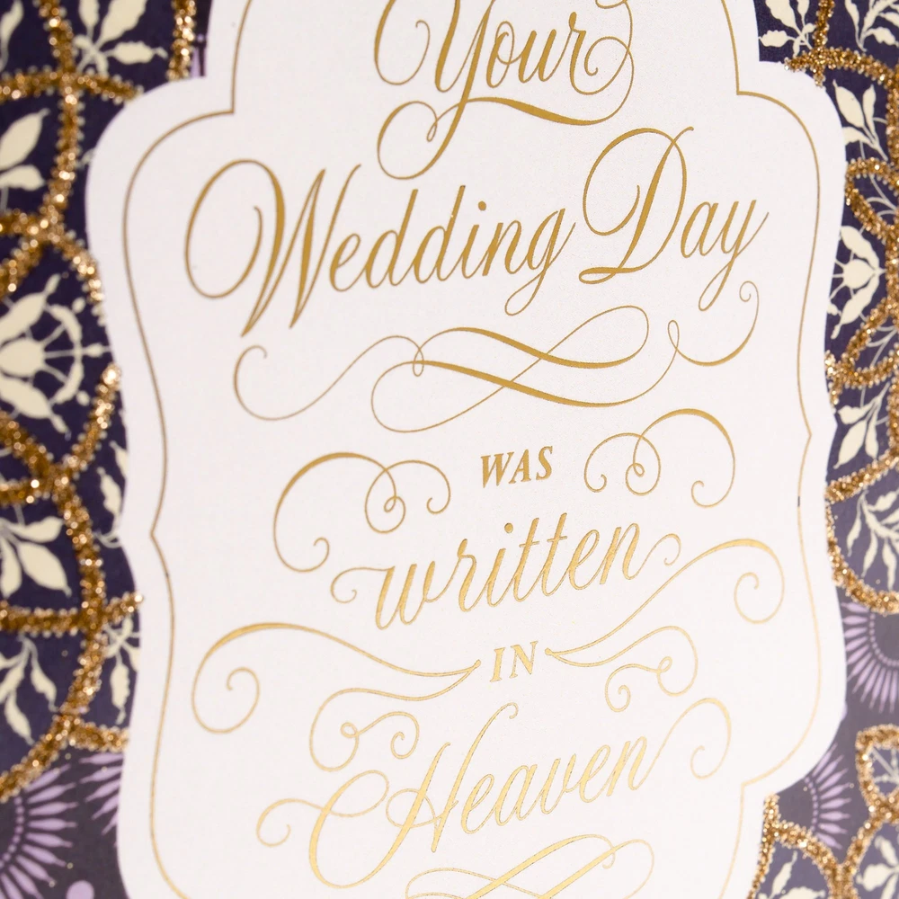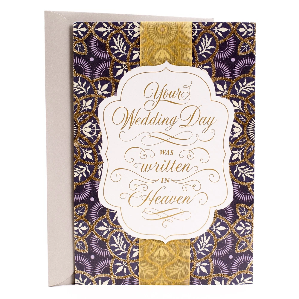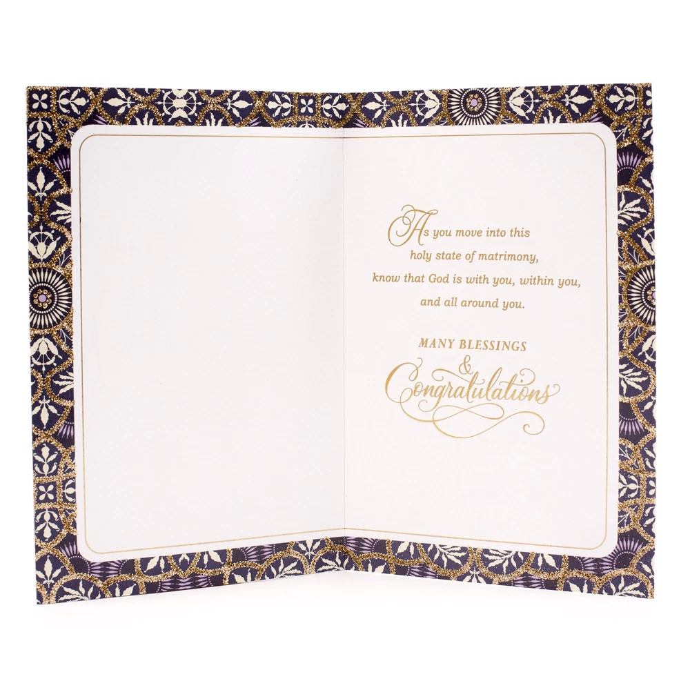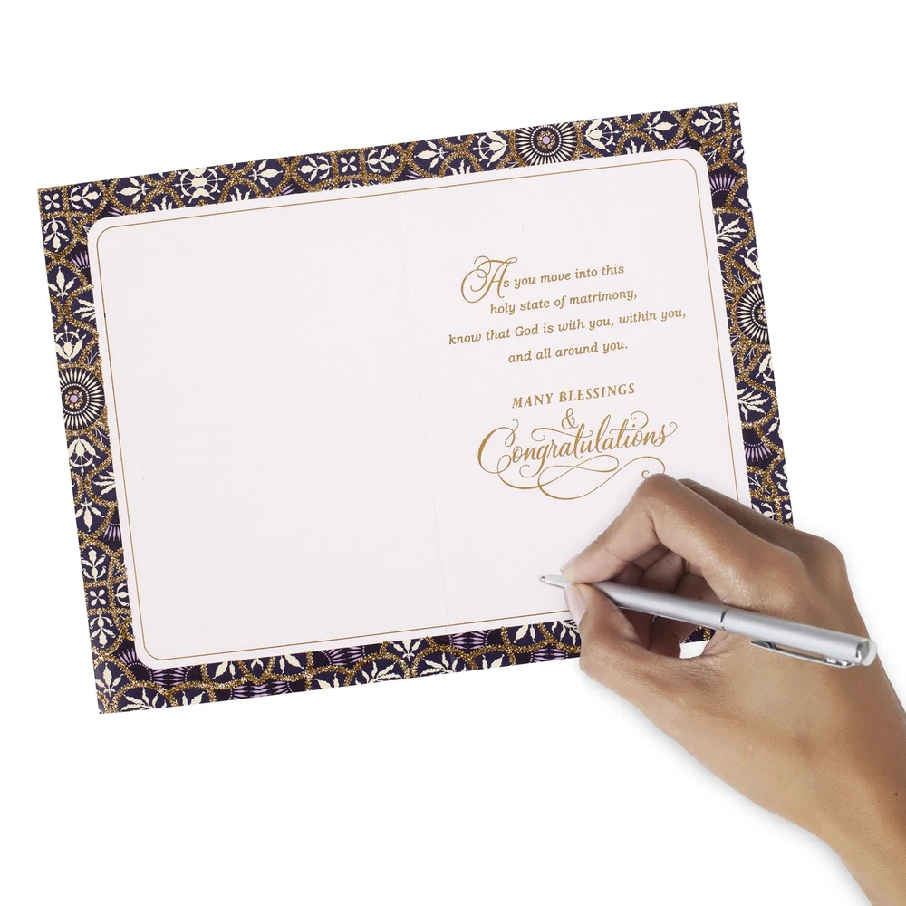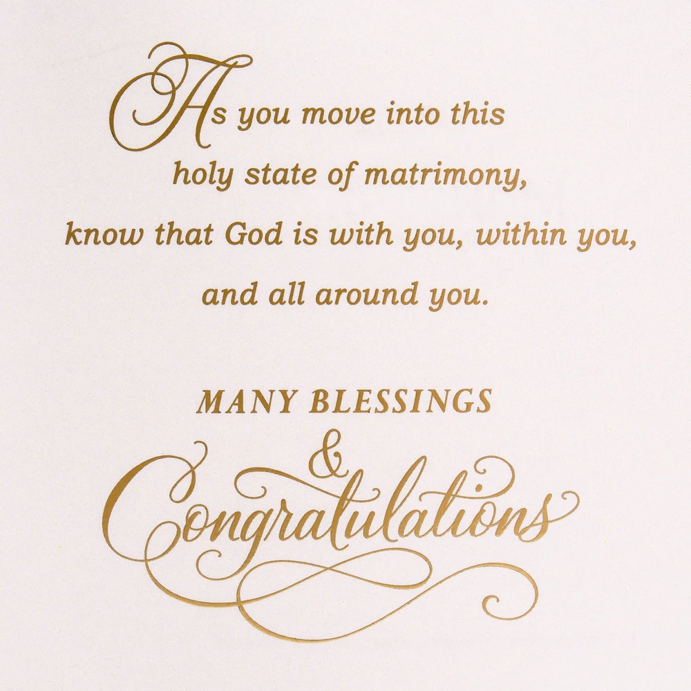 Wish the happy couple well as they embark upon the adventure of married life with this thoughtful card featuring gold ribbon and foil embellishments, and a prayerful message inside. Buy this card with confidence; the Hallmark brand is widely recognized as the very best for greeting cards, gift wrap, and more. Wish a very happy wedding day to friends or family with a card that's as special as they are. Cover features gold foil script and a shimmery gold ribbon. Inside message reads, "As you move into this holy state of matrimony, know that God is with you, within you, and all around you. Many Blessings & Congratulations." Includes one card on premium quality paper and one white envelope. Card measures 5.8" x 8.3". All Hallmark cards are made with paper from well-managed forests.
