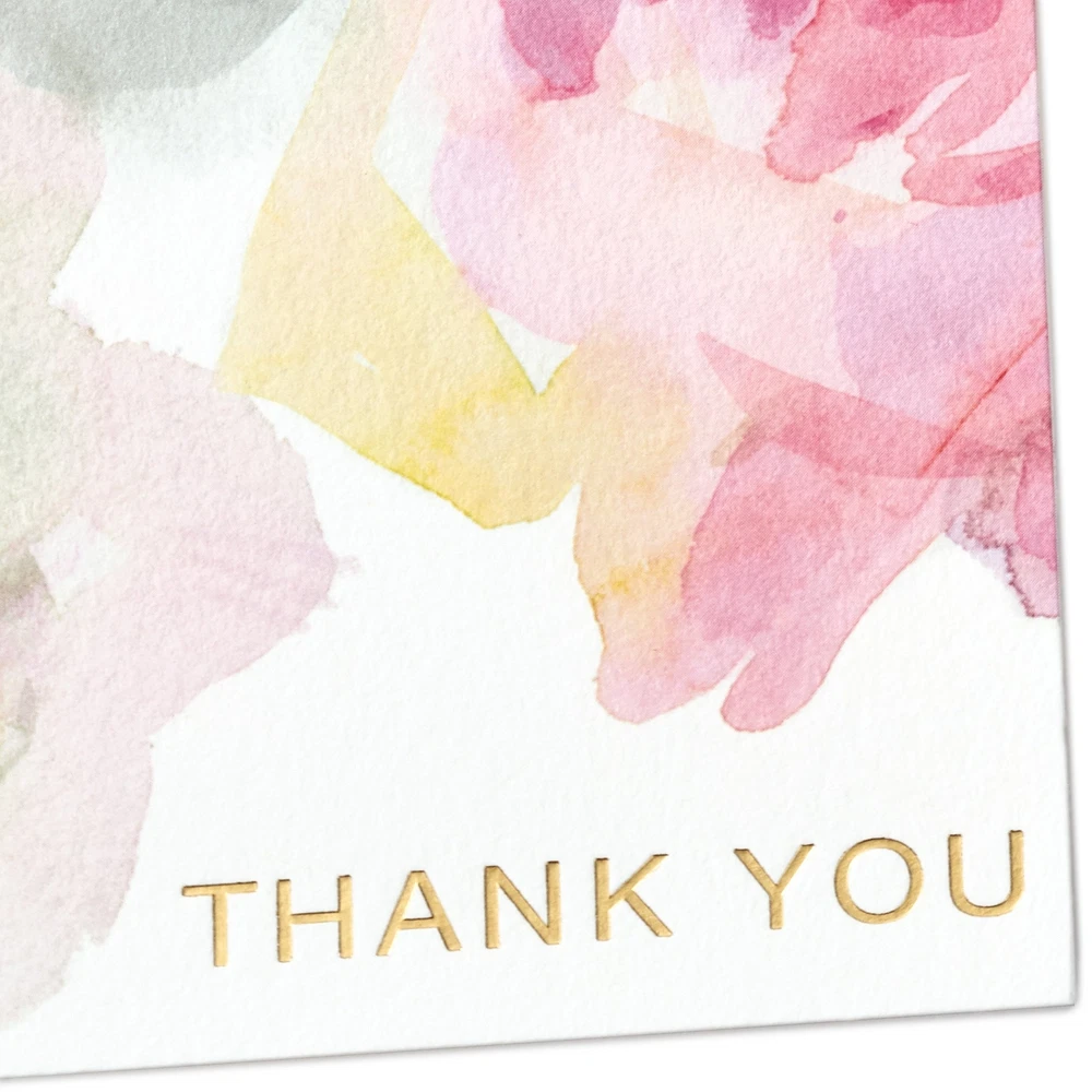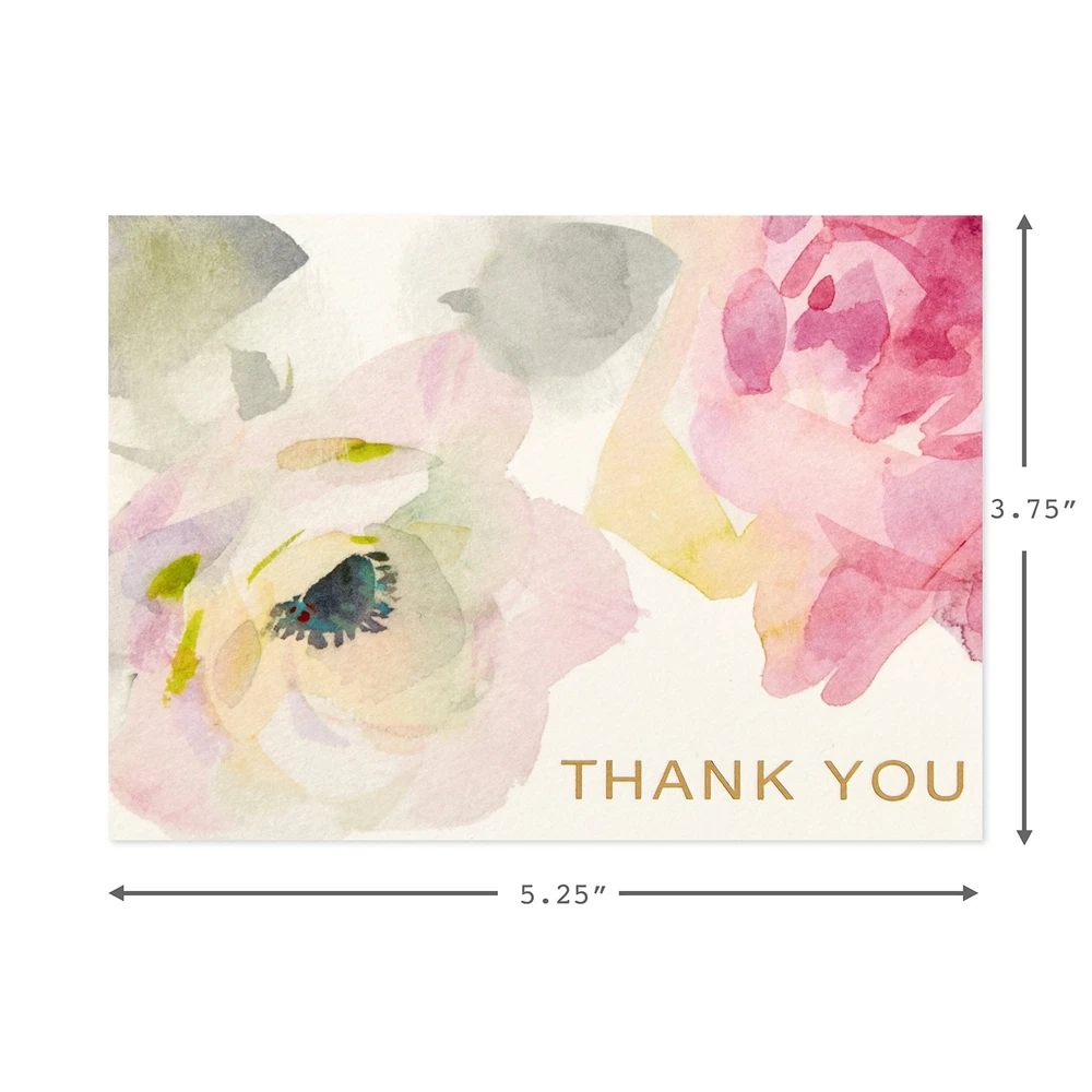 Send a heartfelt thank you note to friends or family with these sophisticated note cards. All the cards in this boxed set are blank inside, giving you plenty of space for writing a personalized message. A handwritten note of appreciation can make someone's day, and these thank you cards are sure to delight anyone. A perfect addition to your stationery supply. The Hallmark brand is widely recognized as the very best for greeting cards, gift wrap, and more. For more than 100 years, Hallmark has been helping its customers make everyday moments more beautiful and celebrations more joyful. Let your friends, family, and business connections know you appreciate them with this boxed set of classic, beautiful thank you cards, appropriate for all occasions. Classic folded cards feature pink watercolor roses and gold foil block lettering. Sophisticated thank you cards are a charming way to send a note of thanks after birthdays, weddings, baby showers, or job interviews. Pack includes 10 cards with coordinating envelopes. Notecards are blank inside and measure 5.2" x 3.75". Printed on high quality paper stock, Hallmark stationery is made with paper from well-managed forests.