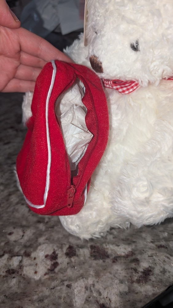 Animal:TEDDY BEARCharacter Family:TEDDY BEARUPC:DOES NOT APPLYBrand:HallmarkColor:WHITE REDgtin13:DOES NOT APPLYFeatures:HEART ZIPPER POCKET POUCHSize:14"Occasion:Valentine's Day