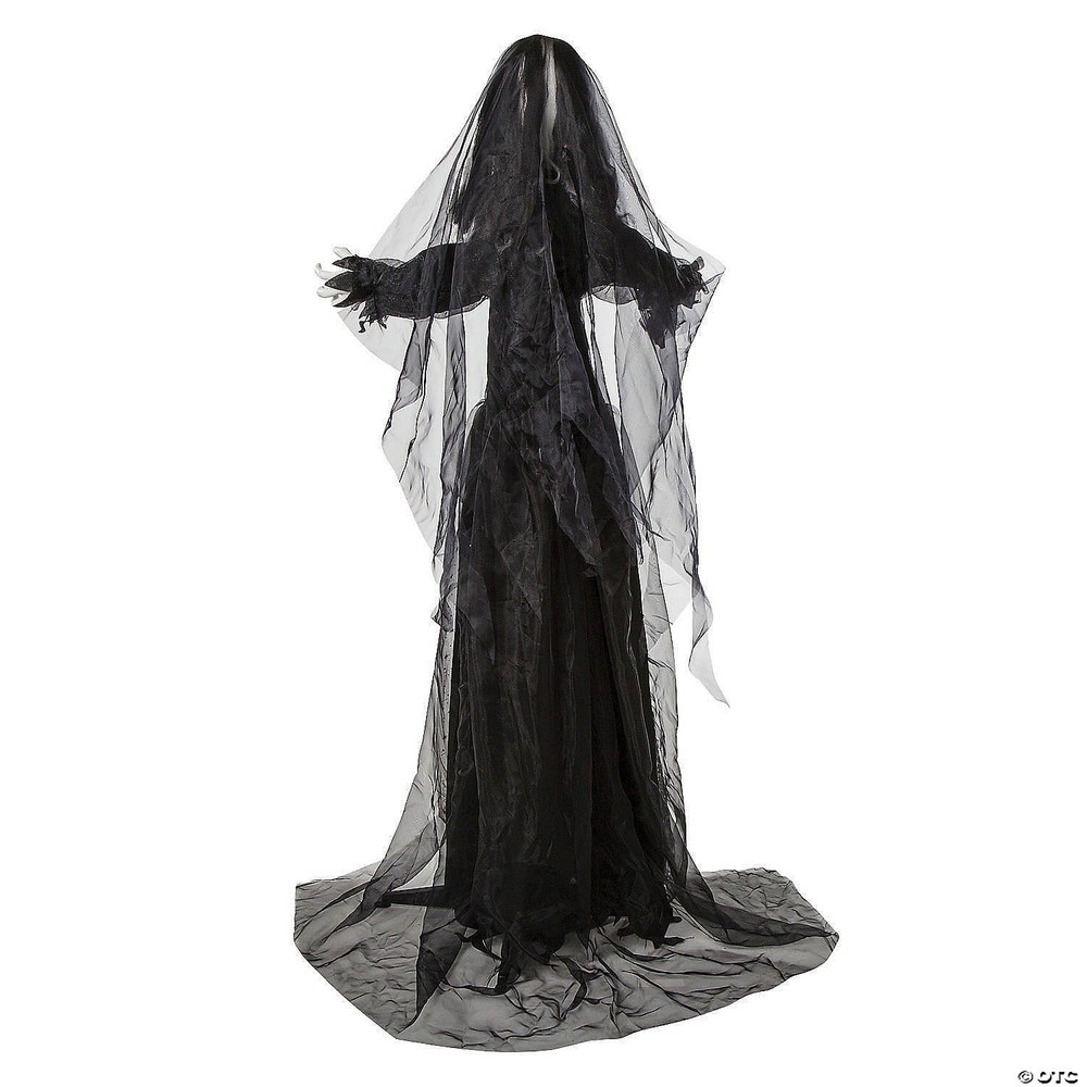 ENHANCE YOUR FRONT YARD DISPLAYS: Use our selection of decorations to create eye-catching and spooky scenes in your front yard to entertain and delight trick-or-treaters and passersby. ADD A TOUCH OF FRIGHT TO GARDEN DECOR: Incorporate seasonal decorations into your garden or landscaping, adding a touch of Halloween spirit to your outdoor spaces. WELCOME GUESTS WITH A HAUNTED ENTRYWAY: Position decorations near your home's entrance to greet guests and trick-or-treaters with a festive touch as they approach your door. EXCEL AT NEIGHBORHOOD COMPETITIONS: Participate in neighborhood decorating competitions, showcasing your creativity and enthusiasm for the Halloween season by displaying these bewitching decorations throughout your yard. Product Description: This haunting figure is dying to walk down the aisle! The animated bride features a black dress adorned with sparkles and a large silver flower at the waist along with a gauzy black veil that covers her black and white hair. Her eerie face has sunken eyes, and her hands creepily reach for passersby. Frighten and delight trick-or-treaters and party guests with this standing Halloween decoration in your front porch or haunted house display. Batteries required.