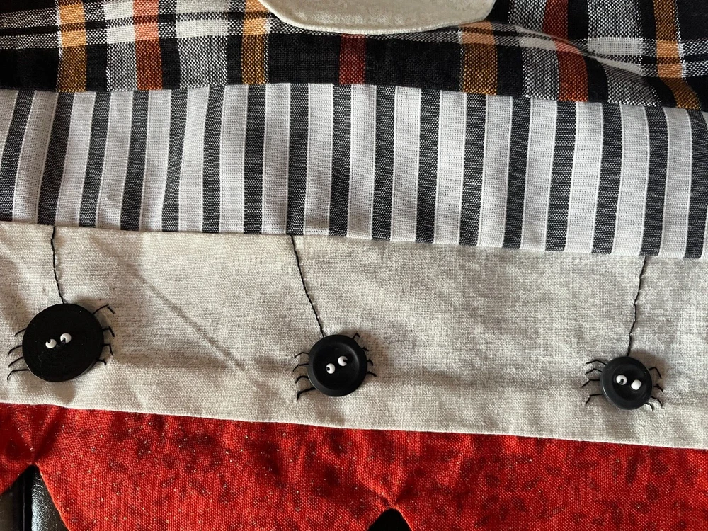 Brand new. Two pockets in the style of candy corn and button spiders along the bottom. Front waist measurement is 18.5” without ties, 78.5” tie end to tie end. Length measures 18” waist to scallop end.
