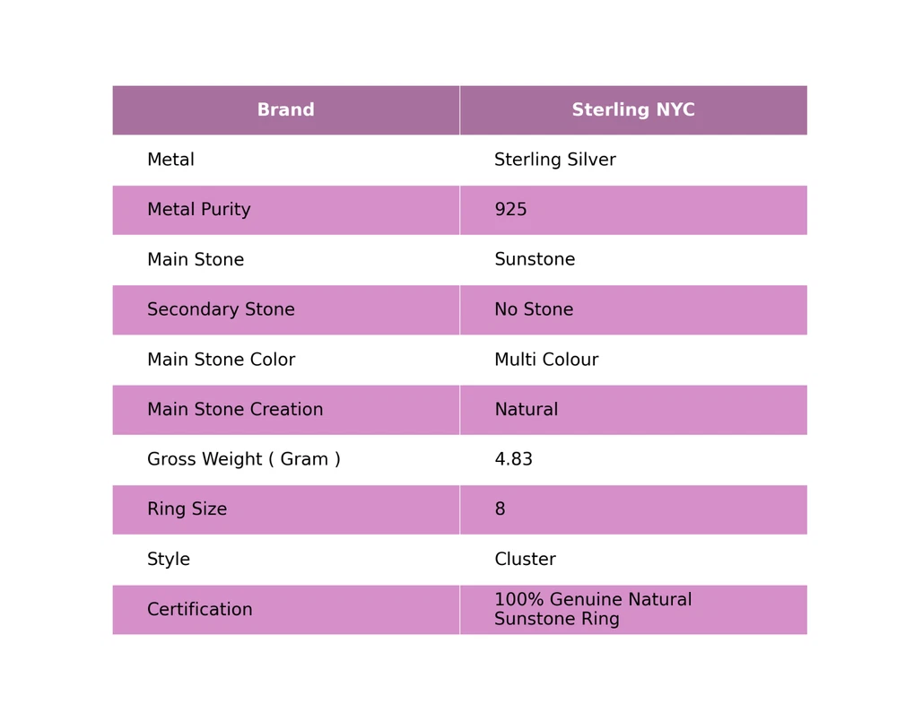 Welcome to Sterling NYC Natural Sunstone Gemstone Cluster Ring Size 8 925 Sterling Silver For Women Handmade Ring, Sterling Silver Ring, Sunstone Ring, Handcrafted Ring Specifications:- SKU : JS-62062 Gemstone : Sunstone Stone Shape : As Seen In Picture Metal Purity : 925 Sterling Silver Ring Size : 8 US Adjustable : ----------------------------------------------------------------------------------------------------- Experience the timeless allure of silver jewelry, a cherished choice known for its exceptional properties and countless rewards. Explore the captivating charm of its unique attributes, enveloping you with elegance and remarkable healing qualities. Immerse yourself in the enigmatic world of silver, where beauty and benefits harmoniously intertwine. Benefits: Embrace the Elegance : Silver jewelry seamlessly blends accessible luxury with timeless beauty, elevating any jewelry collection without the need for extravagant spending. A Mindful Companion : Adorn yourself with silver jewelry as a gentle nudge towards mindfulness, a tangible reminder to cherish the beauty of every moment. Amplify Positivity : Silver, known for its energy-conducting qualities, is thought to enhance the power of positive intentions and affirmations, aiding in the clear manifestation of your desires. Unleash Self-Expression : Silver jewelry, with its versatile designs, empowers individuals to express their unique style, allowing their personality to shine through every piece. Soothing Serenity : Silver's cooling properties are believed to have a therapeutic effect, bestowing a sense of relief and tranquility upon both body and mind. ----------------------------------------------------------------------------------------------------- For Mother's Day Gift For Father's Day Gift For Promise For Valentine' Day For Halloween Party For Christmas Day Gift For New Year Party For Mom For Her ----------------------------------------------------------------------------------------------------- Discover the impeccable designs tailored just for you, and receive personalized guidance by reaching out to us. Our skilled artisans meticulously handcraft each piece in our workshop, infusing them with love and unwavering attention to detail. Your visit holds immense significance to us, and we are committed to ensuring that your shopping experience is nothing short of exceptional. Thank you for choosing us; we sincerely hope you thoroughly enjoy your shopping journey. Happy shopping! ----------------------------------------------------------------------------------------------------- At SterlingNYC, exquisite craftsmanship meets premium sterling silver gemstone jewelry. Our handcrafted pieces reflect authenticity and uniqueness, a testament to our commitment to excellence. Explore our collection and create your own dazzling jewelry ensemble.