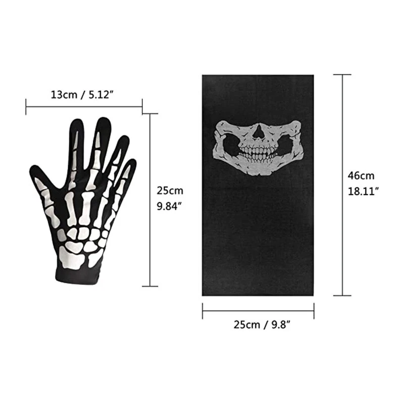 Halloween Skeleton Gloves and Skull Face Set Haunted House Bar Party Features: and high The skeleton gloves and skull face are high cloth material, it is soft and comfortable, wear size: The moderate size and in black and white are suitable for most people, adults and children can use them. Wide use: Skull face can be used as scarves, hats, headband and other applications. The gloves can be used for Halloween party costumes and photo accessories. Halloween party supplies: Black background printed white skeleton bone, and realistic,it is a good choice for Halloween party. Great It is a great set for Specifications: Cloth Skeleton Gloves: approx.25x13cm/9.84x5.12in Skull Face approx.46x25cm/18.11x9.80in Color: As the picture shown Quantity: 1Pc Package Includes: 1Pairx Skeleton Gloves 1xSkull Face (other accessories in the picture is not included.) note: Please allow 0-1cm error due to manual measurement. pls make sure you do not mind before you bid. Due to the difference between different monitors, the picture may not reflect the actual color of the item. Thank you!