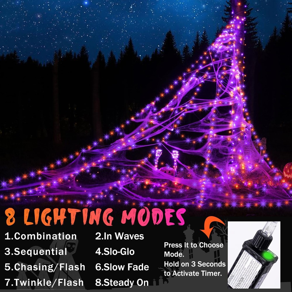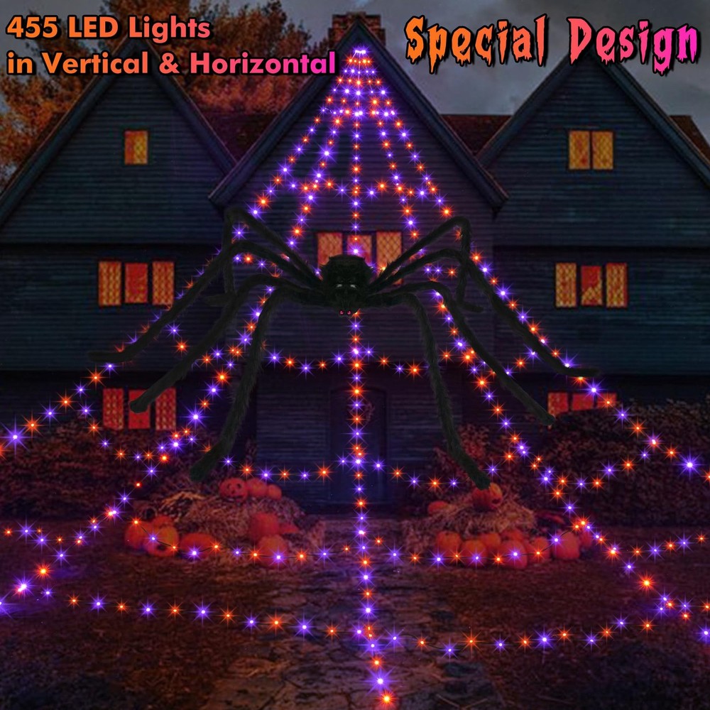 Halloween Spider Web Lights Halloween Spider Web Kit: Capture the spirit of the Halloween season with our 455 LED giant spiderweb! This super-sized 16.4 ft Length x 15.7 ft Width light up Halloween spider web lends a spooky & funky glow to the yard it's placed in. jumbo creepy spider (59" W)with red eyes rest on the web as they watch for trick-or-treaters, friends, or family members to scare. Comes with a large amount of super stretchable cobweb (covers over 350 sq.ft.), flexible to be pulled into any shapes you want. Made Of High Quality: Triangular spider web has lights in horizontal and vertical, unique packaging method and product design that makes it can be opened in a few minutes and won't be tangled. The Halloween spider made of realistic black soft plush materials with adjustable legs, the scary red eyes and large hairy body look very vivid. And decorated with super stretch cobweb, made of soft material, can be stretched and shaped to fit your desired Halloween display. 8 Lighting Modes: The Halloween spider web lights have 8 different light patterns, which is perfect for creating a festive atmosphere: Combination, In Waves, Sequential, Slo Glo, Chasing/Flash, Slow Fade, Twinkle/Flash, Steady On. You can easily set up the lighting modes through pressing the round button on the adapter to light up a spooky and funky holiday atmosphere for your Halloween decorations. Timer & Memory Function: The Halloween lights will be 6 hours on and 18 hours off automatically each day, so you won't even have to turn the lights off yourself after a night of enjoyment! Long press 3s until the green light on, then the timer is activated; Memory: The adapter built-in memory chip will save your last mode setting and there is no need to reset the mode each time. Safer & IP65 Waterproof: 4.5 V low voltage design makes the halloween lights spiderweb touchable while working and safe to use. These purple & orange halloween light is IP65 highly waterproof rank, which is able to maintain professional display even in harsh weather conditions, can be used for outdoor or indoor decor. Outdoor Halloween Spider Decorations - Perfect Halloween decor for Halloween themed party, masquerade, and costume party, bar and house of horrors! Easy to set up, just hook top of the web to a high area, such as a gutter or tree limb, spread web out, and secure with ground stakes (five included). The pre-lit spider web also comes with a 20 ft lead cord to make it convenient and safe. You can put them on the tree, yard, lawn, stairs, beam, outdoor, indoor and anywhere you want to decor.Outdoor
