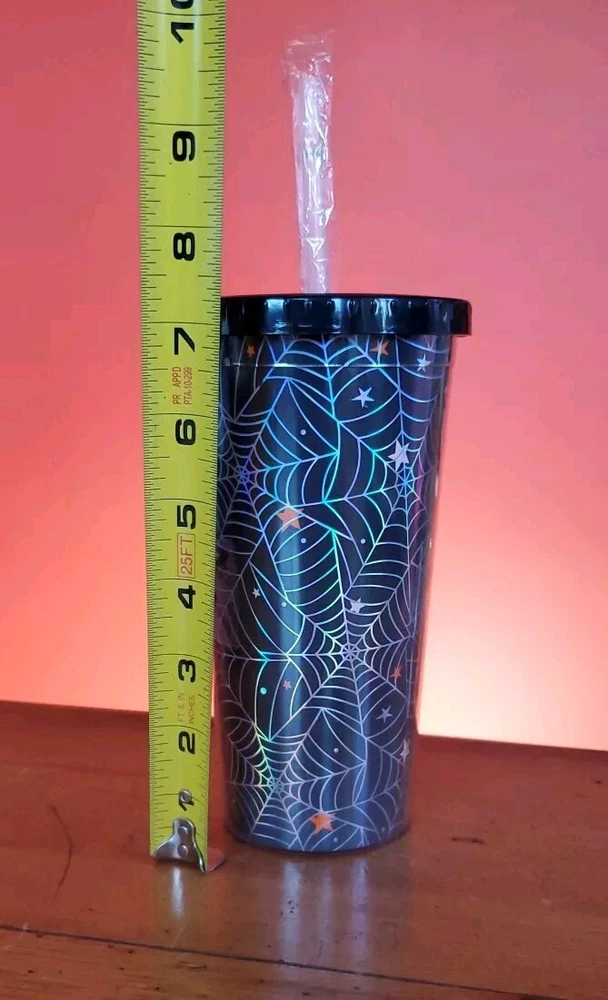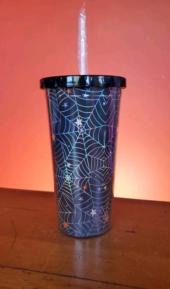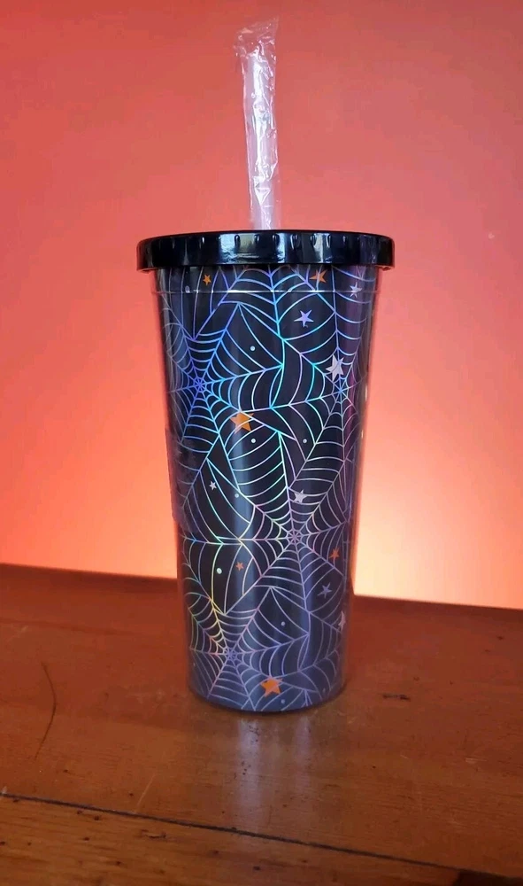 Halloween Spider Web Tumbler Plastic BPA Free Screw On Lid And Straw New condition never used Halloween spider web tumbler with screw on lid Does have a couple of cracks in outer clear plastic but does not affect the function (see pictures) but hard to see with the spider web design Also has a sticky patch where the label was which I'm sure will wash off with soapy water Thanks for looking Lot