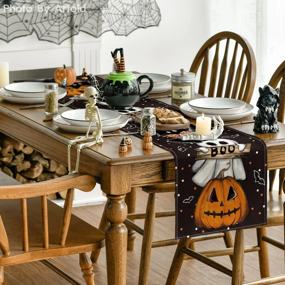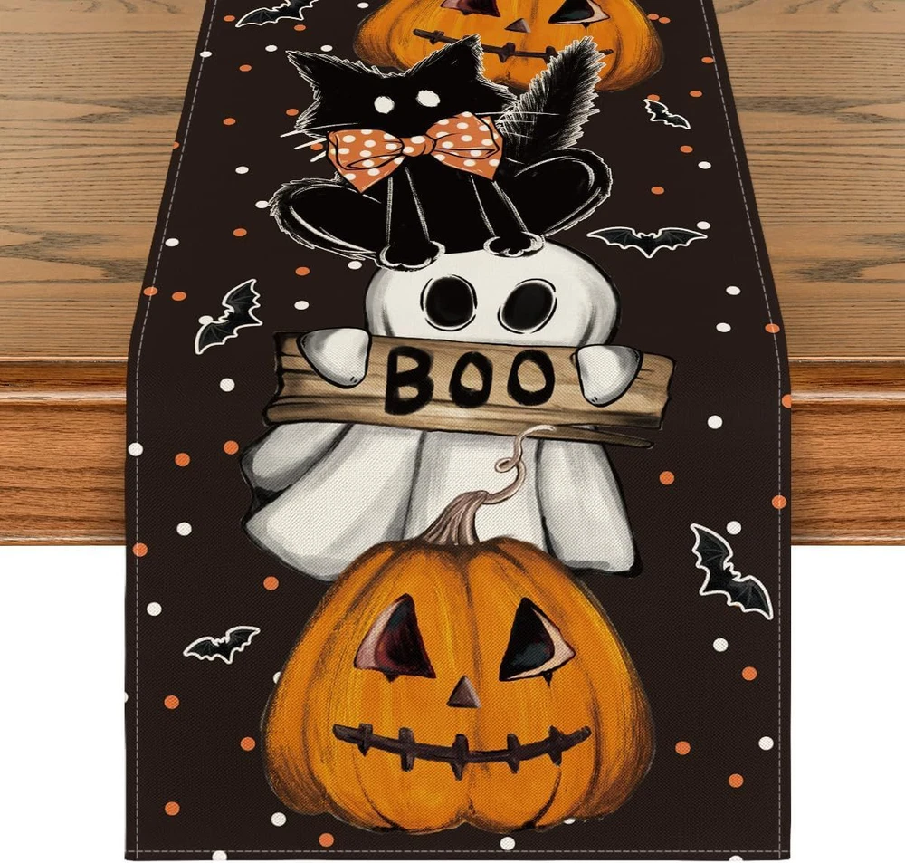 Artoid Mode Polka Dot Ghost Pumpkin Cat Boo 13" x 72", Table Runner, Black Product Details Style: Modern Product Care Instructions: Machine Wash Product Dimensions: 72"L x 13"W Manufacturer: Artoid Mode Item Weight: 3.2 ounces Country of Origin: China Item model number: TableRunner Fabric Type: Polyester Number of pieces: 1 Batteries required: No Import: Imported Color: Black Material: Polyester Size: 13" x 72", Table Runner Brand: Artoid Mode Pattern: Polka Dot Polyester Imported High Quality & Durable : Made of 100% spun polyester, sturdy sewing, soft and durable, protecting your table's surface from hot pans, scratches, and spills Bright Home Decor : Add flair to your home decor with Artoid Mode colorful table runners. Perfect for kitchen dining daily use themed party decoration, holiday and special events celebration Fits Table Size : This table runner is 13 x 72 inch, appropriate for a table that can seat 4-6 people, better match your table and give you a delightful dining experience Easy to Clean : Machine wash and lay the table runner flat to dry. Stays the same and as new after every wash. Material: 100% Polyester, no shrink, no fading. Imported, Country of origin: China Designed with You in Mind : Artoid Mode table runners are designed by professionals. Vibrant color and unique pattern print offers you creative and unique idea to decorate home
