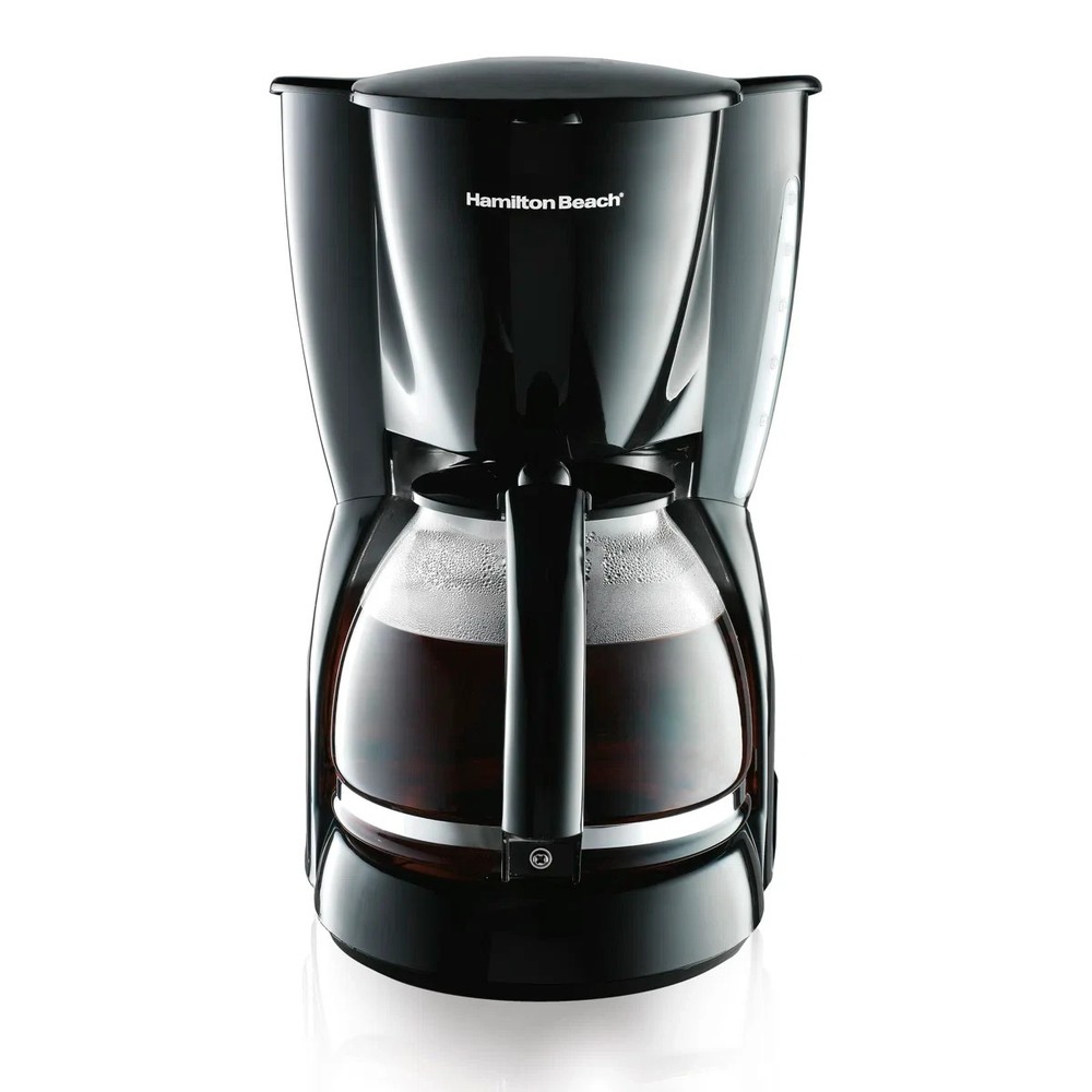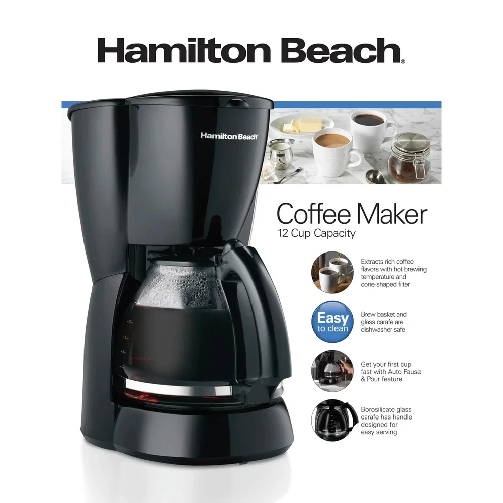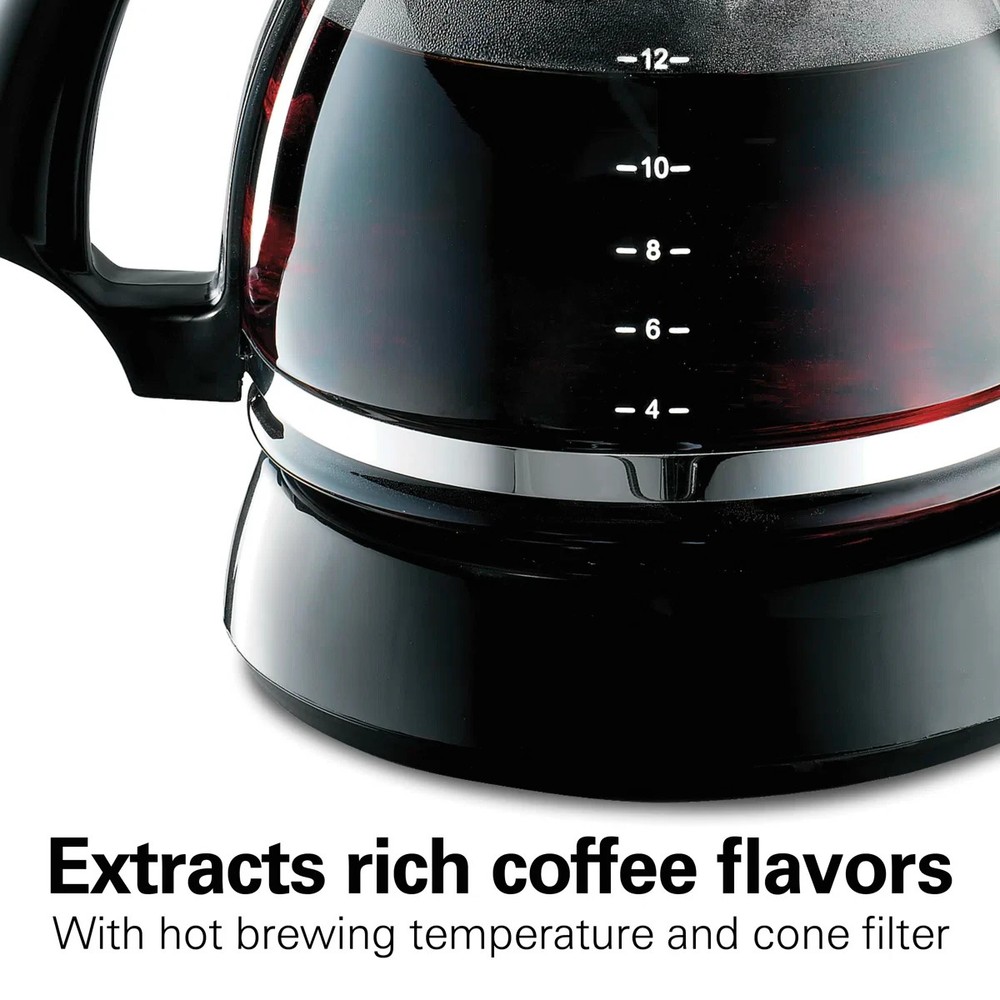 The Hamilton Beach® 12 Cup Coffee Maker extracts coffee's rich flavor with its hot brewing temperature and cone-shaped filter. The cone shape allows water to flow more evenly through ground coffee for great flavor extraction. The coffee maker comes with a sample pack of #4 cone filters. The removable, cone-shaped brew basket and glass carafe are dishwasher safe for easy cleaning, and the nonstick warming plate easily wipes clean. The Auto Pause & Pour feature automatically stops the flow of coffee so you can sneak a cup while the coffee's still brewing without making a mess. The water reservoir has a large easy-view window that lets you see the exact water level from the front of the coffee maker. The durable borosilicate glass carafe has a handle designed for comfortable pouring and measurement markings for accurate filling. The coffee maker is simple to use. Just add coffee, water, and brew with the push of a button to make up to 12 cups of great-tasting, hot coffee at home. The switch has a light that illuminates when the coffee maker is on to remind you to shut it off.
