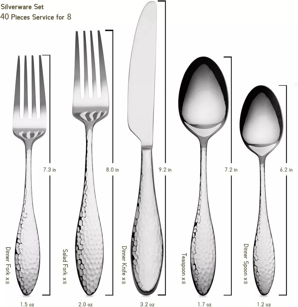 Product Description Emma 40-Piece 18/10 Silverware Set, Hammered Flatware Set, Heavy Duty Stainless Steel Cutlery Set, Modern Kitchen Utensils, Dinnerware Sets Service for 8, Mirror Polished & Dishwasher Safe 18/10 Stainless Steel: The 18/10 material gives this silverware set a more textured texture, and the heavy handle is more sturdy. Don't worry about bending. The curve of the handle conforms to the line of the hand, making this cutlery set more comfortable to hold when using Hammered Patterns: The handles of this spoon and fork silverware set have a beautiful hammer pattern, which is hand-hammered by artisans. The unique irregular pattern will bring you a different dining experience Flatware Set For 8: Set includes 8 each: dinner knife, dinner fork, salad fork, dinner spoon and teaspoon. This silverware set is great for daily use. Works well with modern and traditional table settings and complements any stemware of dinnerware Multiple Occasion: The cutlery set not only for daily use, but also for party, holiday, wedding, gathering and camping, or for buffets and banquets at restaurants and hotels. It's also a wonderful choice as a gift for your friends or lover Warm Tips: Mirror flatware never needs polishing. Hand wash recommended, dry them before storing to prevent water spots or potential corrosion. Do not use steel wire brush, hard sponge,cleaning cloth or any other hard-material cleaning tools for cleaning to avoid damage to the silverware About Us We are a reputable seller with many years of experience selling on eBay. Our goal is to provide high-quality products and excellent customer service. Payment 1.We accept PayPal only. 2.All major credit cards are accepted through secure payment processor PayPal. 3.Payment must be received within 7 business days of auction closing. 4.We ship to your eBay or Paypal address. Please make sure your eBay and Paypal address is correct before you pay. Feedback will be left automatically after we receive your feedback. Please contact us before leaving a Negative feedback or Neutral feedback. We would try our best to help you solving any problem. Shipping Items will be shipped within 1-3 business days when we received payment. (Orders are not processed on weekends & holidays) Tracking information will be sent once item is shipped. Delivery time depends on destination and other factors Item is shipped to ebay address. Leaving correct address can minimize delay. For international shipping and shipping to Guam, Hawaii and Alaska, Please contact us before placing the order. International buyers please note: Import duties, taxes and charges are not included in the item price or shipping charges. These charges are buyer’s responsibility. We will try our best to reduce the risk of the custom duties. Local pick-up is unavailable at the moment. Returns For any issues with Defects, Return, Item Exchange request, please contact us first and send us a message first before opening any type of case or request. We devote ourselves making EVERY CUSTOMER in 100% Satisfactory and resolve any problem. We highly value and appreciate your business. Thank you. No returns will be accepted without an RMA number. Please contact us for the RMA number. Return is acceptable within 30 days of delivery. Return for replacement or money back is optional. Returned items must be in the brand new, unaltered and resalable condition. Seller is not responsible for any labor cost, expense in a dealer store, or damage due to wrong installation. Contact Us We reply any email messages within 1 business / working days(off-duty at weekend). If you do not get a response from us, then please check your junk or spam mailbox. Our Business hours: Mon-Fri 9:00-18:00, UTC/GMT +8 hours. Please contact us either by clicking "contact seller" in the "purchase history" section or simply click "ask a question" at the bottom of this page. If you are unsatisfied with our item or service, please contact us before leaving any feedback. We are committed to resolve all issues in a friendly and satisfactory manner. powered by