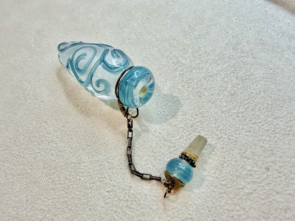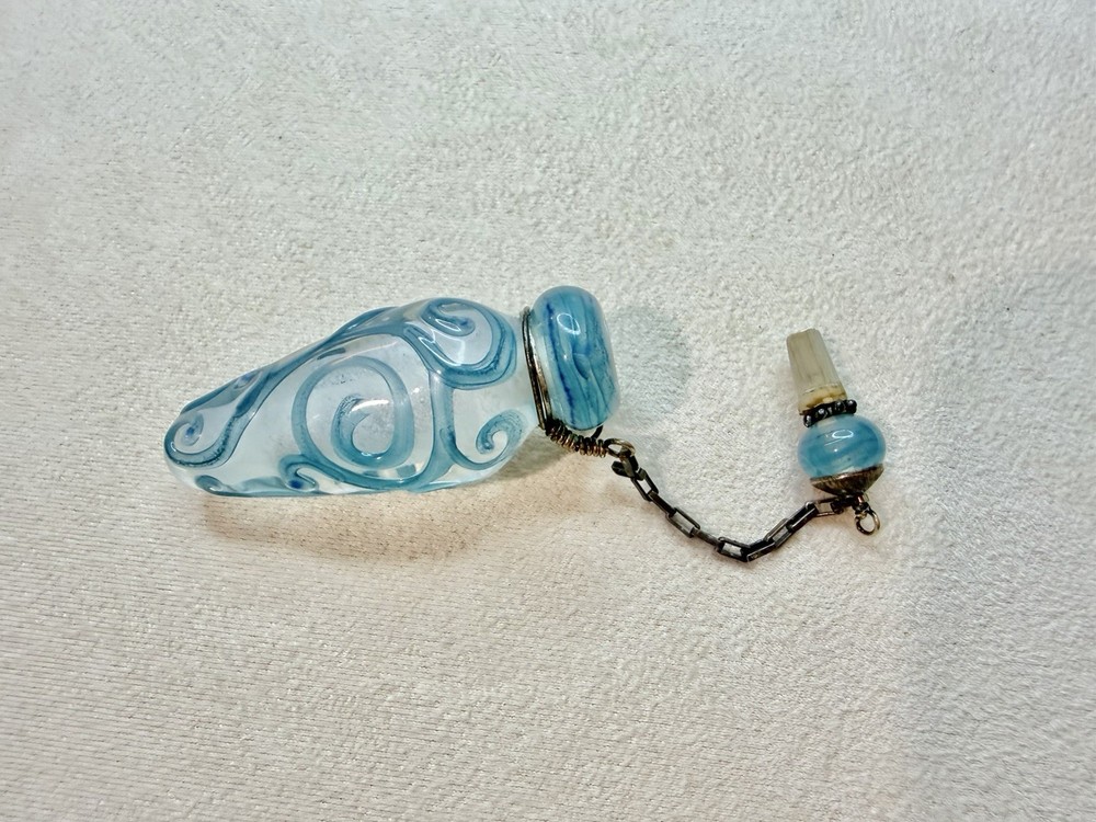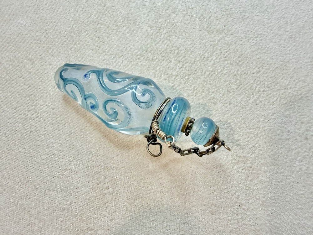 The Vintage Hand Blown Teal Glass Urn Pendant by Rebecca Moore Lampwork Art Jewelry is a unique and artfully crafted piece of handcrafted jewelry. Made with high-quality glass materials, this pendant features a beautiful teal color with pink hues, giving it a distinct and stylish look. The lampwork technique used by Rebecca Moore adds a touch of artistic flair to this piece, making it a standout accessory for any jewelry collection. Perfect for those who appreciate artisan craftsmanship and one-of-a-kind designs. Features shimmering teal blue glass with raised floral details and subtle silver sparkle within.Very nice gift.
