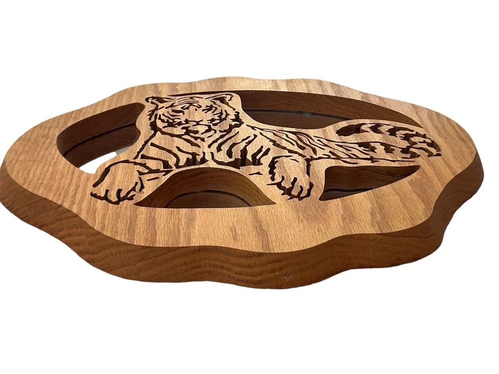 Beautiful and unique, this vintage, hand crafted wooden tiger mirror is not only one of a kind, but excellent quality. Comes with its original tag. Made from oak wood by Wildwood Crafts in Idaho. Measures 15” by 12” and is a little under an inch thick. Excellent condition.