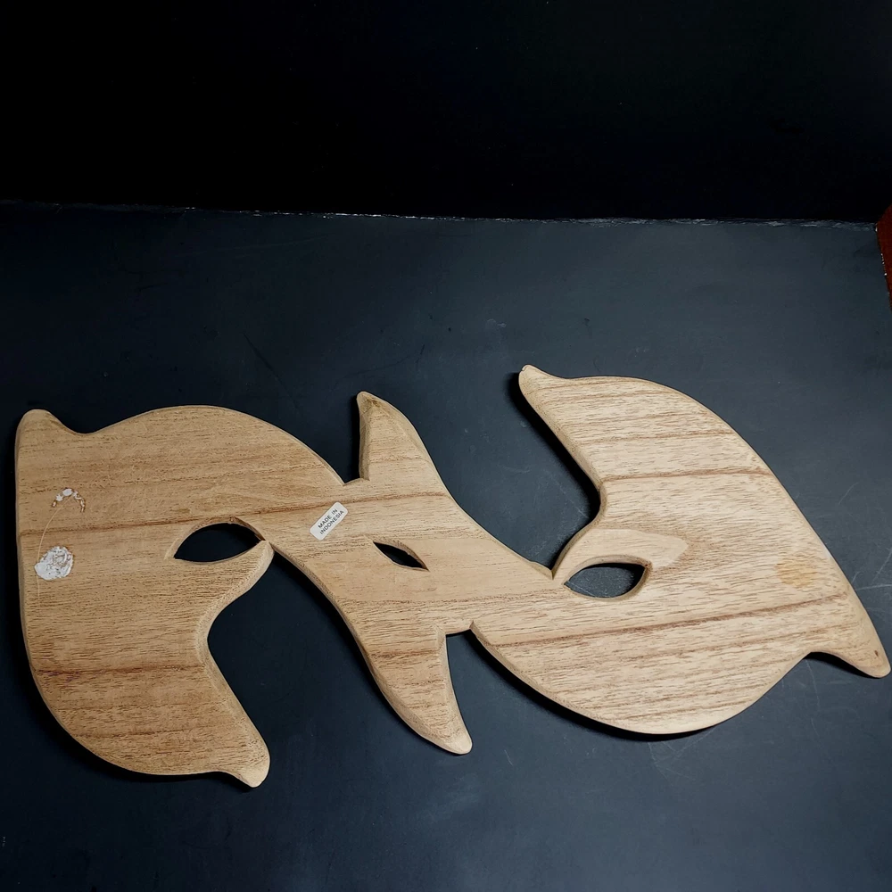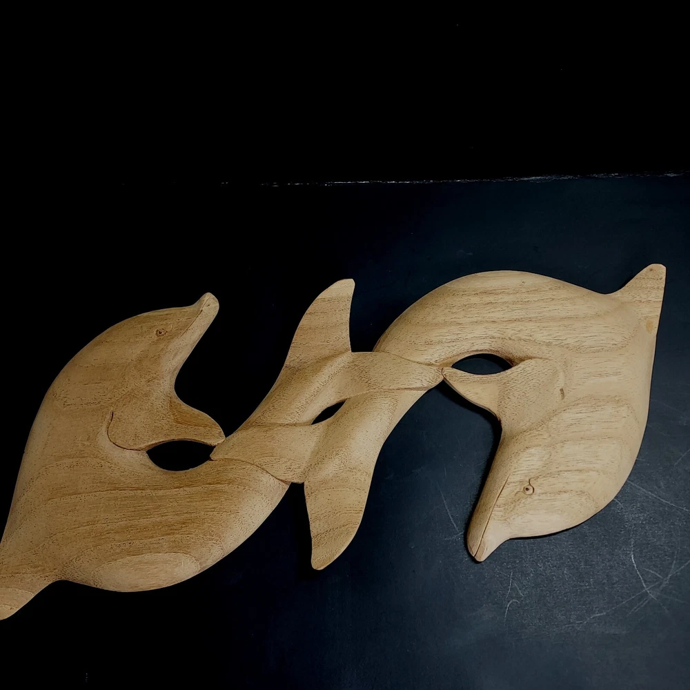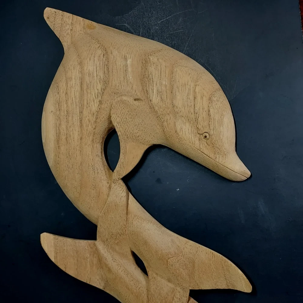 This handcrafted wooden dolphins placque is a must-have for any ocean or beach themed home decor. The dolphins are unfinished, giving you the freedom to paint, stain, or personalize them as you please. The placque measures 17" long, 8" at its widest point, 1½" thick, and weighs 10 oz unboxed. Made in Indonesia, it is a unique addition to any collection. Hang it on the wall, or display it on a mantle, bookshelf, or table to add a touch of beachy charm to your home. These wooden dolphins are perfect for those who want to bring the beach to their home.