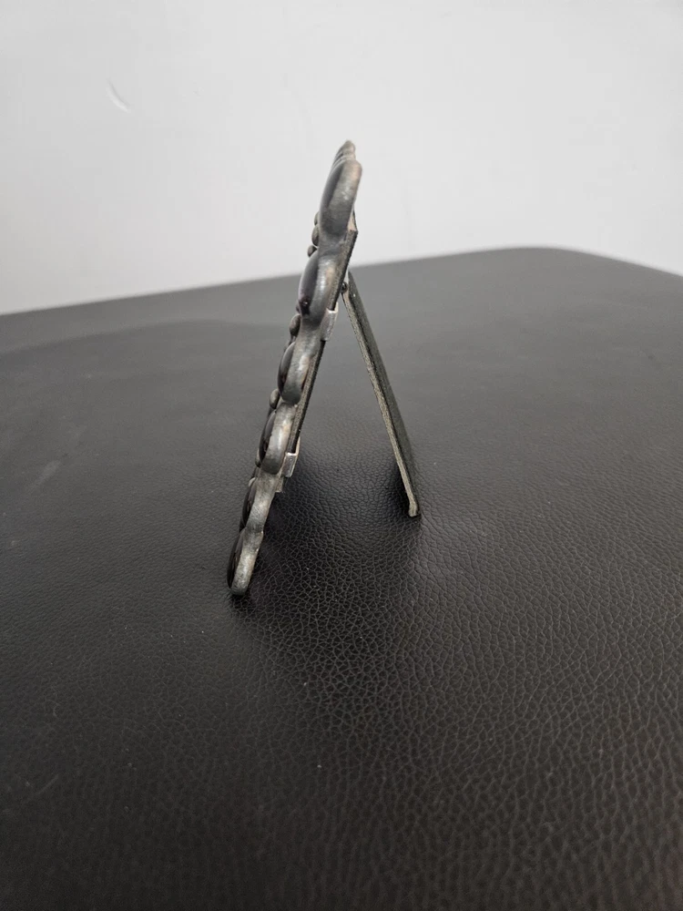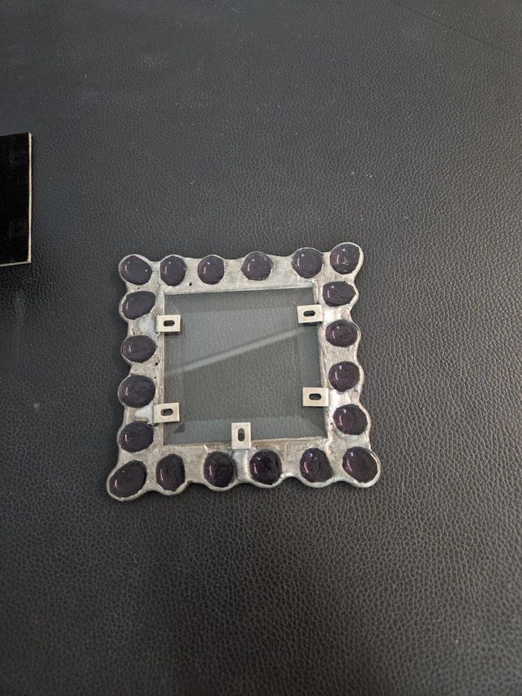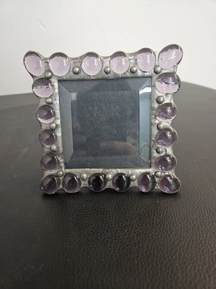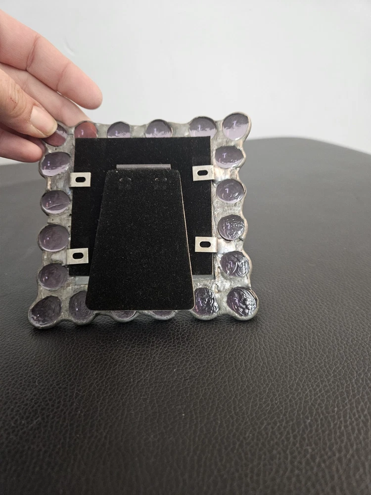 Vintage 1976 Hand Crafted Glass Picture Frame with a square shape, purple stained glass, and a size of 3x3 inches. The frame features fused leaded glass in a 1970s style, with a glossy finish. It is free-standing and can hold a single photo. The brand is Handcrafted and the frame is original from the 1970s.