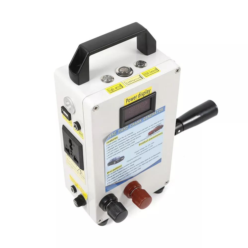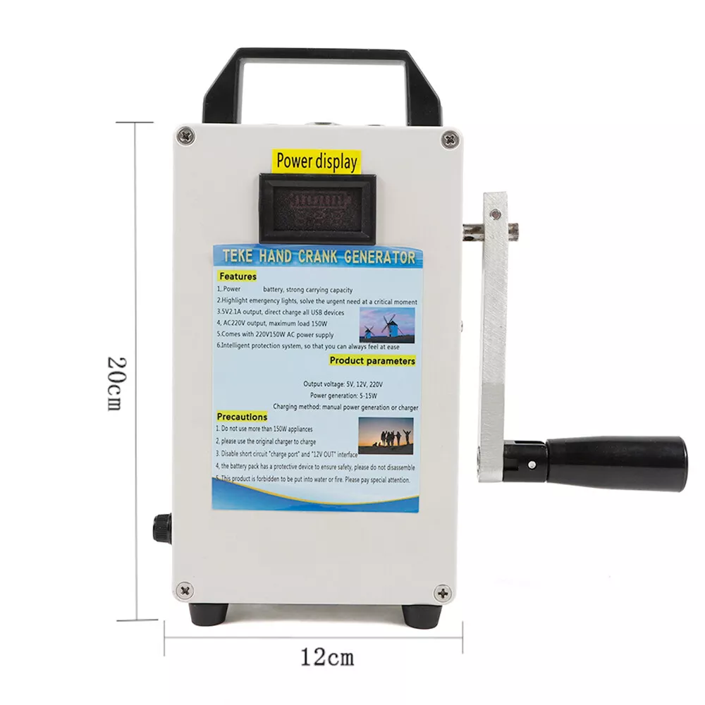 Hand Crank Generator Emergency Power Supply USB Charger Camping Outdoor Survival CE-WMTZXL-785 Hand Crank Generator phone Charger portable Portable Emergency power supply Application: Travel emergency power,Mobile phone charging,Laptop charging,lighting source,electric appliance of 150W,Base station emergency power supply,Outdoor small electric drill power supply Specifications: Item:Emergency hand generator Model: TK150W-C Input voltage: DC11-15V output voltage: USB---5V 2.1A; DC12V; AC110V(sinusoidal wave) Storage method:Municipal power storage (emergency); Hand-operated power generation and storage (15W)---Transmission motor for Speed is slow,The output current is up to 1A Solar energy storage Inverter power:150W Inverter features:Inverter efficiency: 95.4% Product size:200*120*60mm Product weight:1.35KG Hand-operated power generation and storage parameters: 80 round per minute---Motor speed 300 revolutions,output: 12.5V 8.75W 0.7A 90 round per minute---Motor speed 500 revolutions,output: 18.9V, 17.01W 0.9A 130 round per minute---Motor speed 1200 revolutions,output:24.8V ,29.76W 1.2A Features: When hand power is generated, the output indicator is bright, and both positive and negative Product configuration of the power display device can directly s ee the storage voltage and power The handle of the product is made of aluminum alloy, which can be folded and never rusted. Both the input port and the output port are international standard LED indicating lamp,Under - pressure, over pressure, over flow,Over temperature short circuit indication Note: This product is forbidden to be put into water or fire. Please pay special attention. The maximum output of AC220V can't exceed 150W. Packages: 1 x Hand Crank Generator CE-WMTZXL-786 Hand Crank Generator phone Charger portable Portable Emergency Power Supply Application : Travel emergency power , Mobile phone charging , Laptop charging , lighting source , electric appliance of 150W , Base station emergency power supply , Outdoor small electric drill power supply Specifications : Item : Emergency hand generator Input voltage: DC11-15V output voltage : USB---5V 2.1A; DC12V; AC110V(sinusoidal wave) Storage method : Municipal power storage (emergency); Hand-operated power generation and storage (15W)---Transmission motor for Speed is slow , The output current is up to 1A Solar energy storage Charging method: manual power generation or charger Inverter power : 150W Inverter features:Inverter efficiency: 95.4% Built-in insurance:15A×1 low air pressure alarm:10.5±1V Low pressure off:10.5V±1V Over voltage protection:15.6V±1V no-load consumption:12V no-load current :≤0.1A no-load power:<2W peak power : (150W) Product size:200*12*60mm Product weight:1.35KG Hand-operated power generation and storage parameters: 80 round per minute---Motor speed 300 revolutions , output : 12.5V 8.75W 0.7A 90 round per minute---Motor speed 500 revolutions , output : 18.9V , 17.01W 0.9A 130 round per minute---Motor speed 1200 revolutions , output : 24.8V ,29.76W 1.2A Features : When hand power is generated, the output indicator is bright, and both positive and negative Product configuration of the power display device can directly s ee the storage voltage and power The handle of the product is made of aluminum alloy, which can be folded and never rusted. Both the input port and the output port are international standard LED indicating lamp , Under-pressure, over pressure, over flow , Over temperature short circuit indication Super power, start the car instantly T he car is not connected to the battery, direct cold start, no less than 60 times Highlight the emergency light, solve the urgent need at the critical moment 5V , 2.1A output, directly charge all USB devices AC 11 0V output, maximum load 150W Hand crank power generation, power outage emergency is the most direct Note: Do not short the battery positive and negative poles Please use the original charger to charge The battery pack has a protective device to ensure safety, please do not disassemble This product is forbidden to be put into water or fire. Please pay special attention. The maximum output of AC220V can't exceed 150W. Packages: 1 x Hand Crank Generator Payment Delivery details Terms of sales About us Contact us Payment We accept ebay payment 。 Fees such as import duties, taxes are not included in the item price or shipping costs. These charges are the buyer's responsibility. Delivery details Shipping: 2-9 working days to: USA Terms of sales We maintain high standards of excellence and strive for hundred percent customer satisfaction. Feedback is very important to us. We hope that you contact us immediately before you give neutral or negative feedback, so that we can address your concerns. It is impossible to address issues if we do not know about them! About us Your satis faction is our ultimate goal. We work hard to earn your trust and future business. Our certified technicians have tested each item before shipping. The unit comes with 1 year limited warranty on all manufacturing defects. a) If you receive a defective item, you may return it or ask for a discount. Please contact us within 14 days after you receive the package. b) What you returned must be intact and in its original packaging as re? u. Customer is responsible for shipping costs of the returned item. c) We will cover the cost of shipping back t with the shipping rate indicated in the registration page. We will send you a new unit or refund the full payment you paid. Thank you. Contact us Business Hour Business Hour: Monday To Friday: 8:30 AM to 5:00 PM (Beijing China time) Due to time zones, our reply to your questions may not be immediately. But within above working time, we will reply your email within 24 hours. If it's non-workdays, please kindly be patient and wait till Monday. Please contact us with ebay message. Please feel free to contact us if you have any questions. Monday To Friday: 8:30 AM to 5:00 PM (Beijing China time) Due