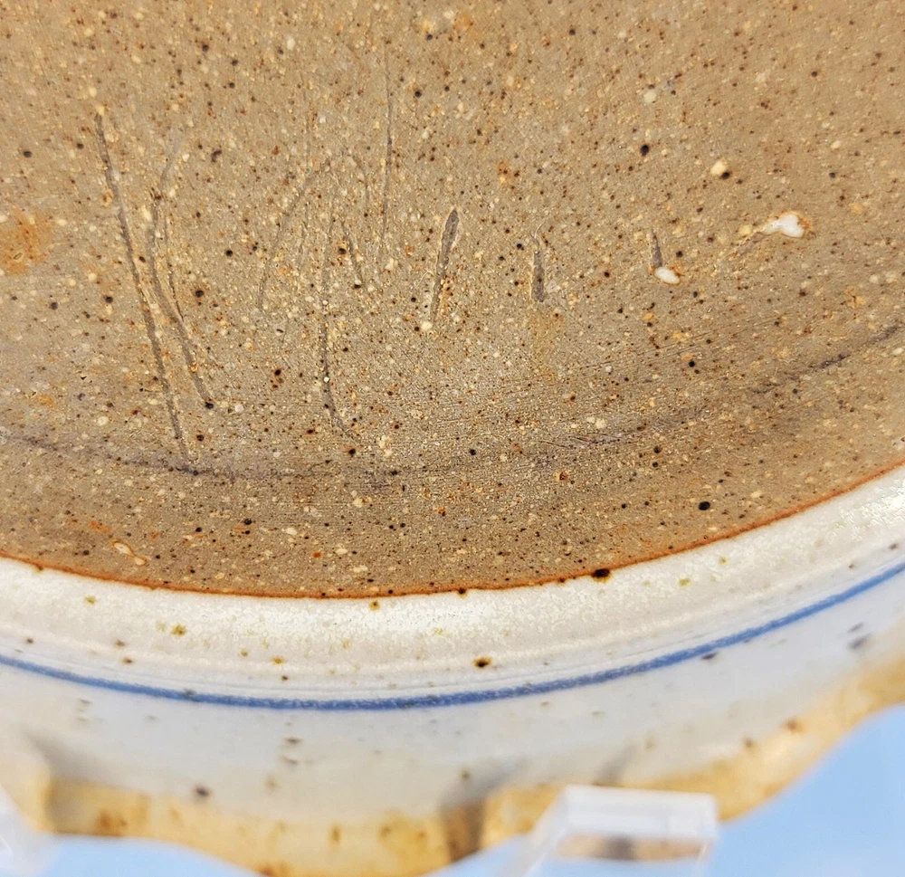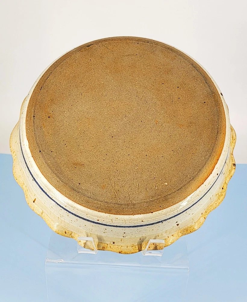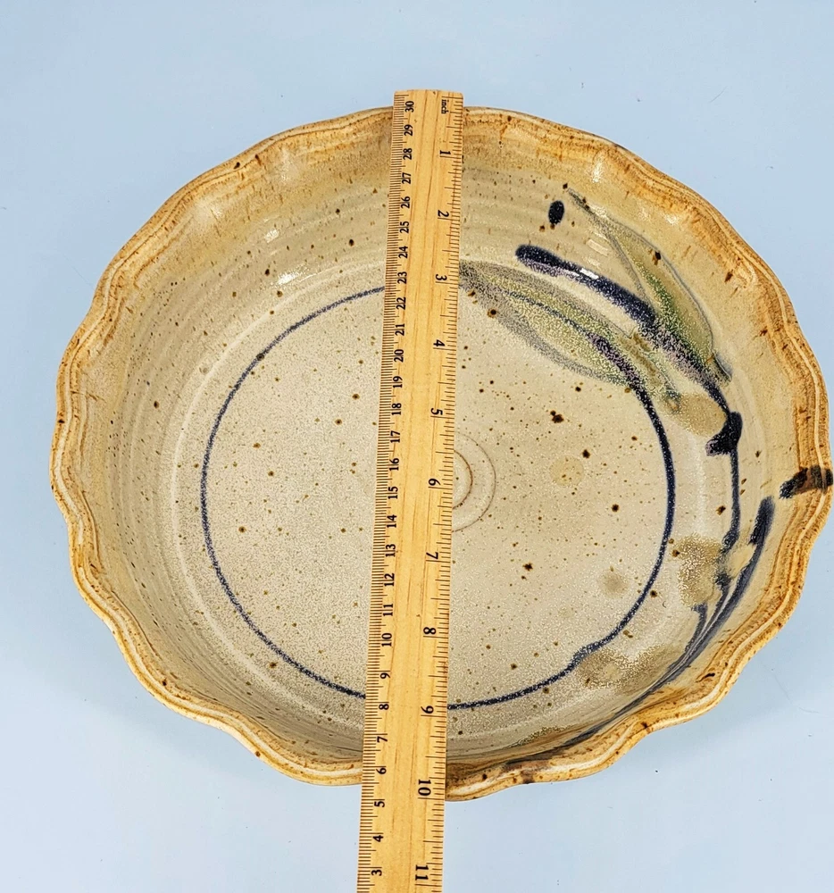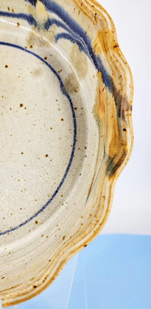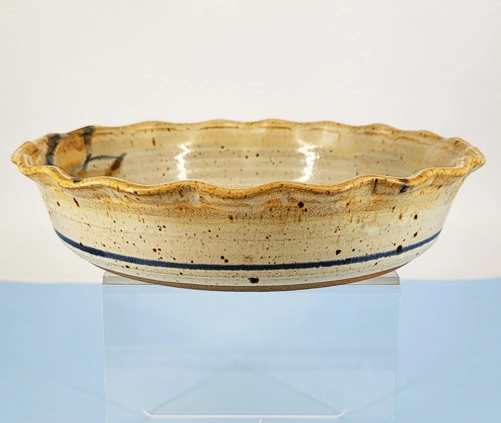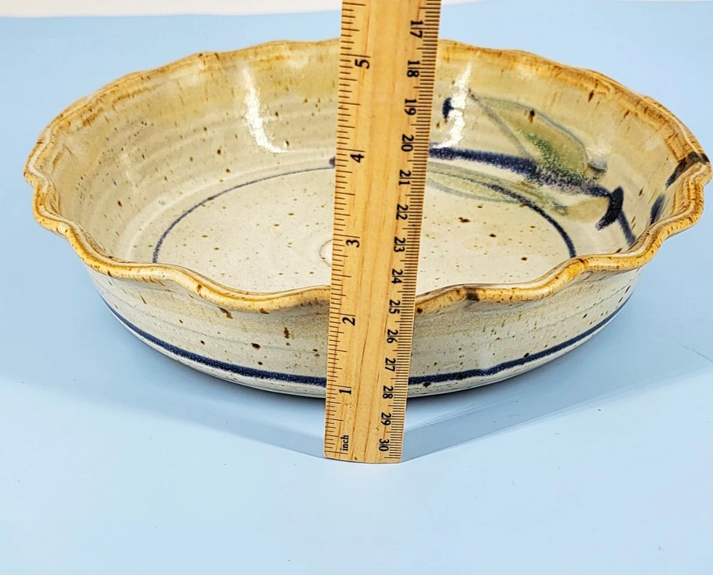 BRAND: This is a beautiful hand made studio pottery piece that appears to be new and unused. The bottom is artist signed however I can't confirm the name. It is an excellent serving piece and looks to be the work of a master potter. COLORWAY" Off White (Natural), Gold, Navy Blue, Celadon Green, Brpwn. SIZE: Approximately 10" Wide and 2.25" Tall. CONDITION: This unique piece of studio pottery is expertly done. The painting in the inside rim of the dish is a stylized stem with leaves and flower buds or berries. It curves around the dish and draws the eye to the spiral swirl in the middle of the piece. It is flecked with brown paint and embellished with gold paint along the ruffled edge. It is a perfect Country or Farm House decor or kitchen piece. Whether you choose to use it for pies or simply displays it for beauty in your home it is certainly a quality addition. There are no signs of chips, cracks, or crazing, looks to be unused. Please see my photos for exact detail.
