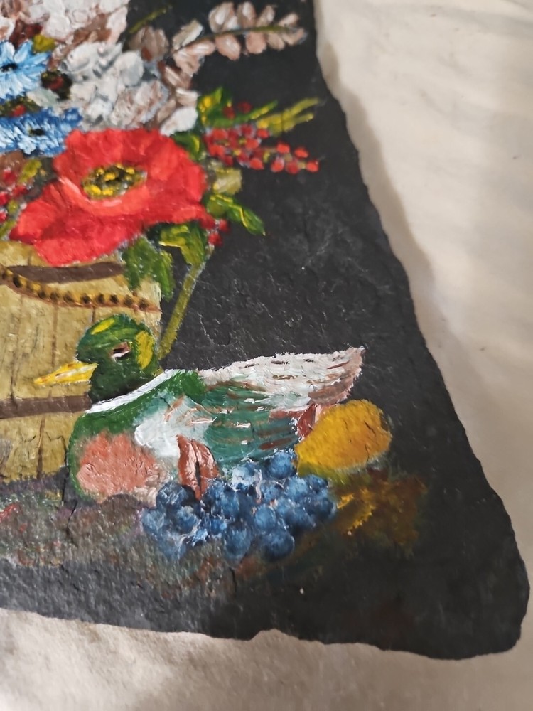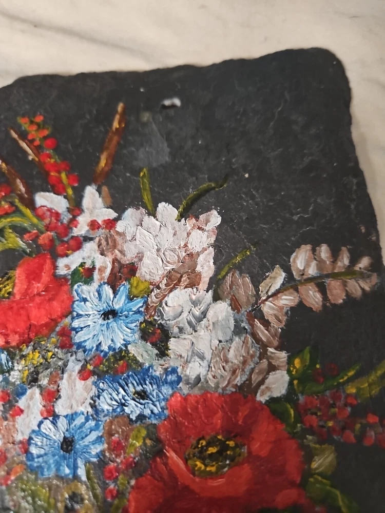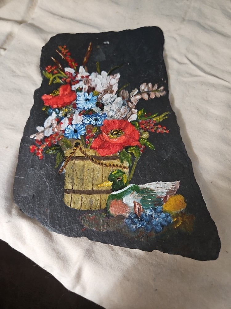 Decorative Hand Painted Small Slate Floral Trivet or wall hanging Vintage **Pre-Owned **Vintage **Type: Decorative Trivet **Design: Flowers **Hand Painted **Measurements: 8.5” Height…6” Length **THIS IS A HAND PAINTED VINTAGE PRE-OWNED SMALL SLATE TRIVET IN GOOD CONDITION…GENTLY USED**